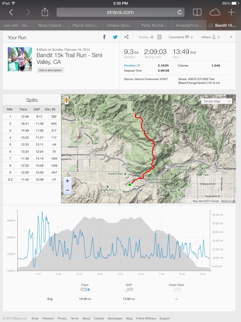 Stats: 15k (9.3) miles, 2,162 ft of climbing, 2:09:03. by Garmin.