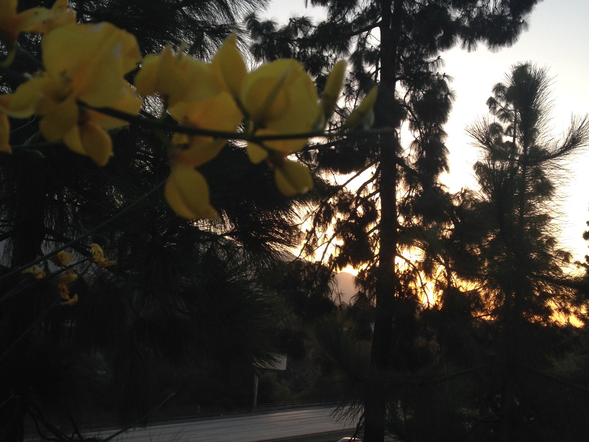 Sunrise through the pine trees and wild flowers, just above the freeway.