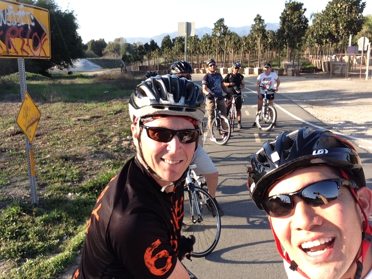 Eight friends from work rode on the river trails. Different speeds. Different bikes. But a beautiful day to ride.