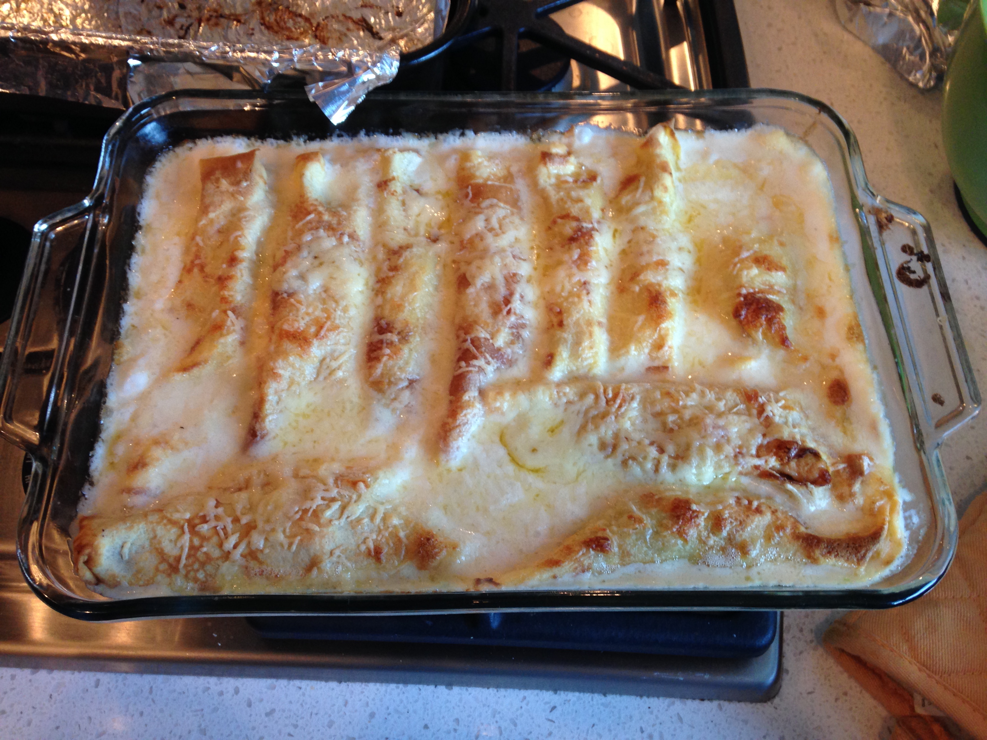 Insert the filling, then pour more cream sauce over top with more Gruyere cheese. Bake and melt.