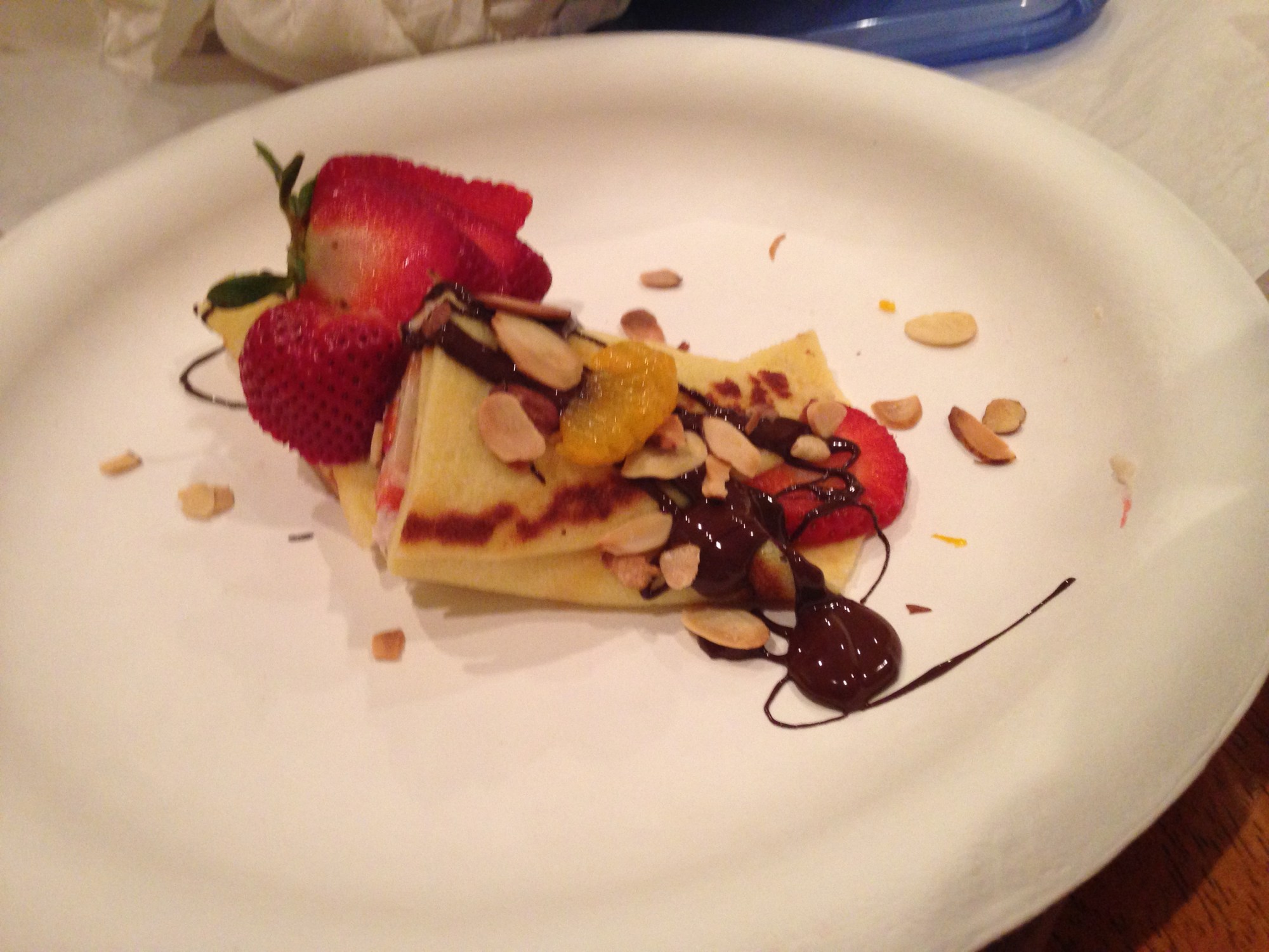 Drizzled with dark chocolate. Garnished with fresh strawberries, mandarin oranges, toasted almonds.