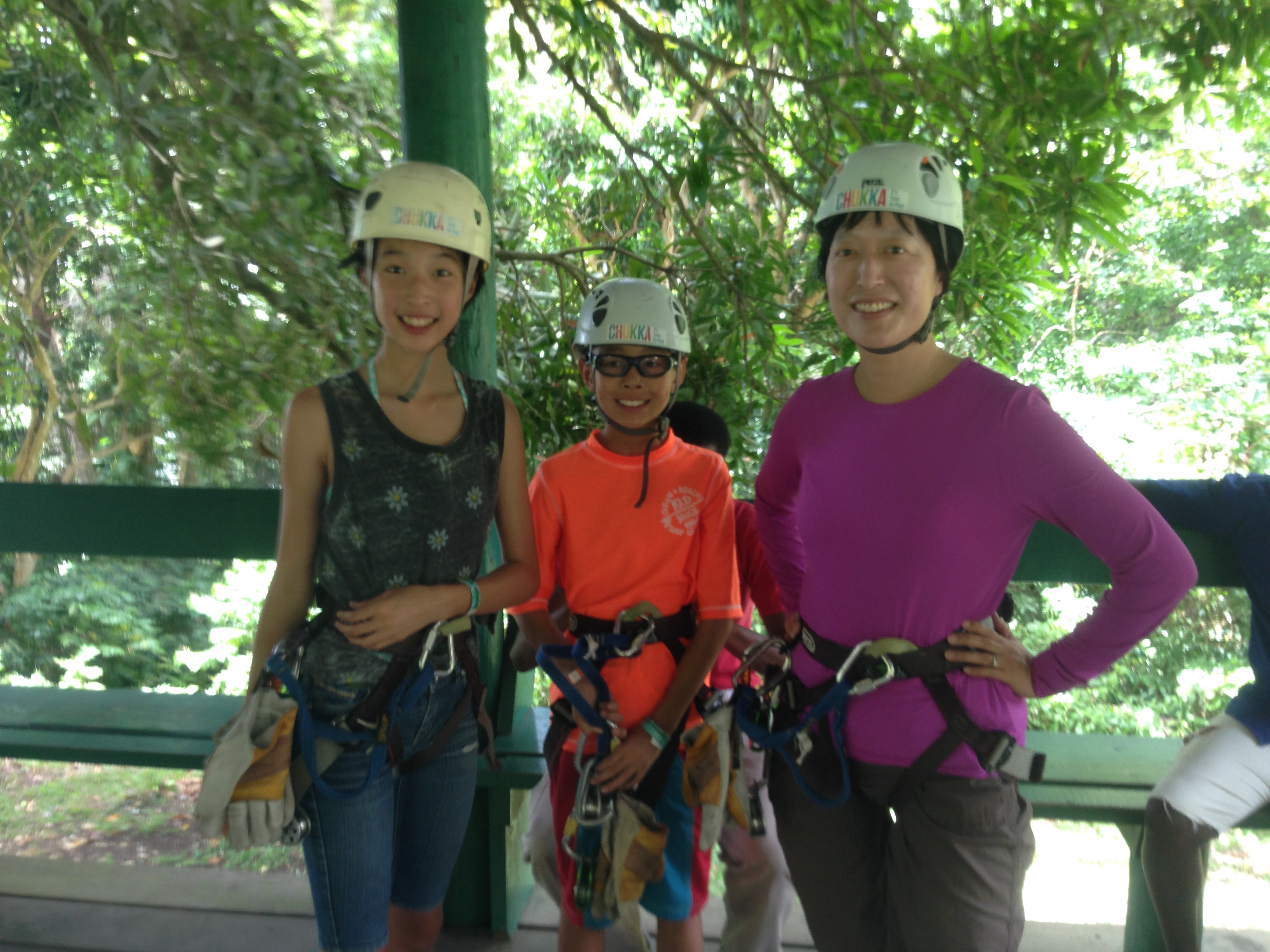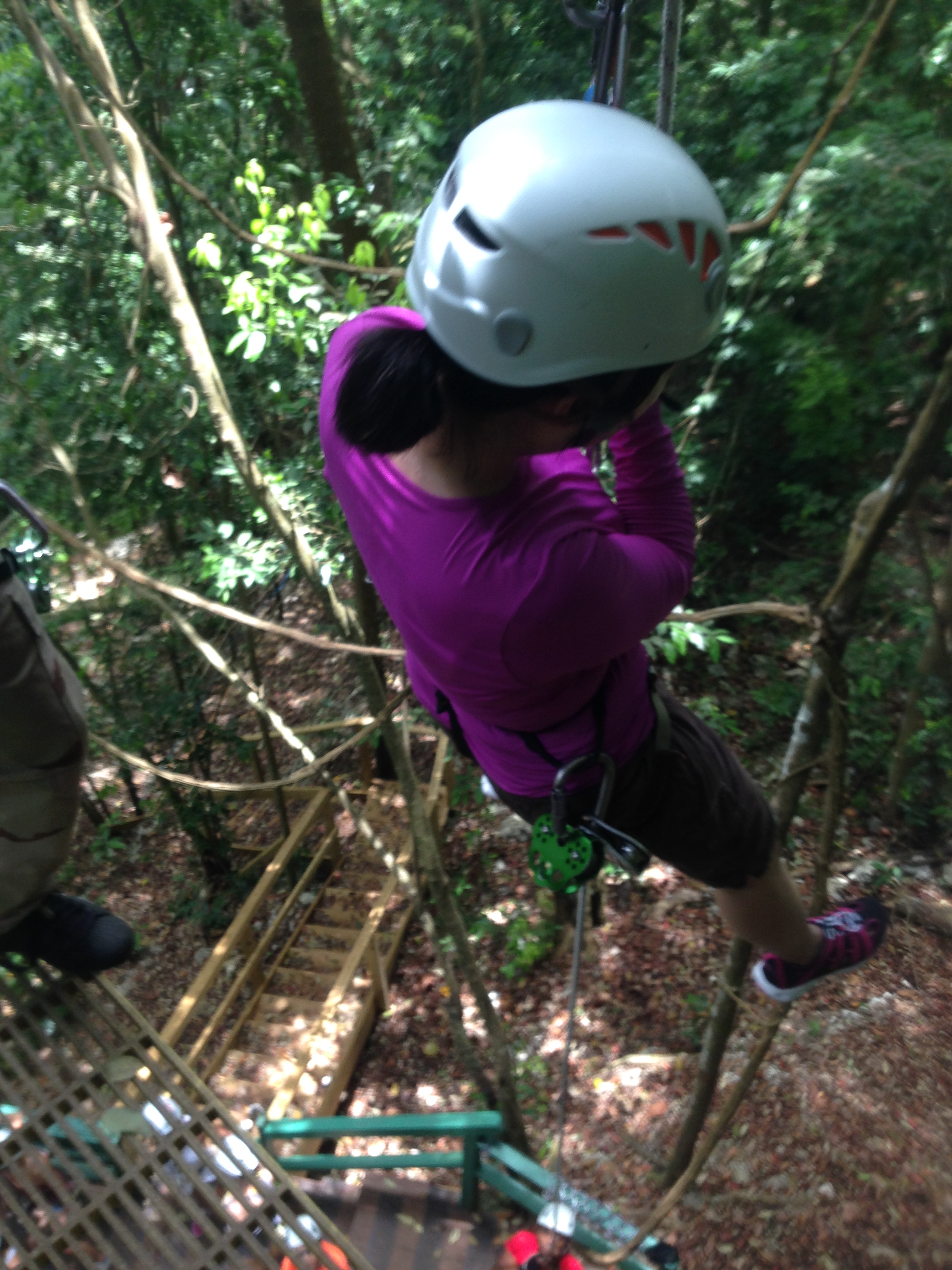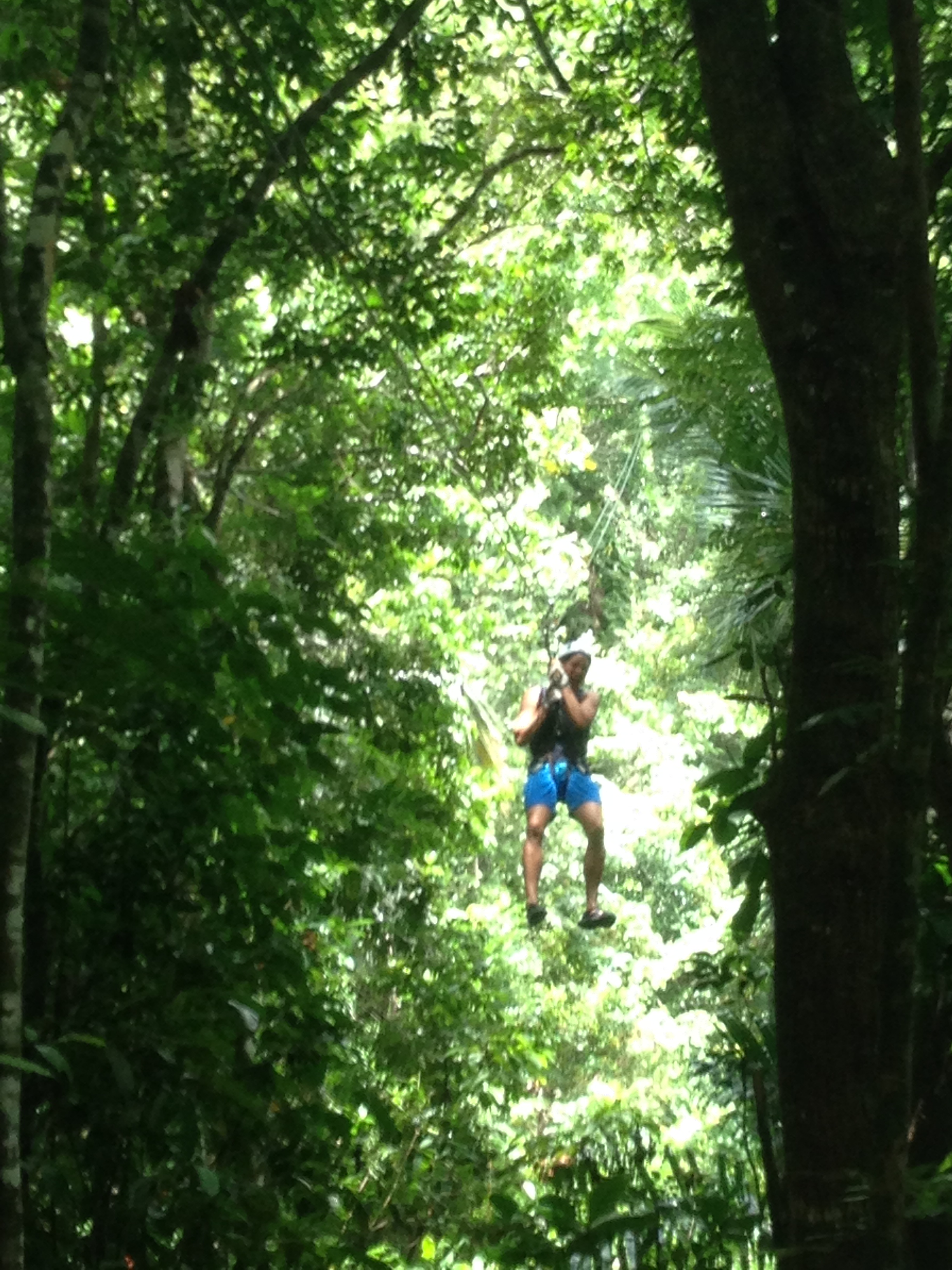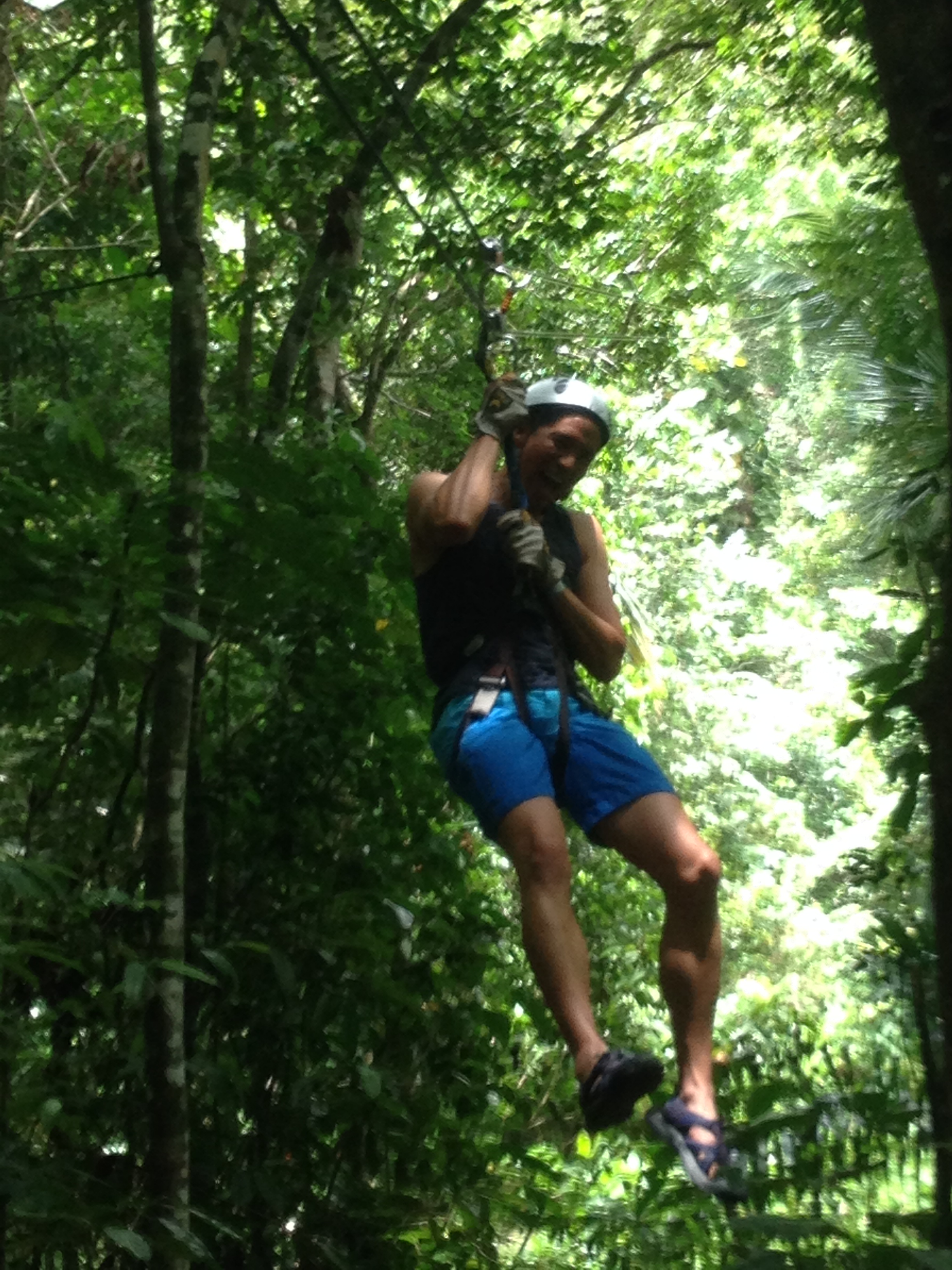 We landed at the Chukka grounds. We gathered our gear and climbed into a 4-wheel drive open bus and ride up the steep bumpy gravel road to the top of the mountain. We hopped out and put on the zip gear. Short safety speech. Then a long hike down hill along a steep trail. My knee was still tender and awkward on the hike it was very pretty walking through the jungle. They crushed a leaf and smelled it really refreshing and aromatic. I guessed it was melaleuca, but they never said. They guides were funny playful young men. They kept calling me Jackie Chan and they called Irene Mrs. Chan. So, I called them OJ. We there in line with another couple. The gent was a little round and wearing a blue t-shirt, so they called him Papa Smurf. The zip lines were shady and jungley and over a rushing river. Terrifying for me, I’m scared of heights. I screamed a lot. Kids had a blast. At one platform we had the repel down about 30 feet. The guides did everything for you. Just had to jump off and pray they did it right and didn’t break your legs. I think there about 10 zips.
