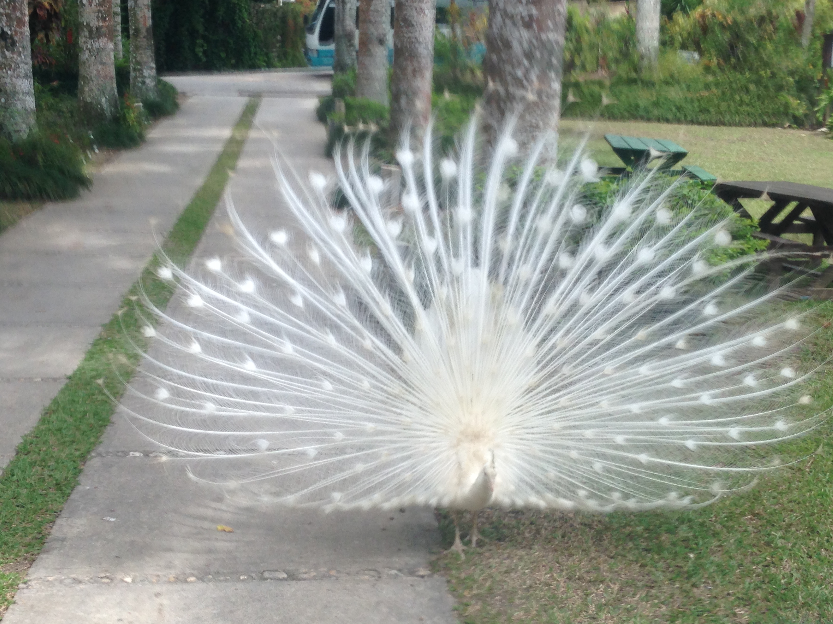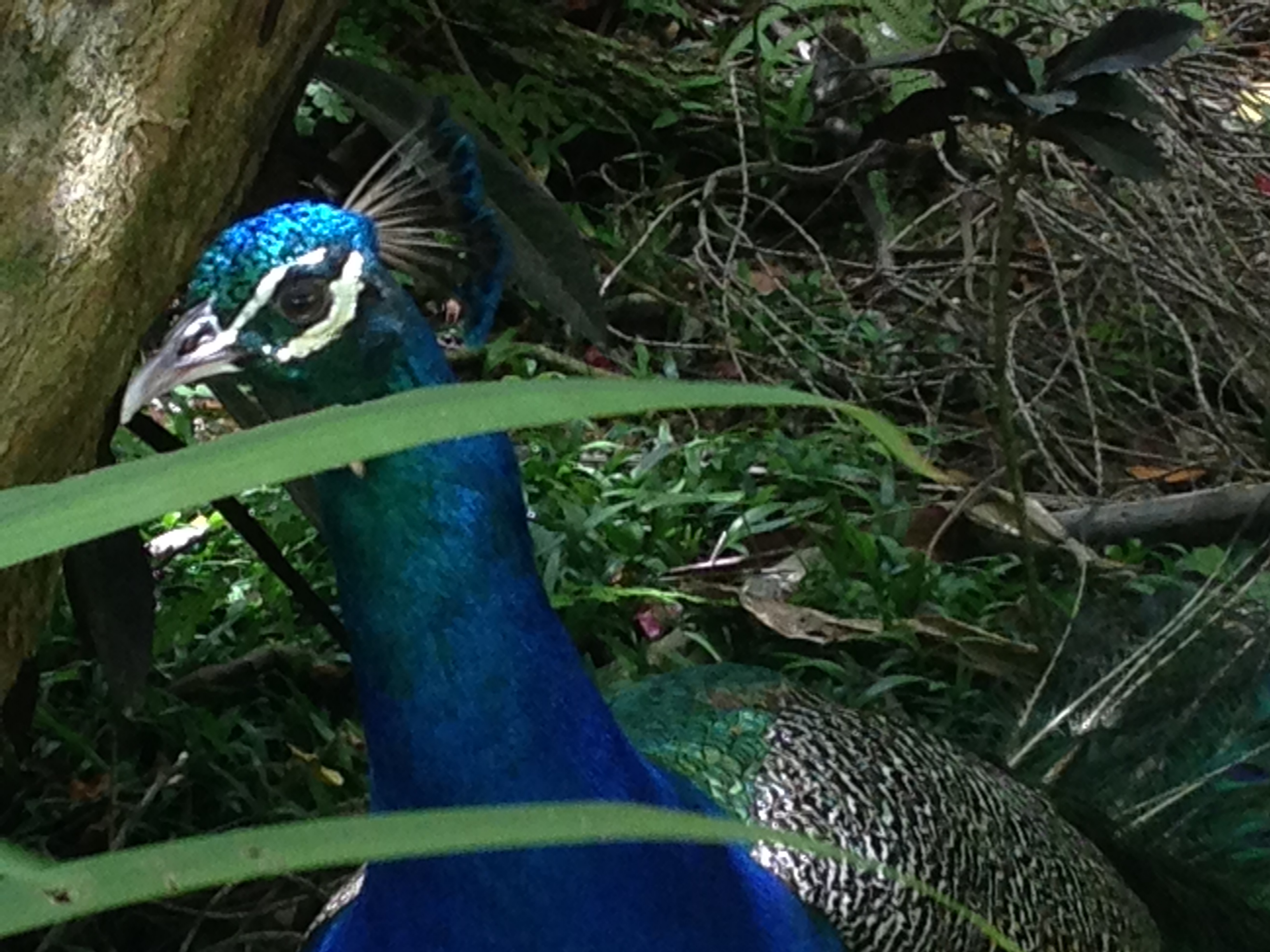 After the last zip there was another long hike through the jungle along the river back the main grounds. Lunch was jerk chicken, rice and beans, salad. Ok. Spicy sauce was really spicy. There were peacock friends roaming around. One albino peacock unfurled all the feathers it was awesome.