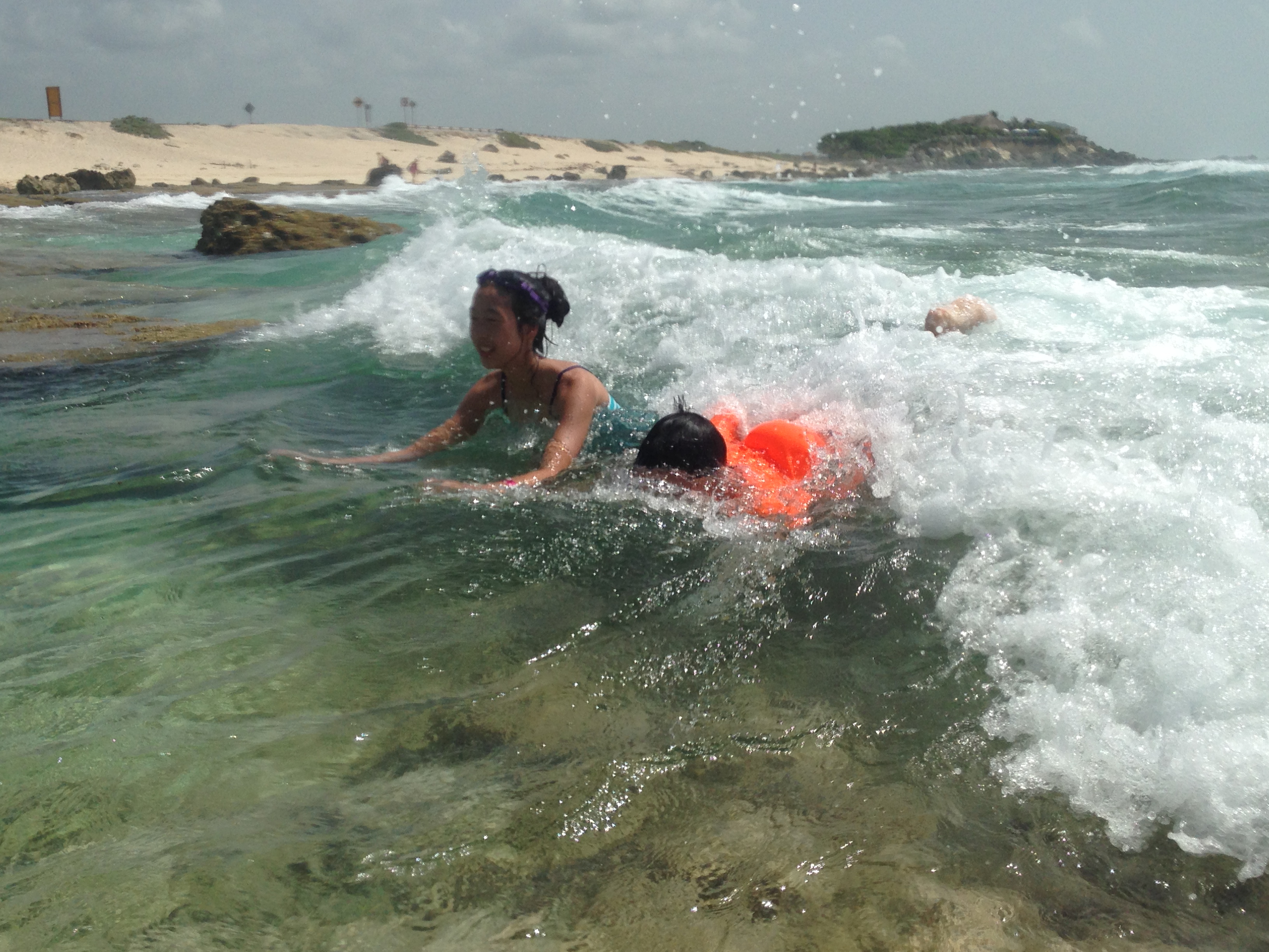 Bus ride to private beach El Pescador. Fish and beef tacos. Swimming. Rocks. Crabs, sea urchins, stripe fish. Swim around with fish. Mommy swam too. Shuffleboard. Kids Bought candy.