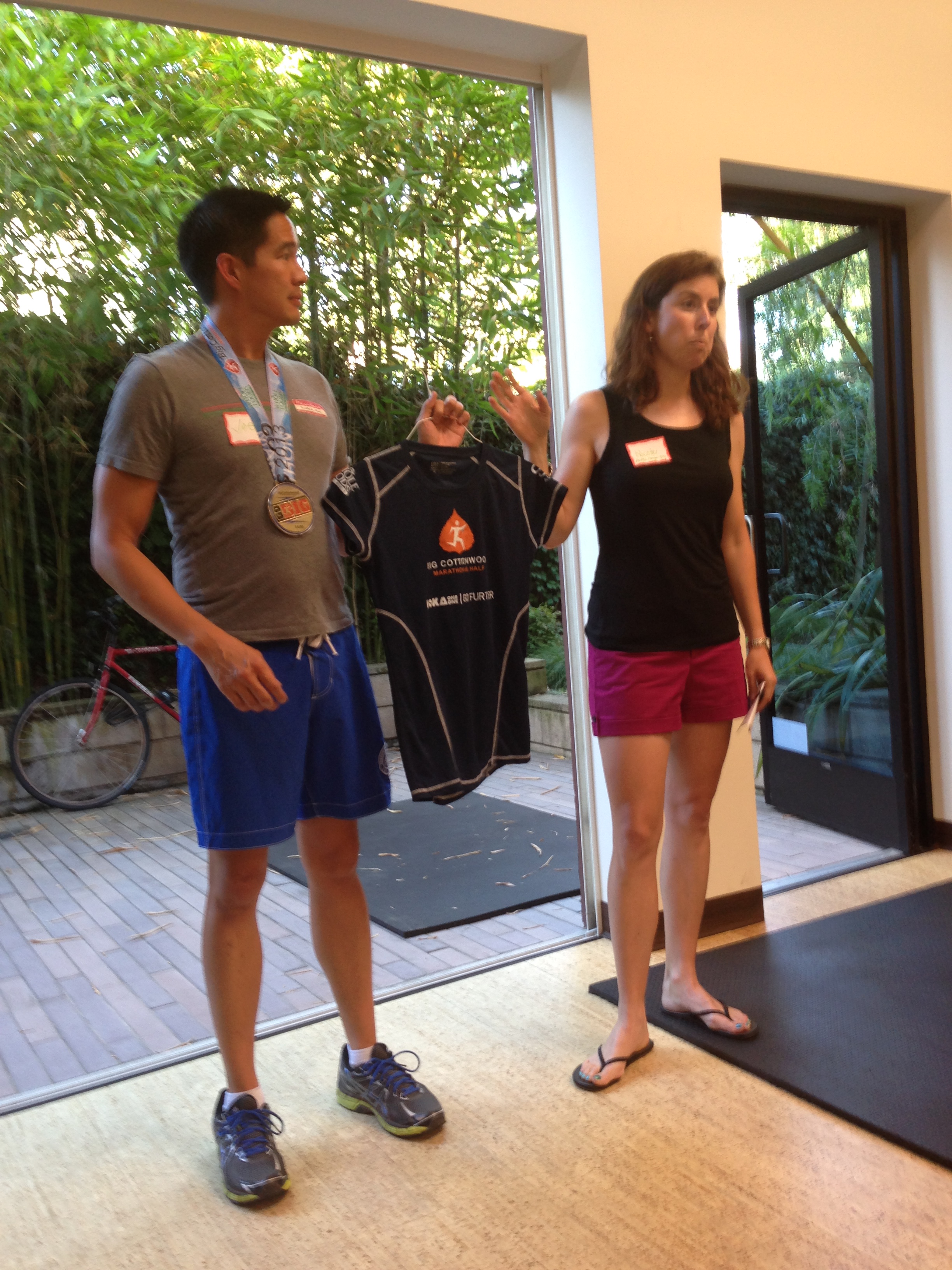Maria from Run with Us. Promoting PTC exclusive shopping night. 7/9, 7pm, 20% off. Raffle winner Lisabeth won a free pair of shoes!