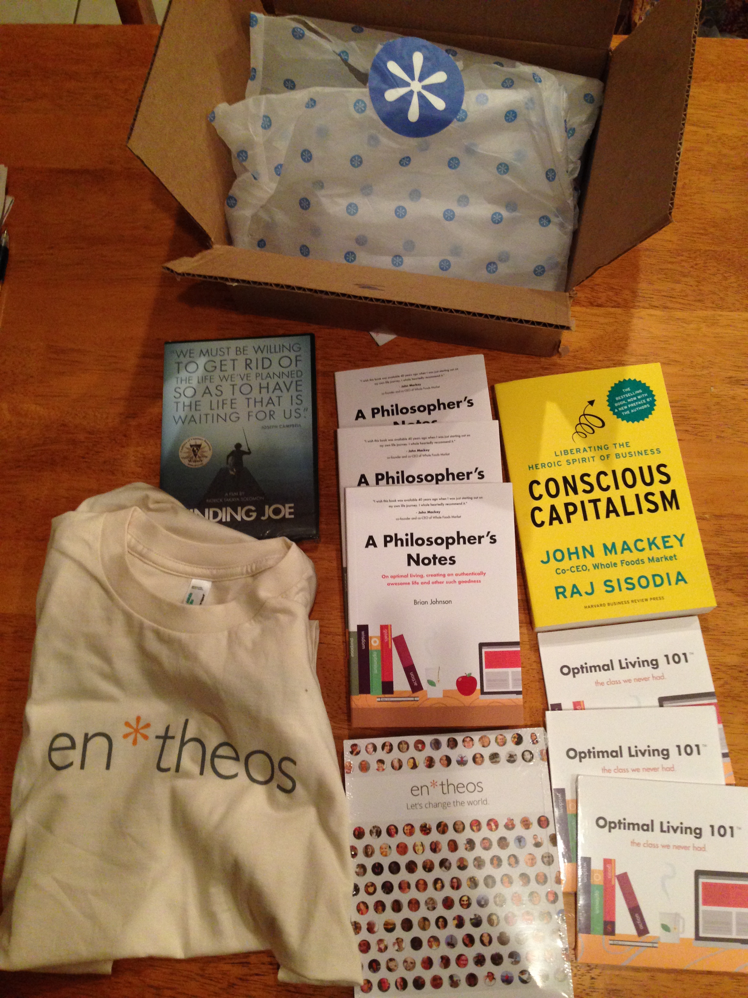 I found this hangout by the Unique Genius Super Heroes Program by Aaron Ross. Aaron interviews his buddies that inspire him, one of the buddies is Brian Johnson, who founded en*theos. I bought his Philosophers Notes. They notes are awesome. The book is like Cliff Notes with Brian’s take on them. Following Brian’s projects, I found his online playground call en*theos. I hang out there online for positive inspiration. Think of facebook, without the whining. only positive people and high enthusiasm for living. It’s really different. I signed up to be an Ambassador for the project. I got a goodie box last night in the mail with books, videos, postcards, T-shirt. It’s awesome. I like en*theos because the community is very encouraging. I am making friends with happiness in common.