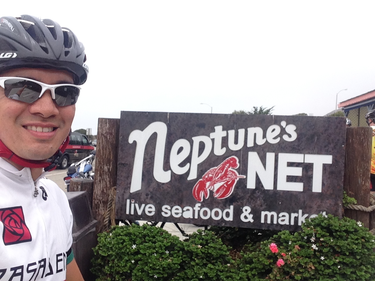 We headed north on PCH. Took a right and went Up Up UP Encinal. Then down, then Up Up Up Encinal some more. Left (more like U-turn) at Mulholland. Rode Mulholland across and down back to PCH. This is one of my favorite descents. Lynda, Steve, Gregg stopped and played with the camel. We rode north on PCH a little to Neptune’s Nest, which had water and restrooms. I used both. We rolled across the street and watched the surfers. Waves were pretty flat, I thought. Rode back along PCH. Lots of fast traffic, but there is a wide shoulder.