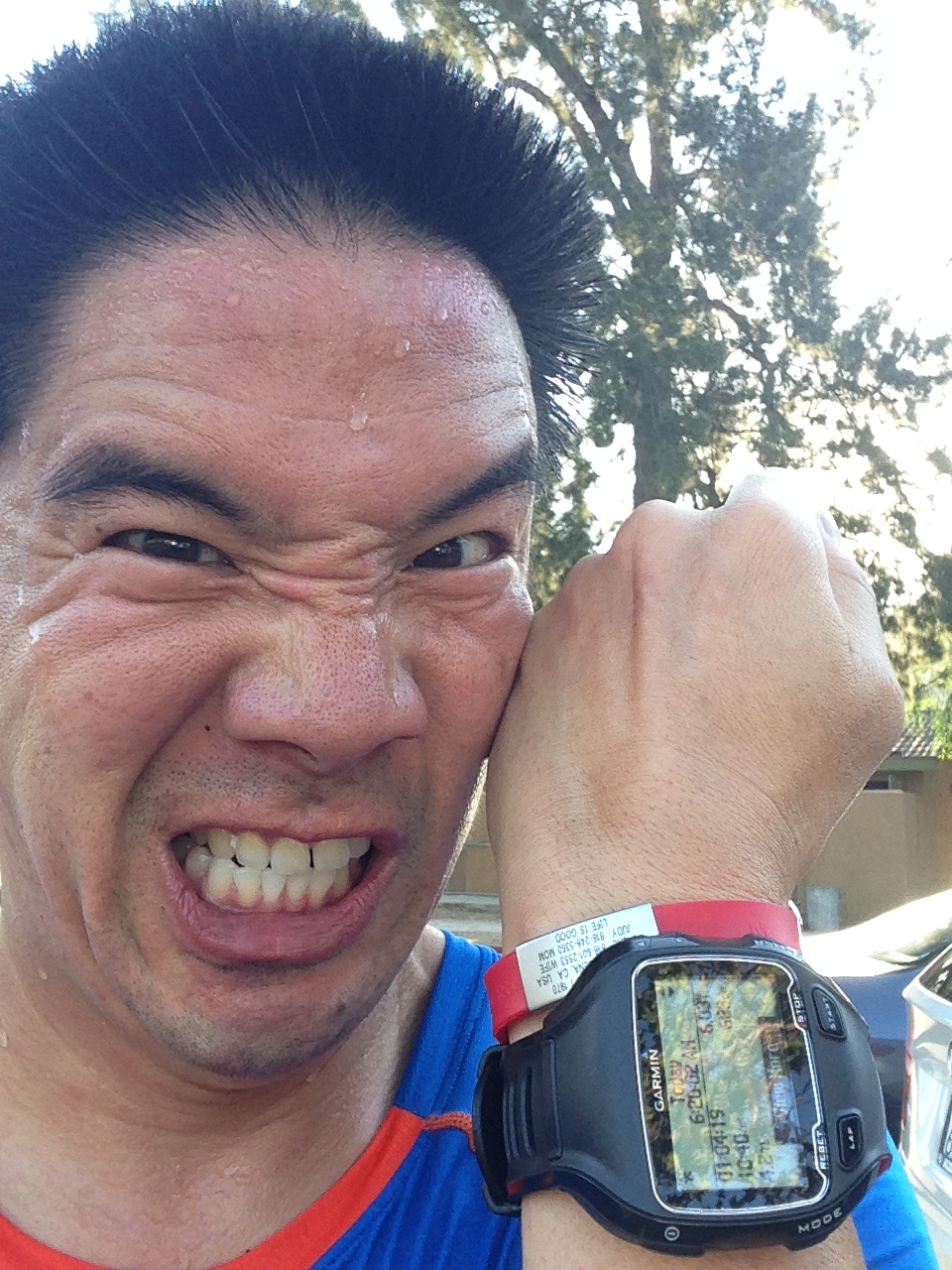 Mile 1 and 2 were labored, tough miles. Maybe I should eat a lighter breakfast for shorter runs. Miles 5 and 6 were much much better. 4 Strava trophies, on random segments around the top of the rocky trail. I love the trails. I left my phone in the car. So, no pretty pictures today. Just the end.
