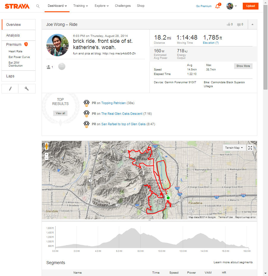 18.2 miles, 1:14:48 moving time, 1,785 ft elevation. 18 Strava trophies