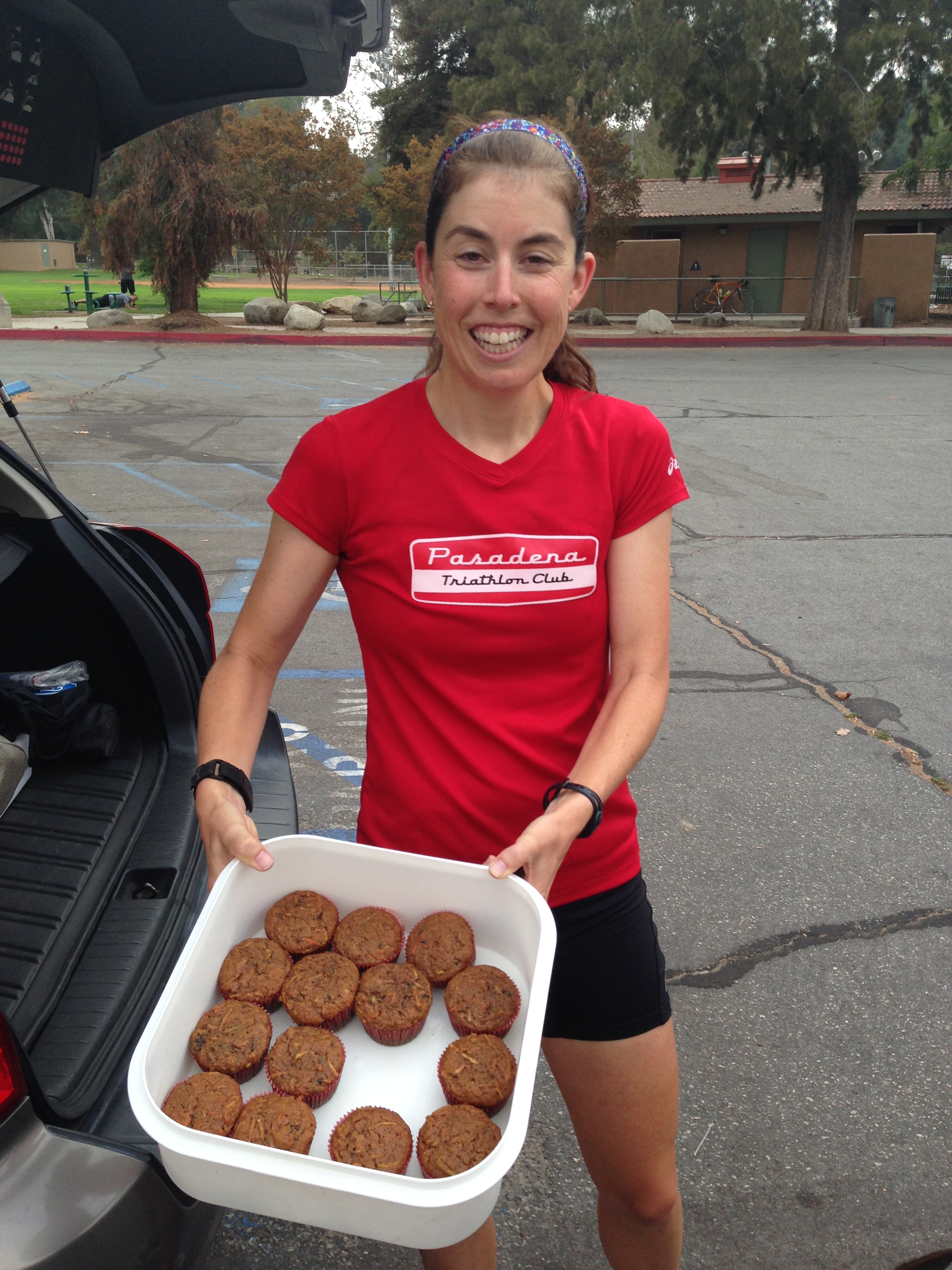 Nicole led us up along the east side of the Rose Bowl and Brookside Golf Course. We saw an urban coyote on the golf course. He cast a wary eye at Seamus. We joined the trail up to Devils Gate Dam and to the water fountain. We all had a sip of water and flipped it. We crossed the dry creek bed and rolled along the west side of the golf course. That’s one of my favorite hidden treasures. Nicole made yummy muffins, special healthy type with carrots, apples, raisin. and… the prize patrol was handing out socks.