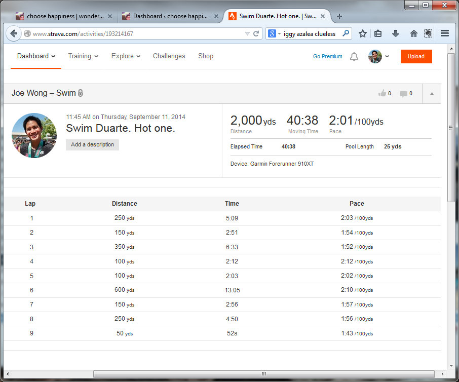 September 11, 2014September 11, 2014 Lunch Swim in the Sun 2,000 yds, 40:38 moving time. I got to swim at lunch time at Duarte Pool. I got my own lane. Awesome. It was a warm one today. High 80s now. It will top out at 100F later today. Share this: Click to email a link to a friend (Opens in new window) Email Click to share on X (Opens in new window) X Click to share on Facebook (Opens in new window) Facebook Click to print (Opens in new window) Print Like Loading... Related
