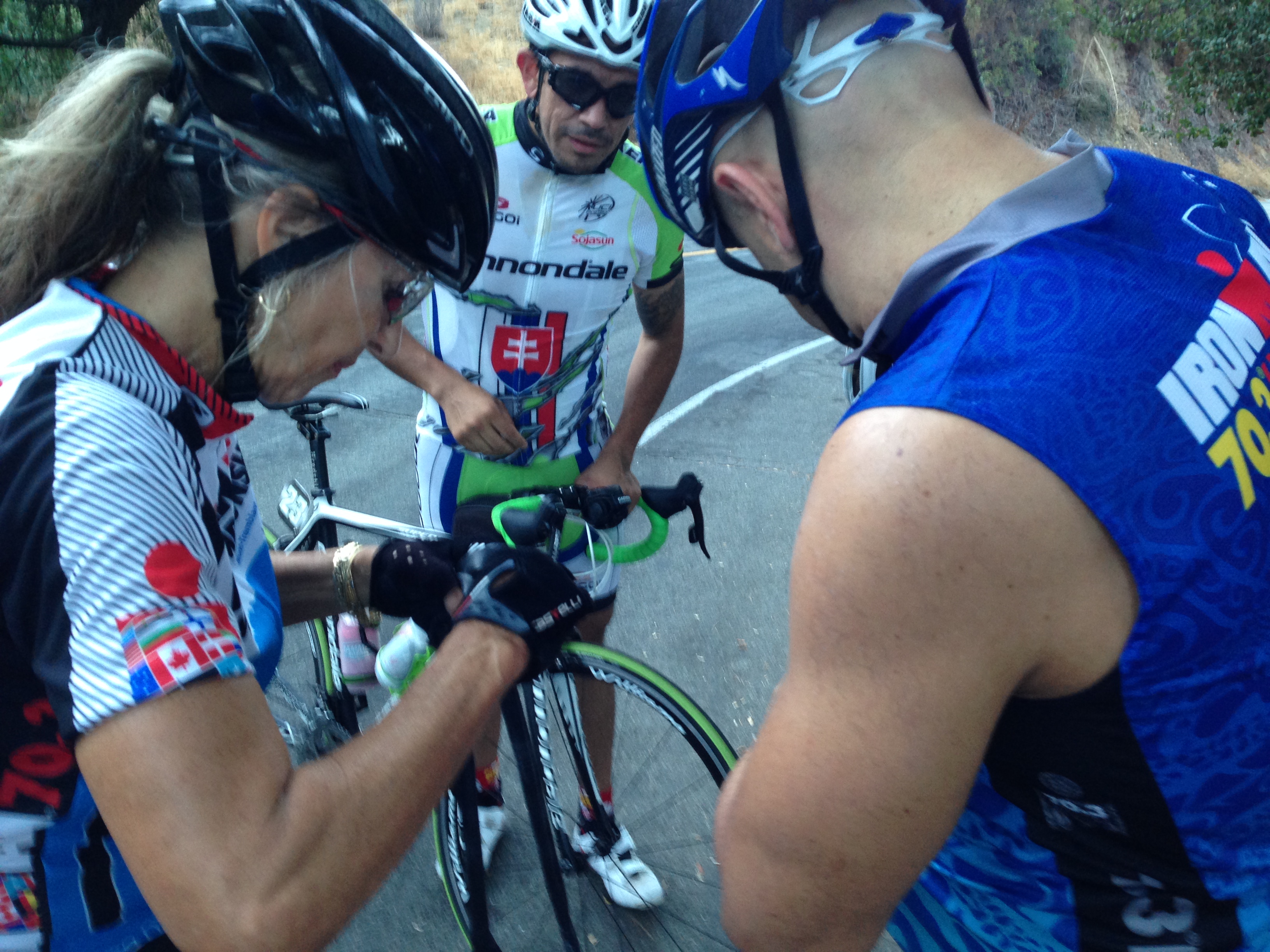 Seb got a flat. Bryan gave him a stem extender and Lynda gave him some advice.