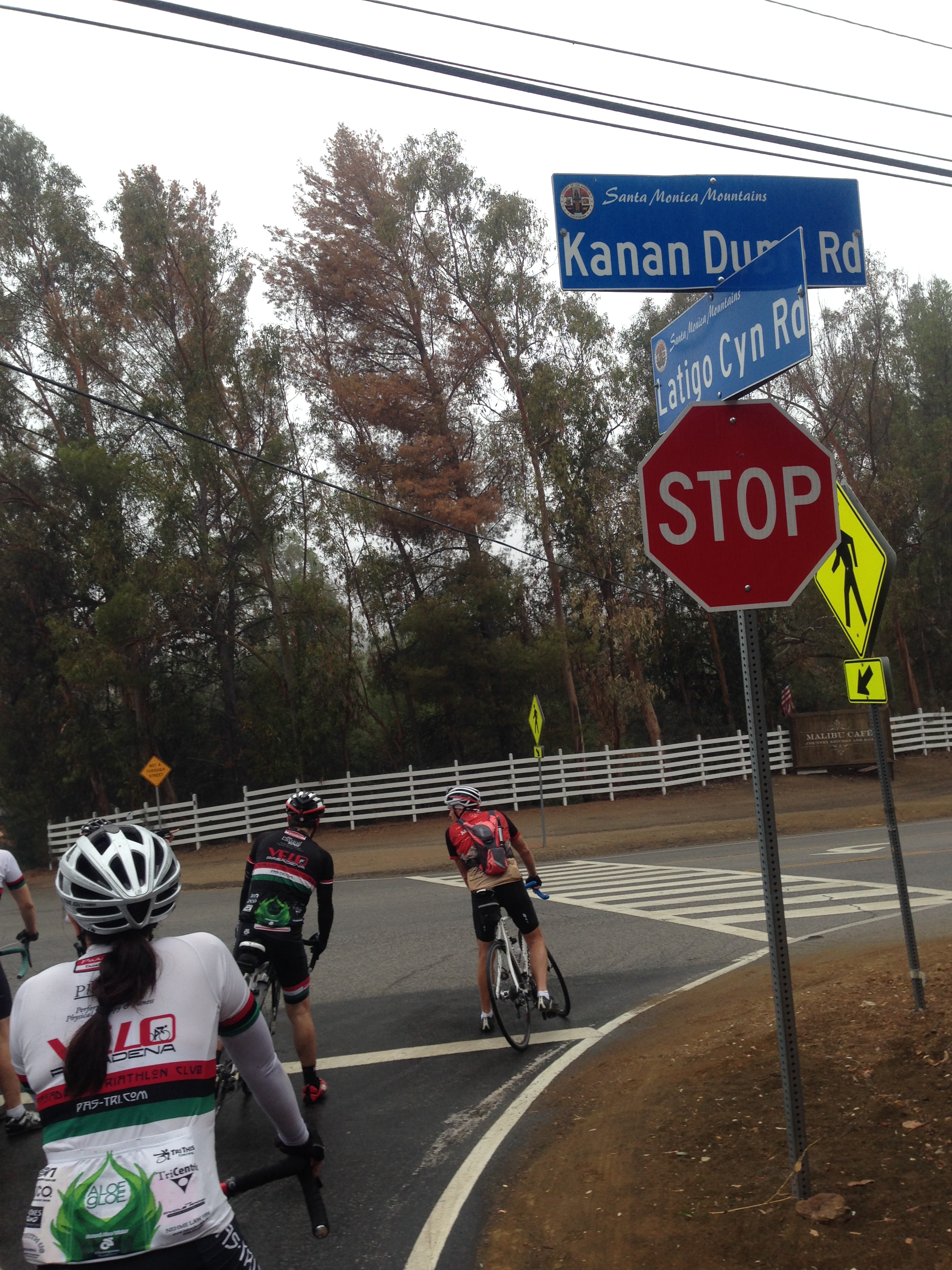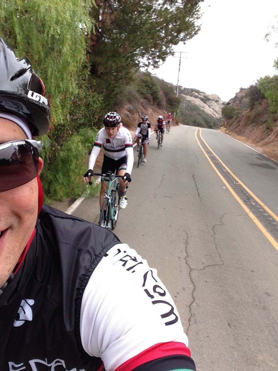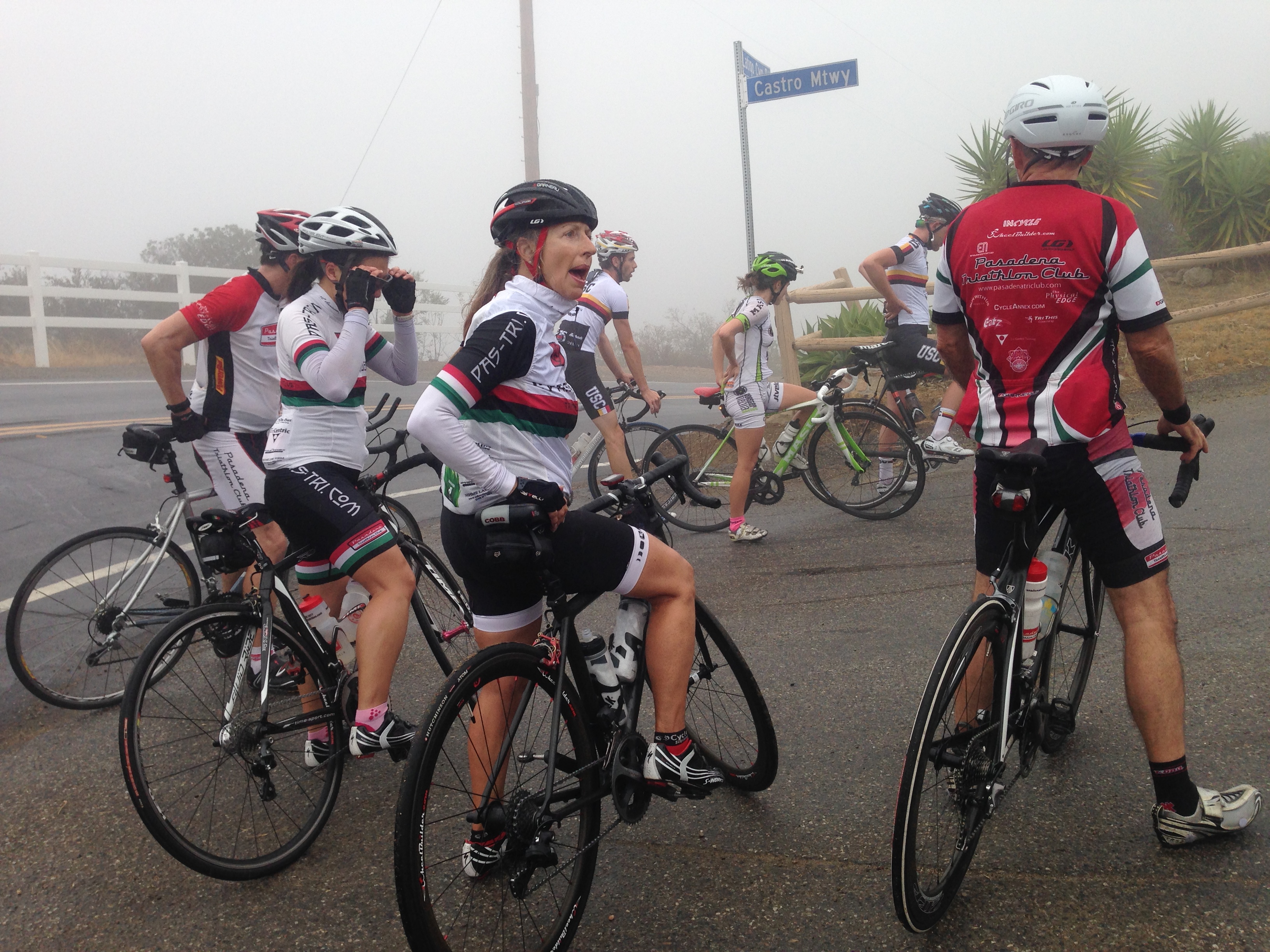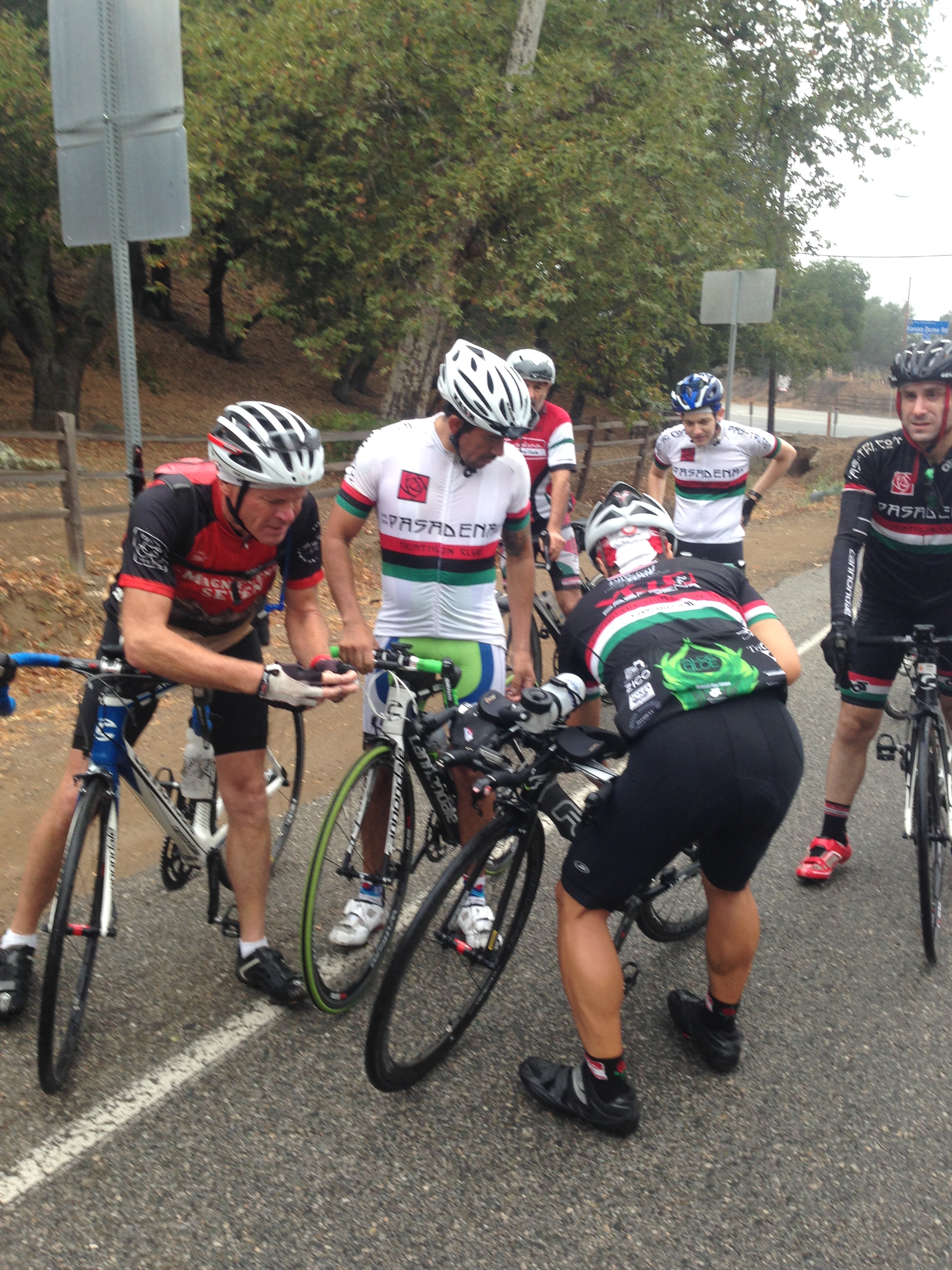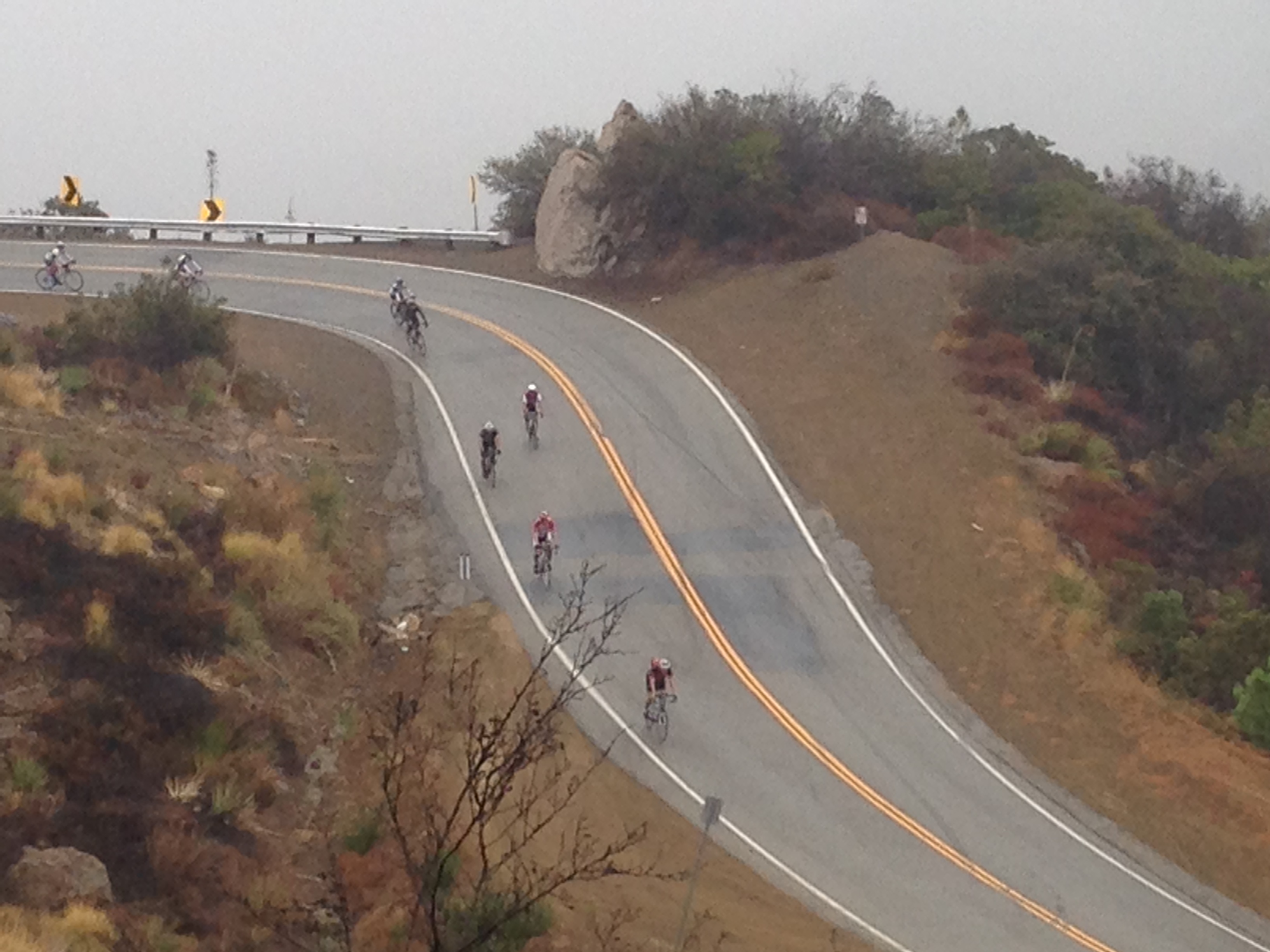 We started at Park across Pacific Coast Highway from Pepperdine University. Riding northbound, we climbed up Latigo Canyon, which is 6-8% steep and 7 miles long. The weather was cloudy. Could be cold, could be misty, could rain! We found out that it would be all of the above. Luckily I had my new PTC vest to keep me dry. The mist turned to drizzle turned to rain. We were pretty soaked by the top of Latigo. Rock Store descent was very wet. We took if slow. It’s one of my favorite descents. No pics cuz it was scary wet. Alvin had a mechanical with his shifters. We rode along Mulholland over to Stunt Canyon. Stunt is a shorter but steep climb, 3 miles, 8%. Fogged in at the top. Short descent and then climbing up Piuma, steep but short. Piuma descent is a 4 mile great descent. Ground was dry. That was good. On one of the hairpin turns Kirk went down and over a guard rail. He’s a tough cookie though. He got up and rode it out. He took quite a thumper on the chest, with the guardrail post.