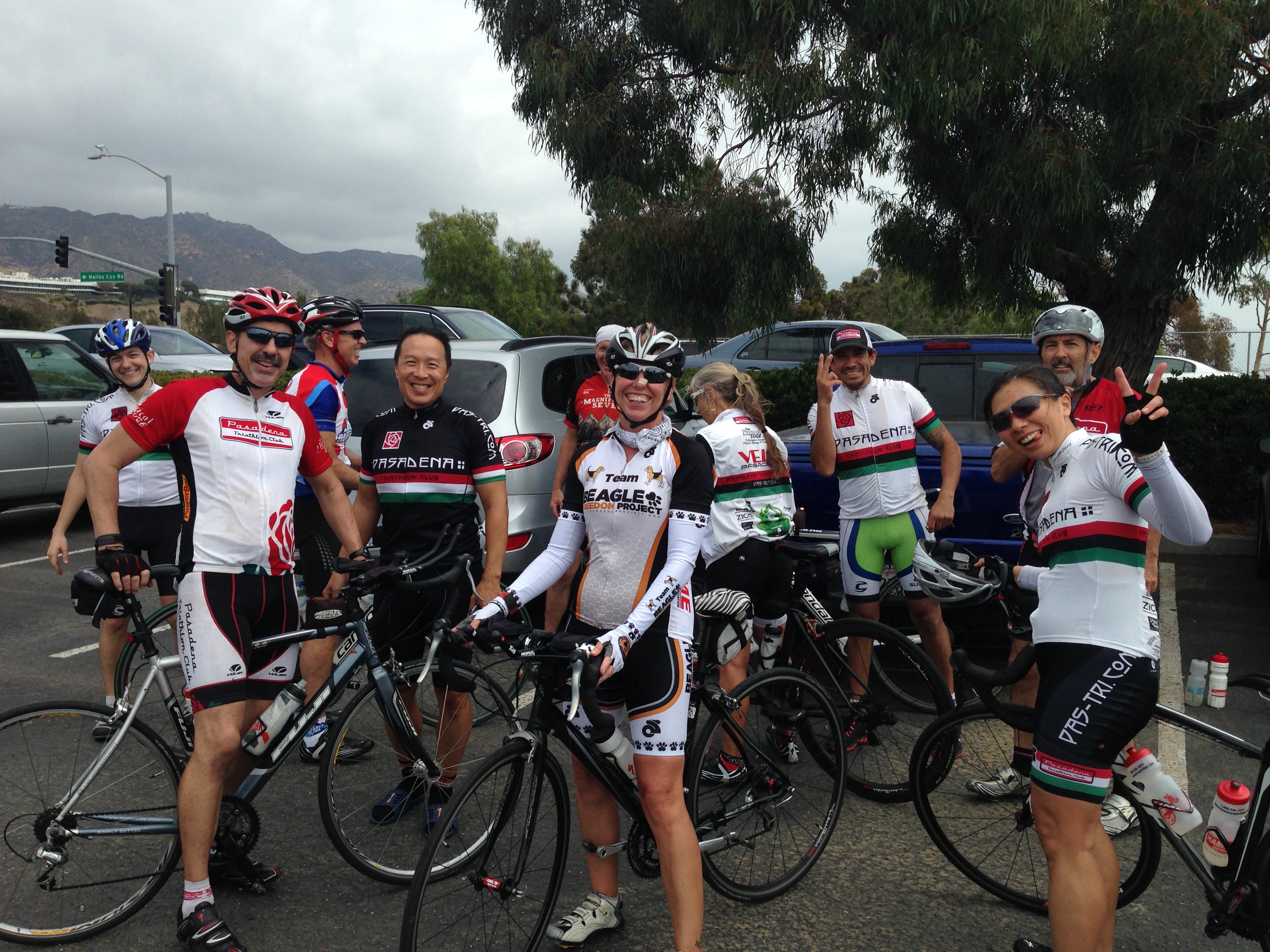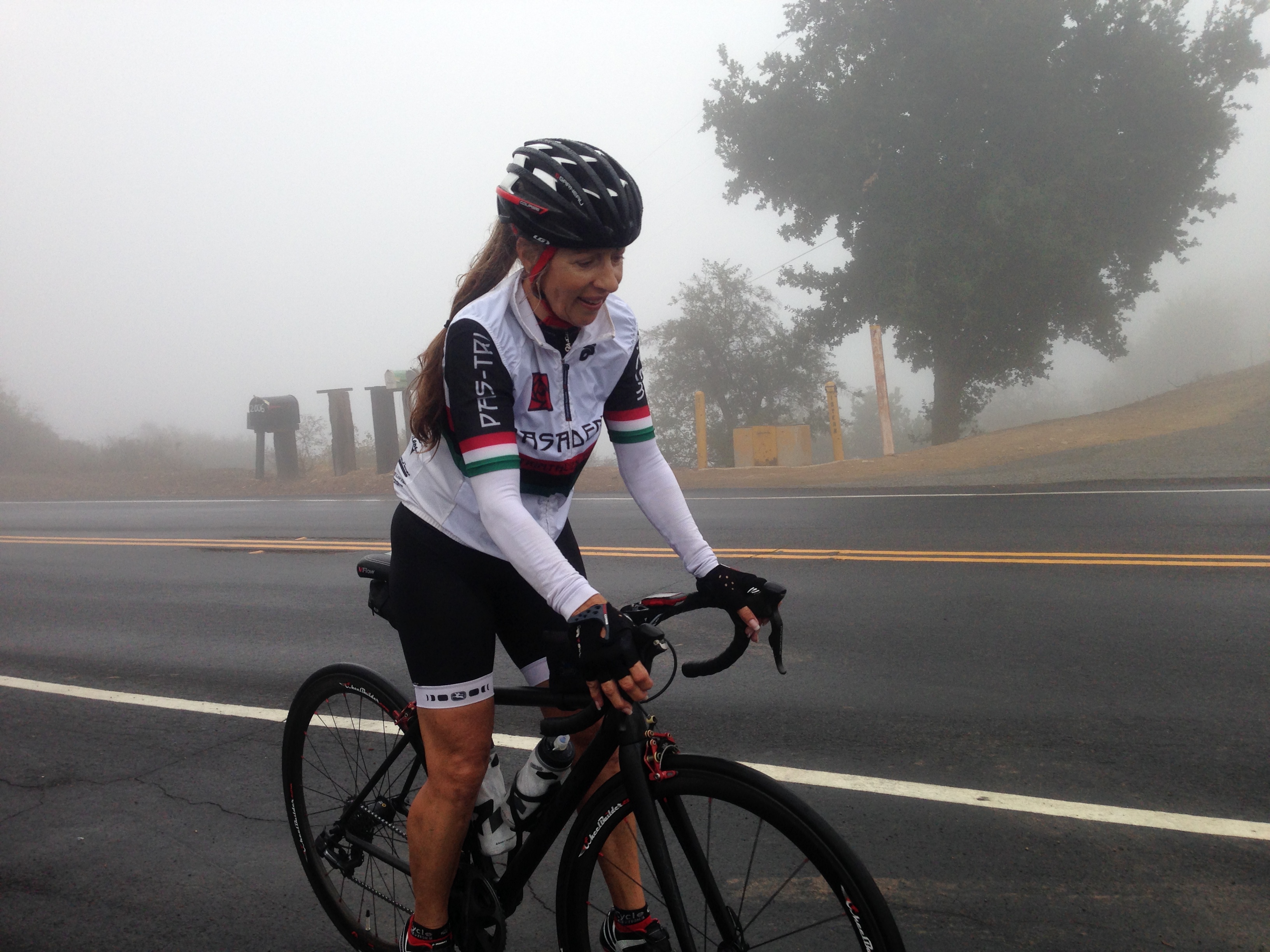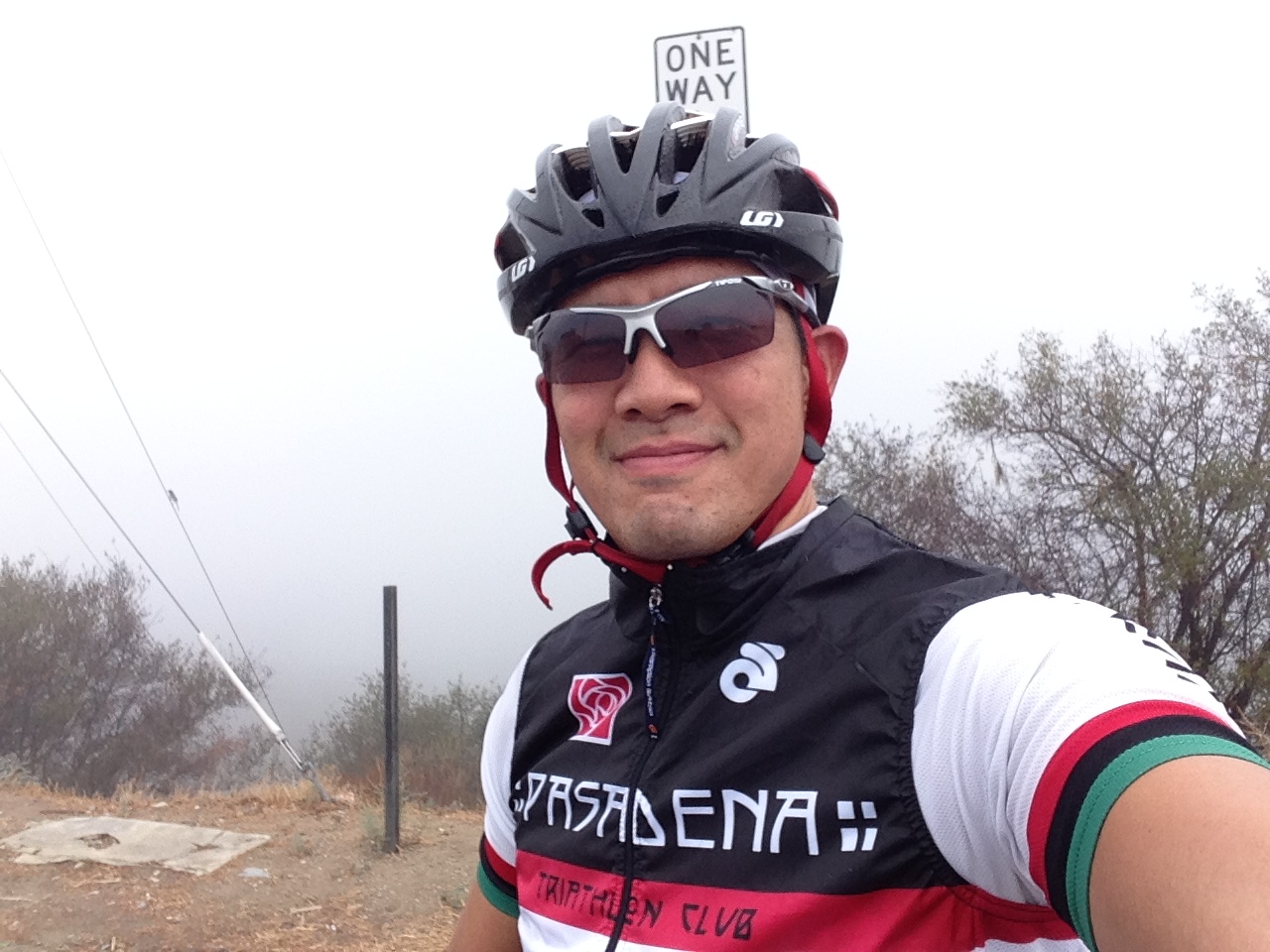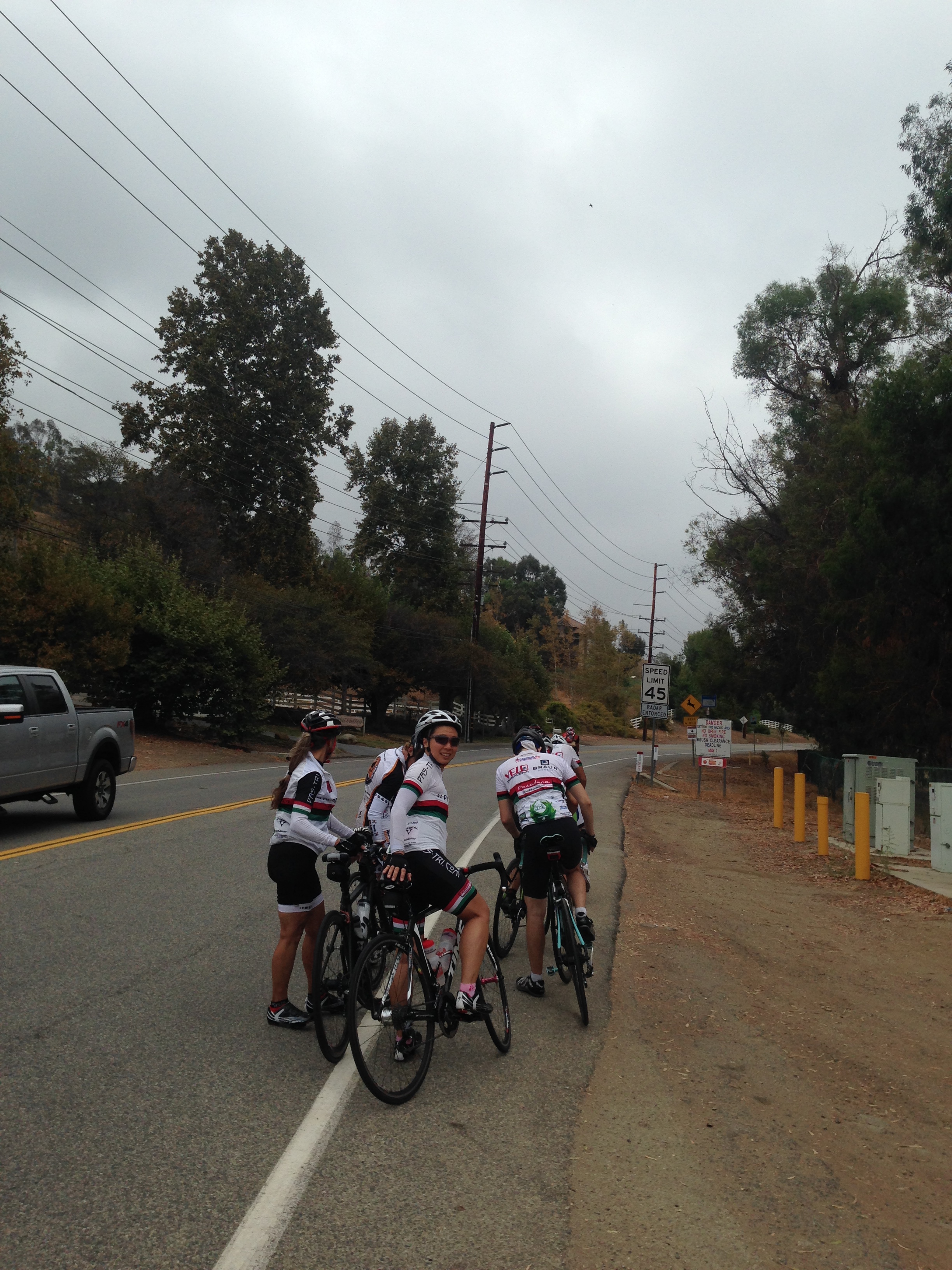 We started at Park across Pacific Coast Highway from Pepperdine University. Riding northbound, we climbed up Latigo Canyon, which is 6-8% steep and 7 miles long. The weather was cloudy. Could be cold, could be misty, could rain! We found out that it would be all of the above. Luckily I had my new PTC vest to keep me dry. The mist turned to drizzle turned to rain. We were pretty soaked by the top of Latigo. Rock Store descent was very wet. We took if slow. It’s one of my favorite descents. No pics cuz it was scary wet. Alvin had a mechanical with his shifters. We rode along Mulholland over to Stunt Canyon. Stunt is a shorter but steep climb, 3 miles, 8%. Fogged in at the top. Short descent and then climbing up Piuma, steep but short. Piuma descent is a 4 mile great descent. Ground was dry. That was good. On one of the hairpin turns Kirk went down and over a guard rail. He’s a tough cookie though. He got up and rode it out. He took quite a thumper on the chest, with the guardrail post.