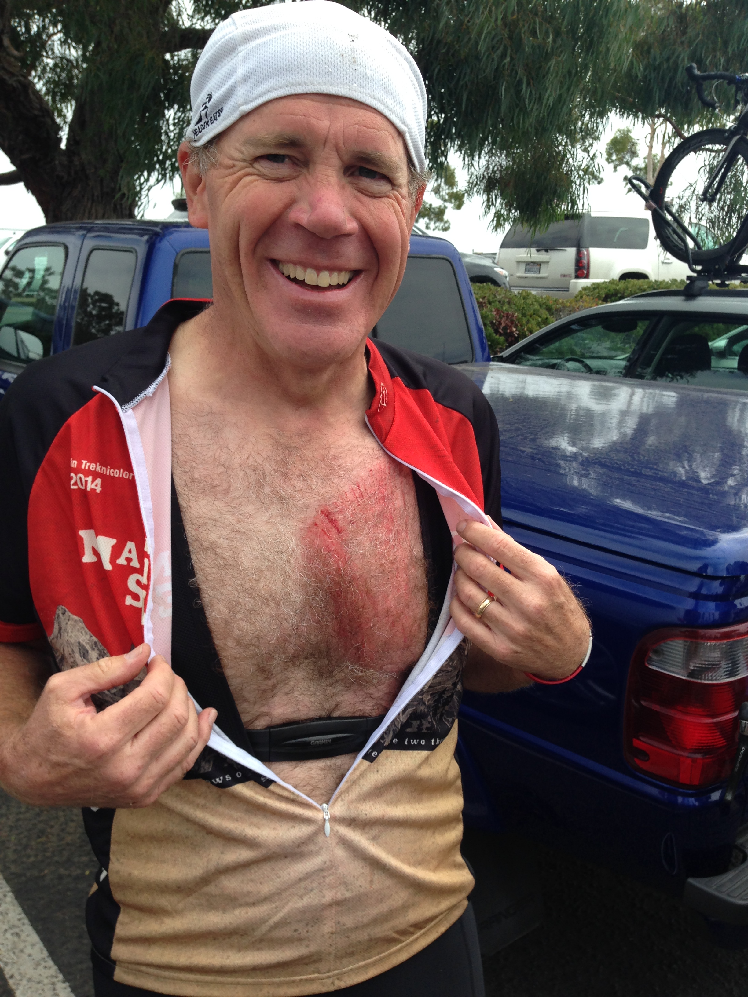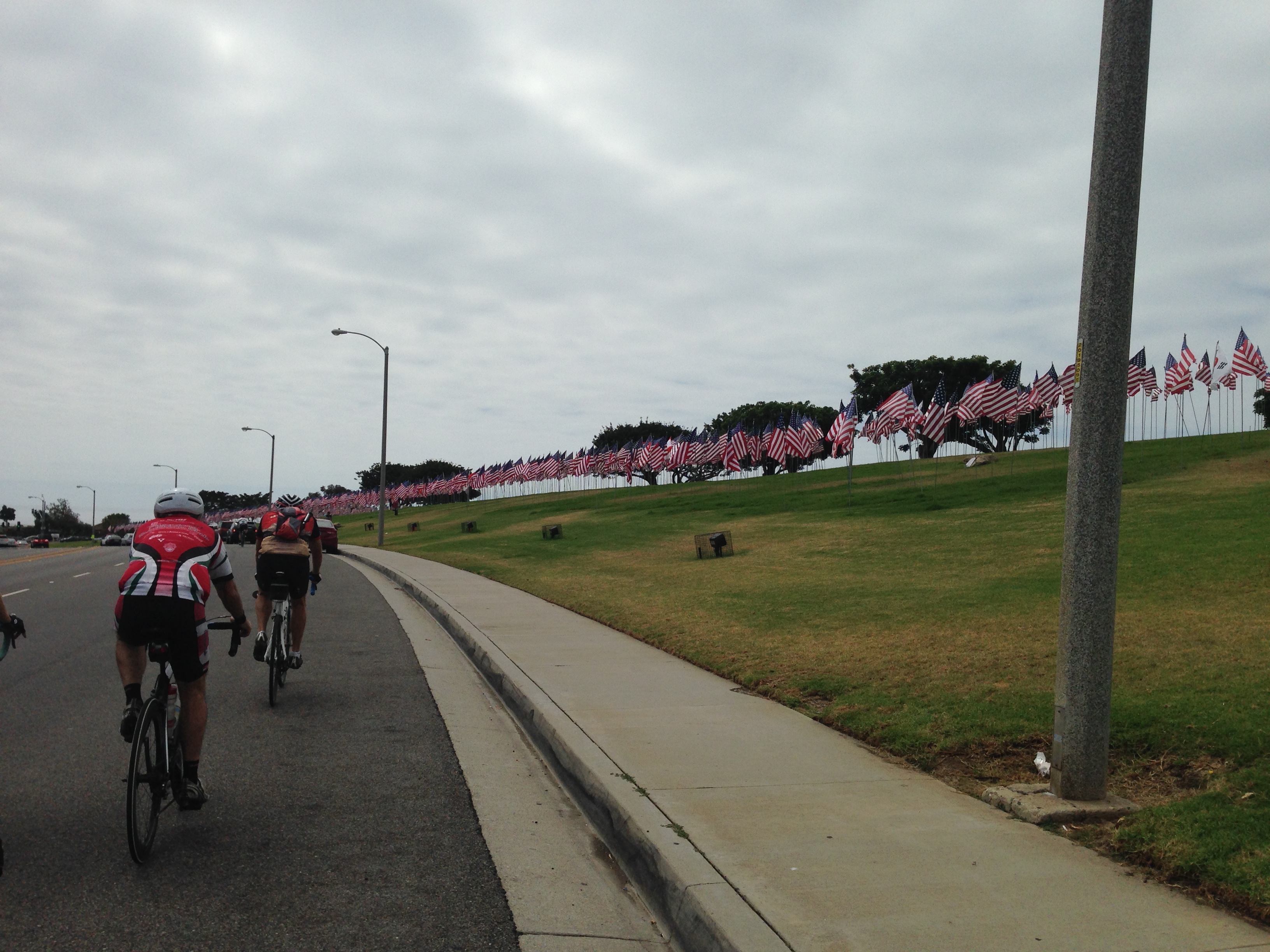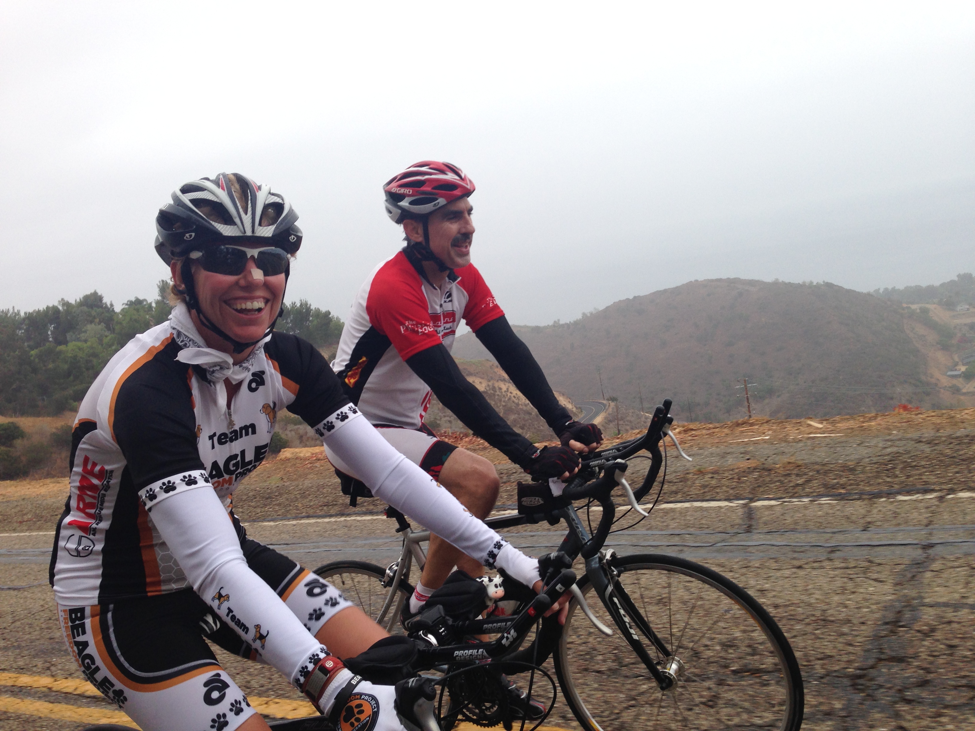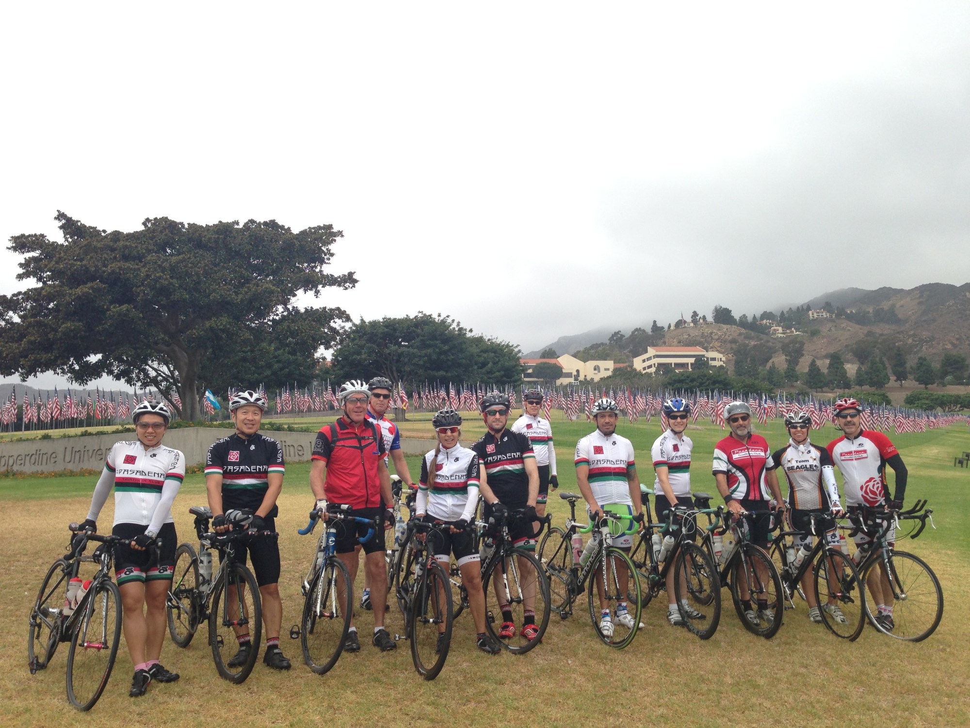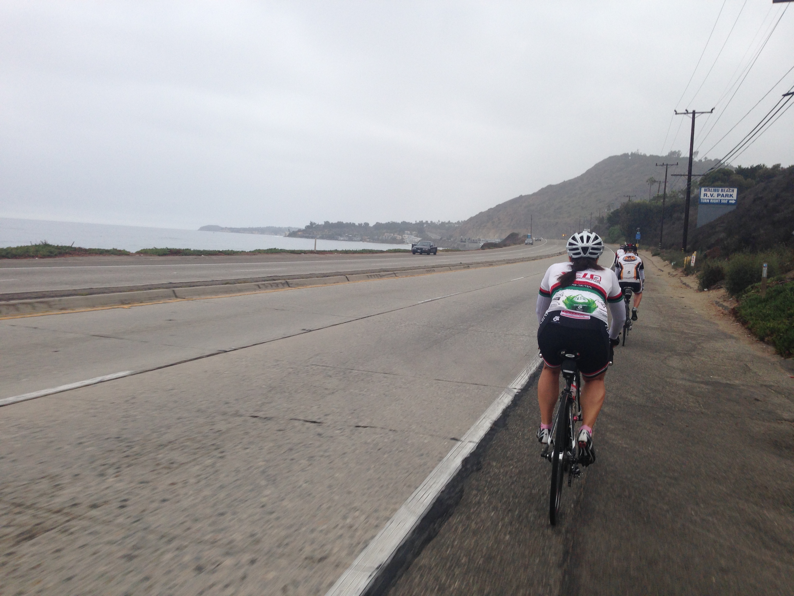 We started at Park across Pacific Coast Highway from Pepperdine University. Riding northbound, we climbed up Latigo Canyon, which is 6-8% steep and 7 miles long. The weather was cloudy. Could be cold, could be misty, could rain! We found out that it would be all of the above. Luckily I had my new PTC vest to keep me dry. The mist turned to drizzle turned to rain. We were pretty soaked by the top of Latigo. Rock Store descent was very wet. We took if slow. It’s one of my favorite descents. No pics cuz it was scary wet. Alvin had a mechanical with his shifters. We rode along Mulholland over to Stunt Canyon. Stunt is a shorter but steep climb, 3 miles, 8%. Fogged in at the top. Short descent and then climbing up Piuma, steep but short. Piuma descent is a 4 mile great descent. Ground was dry. That was good. On one of the hairpin turns Kirk went down and over a guard rail. He’s a tough cookie though. He got up and rode it out. He took quite a thumper on the chest, with the guardrail post.