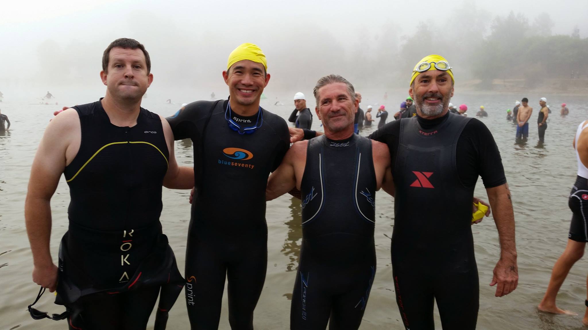 The start of the race was delayed by 30 minutes due to heavy fog. You can see it in the pictures. The lifeguards couldn’t see the buoys, let alone the swimmers. The race director almost changed the OLY course to a loopy course right off the sand. But, thankfully, after the National Anthem, the fog lifted and the race started. There were 4 wave starts. I didn’t get a cap so I ran back to rummage through the goodie bag for my cap. Alvin was there an offered me his yellow cap. I thought they were all the same, but wasn’t thinking too clearly. My cap should have been white for the first wave, since I’m still 44. Alvin had a yellow for the relays, which took off in the second wave. I didn’t want to cause a raucous for starting in the first wave with a yellow cap instead of a white cap, so I hung back and started 5 minutes later with the 2nd wave. So, my official times are off if you look them up. I only post the true data, which is anything from my Garmin.