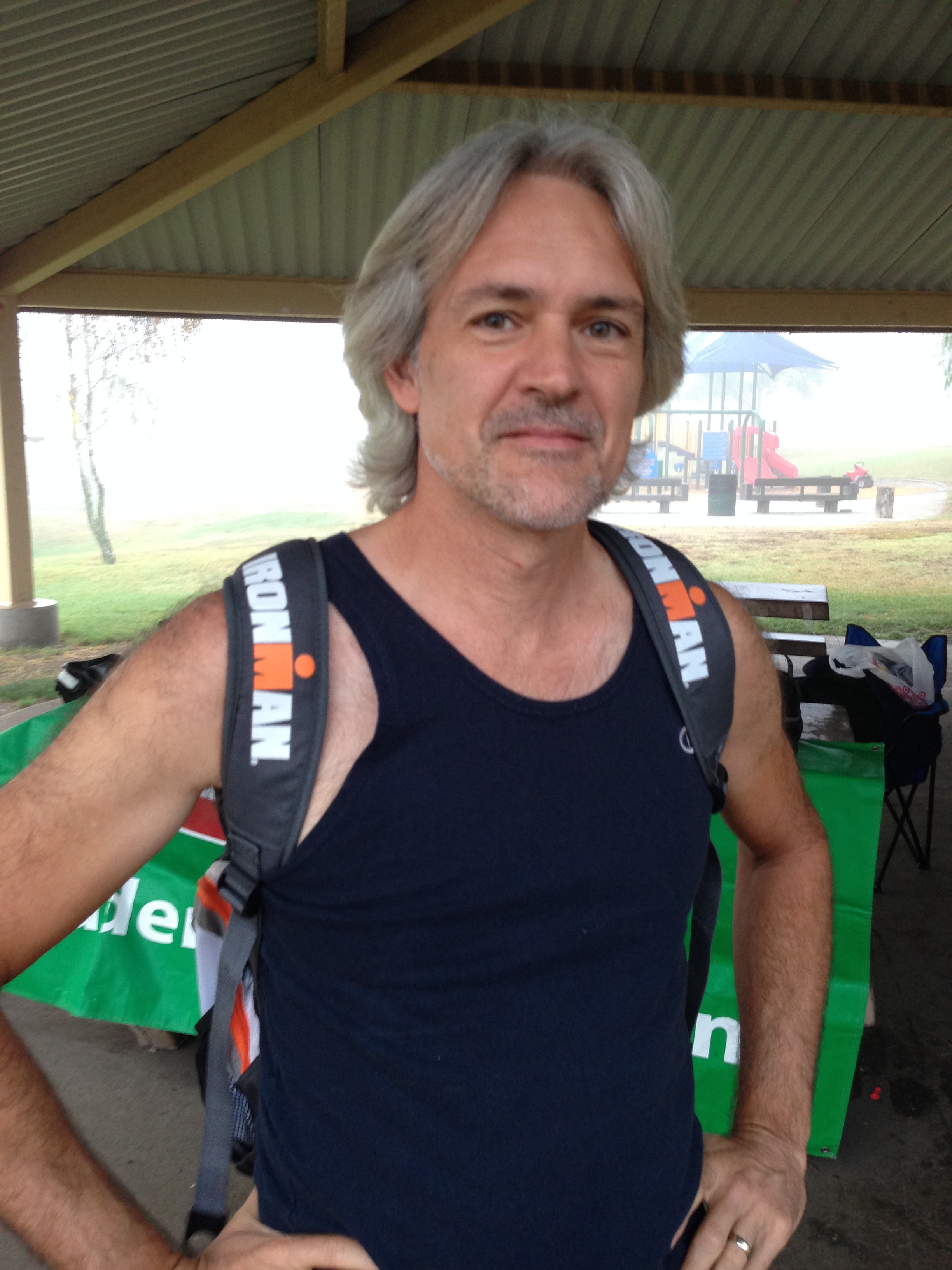 Day started in the dark at registration. Bonelli Park is in San Dimas, CA. It’s been designated as a National Monument by the current president. just so you know. They opened the parking after 6am. Opened registration at 6:30am for packet pickup. It turned out that I was missing my swim cap. My remedy for this had some minor consequences. Anyway, I immediately saw lots of PTC friends in the dark parking lot, at registration and at transition area. The park has a swimming area with buoys, the transition area is in the parking lot overlooking the swim area.