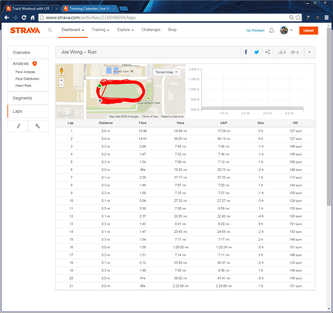 I hit my lap button on Garmin each lap of the mile run (Laps 3, 4, 5) So the data got broken into multiple data laps,