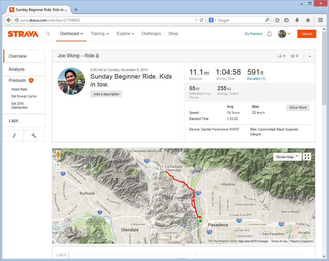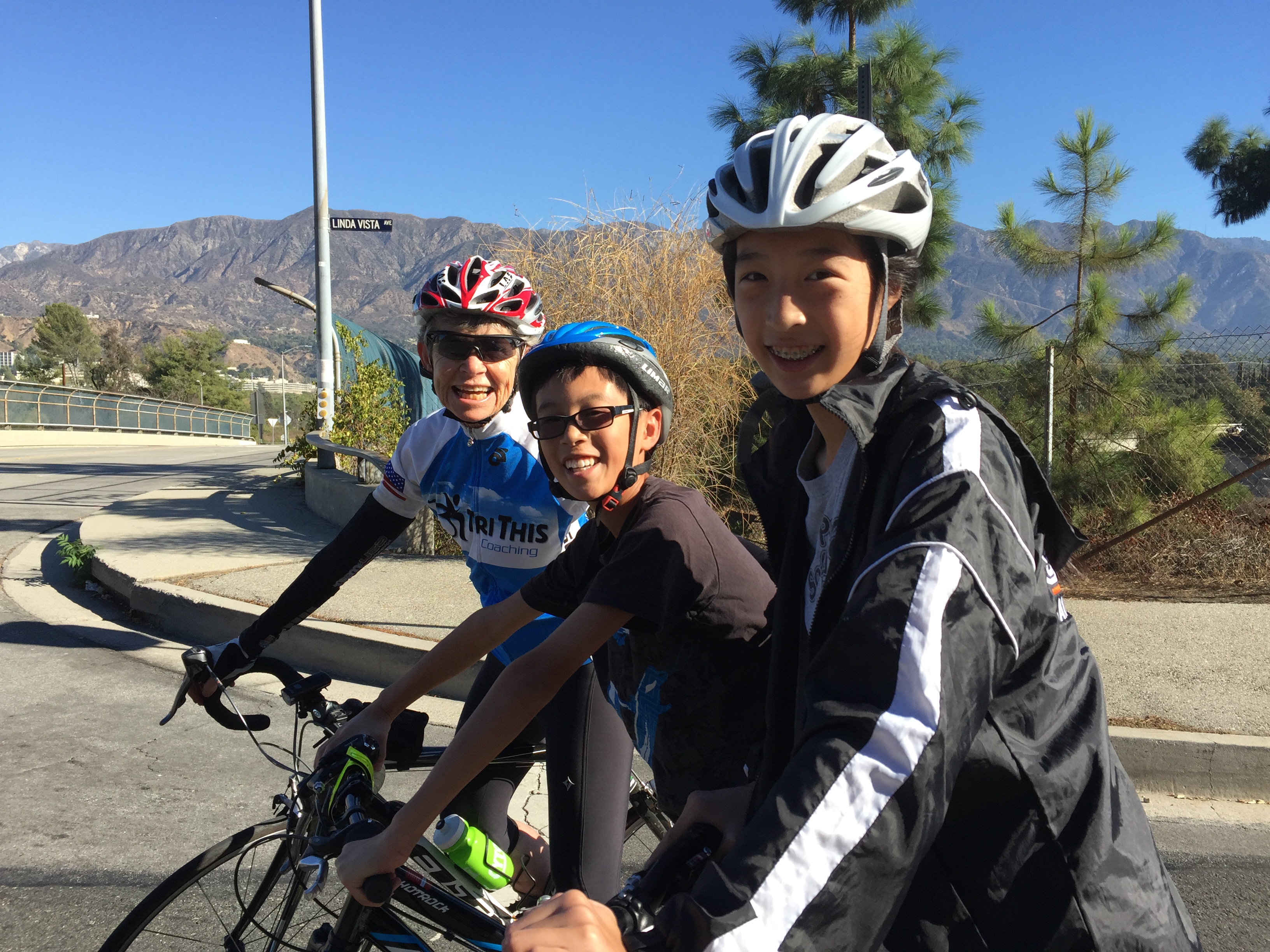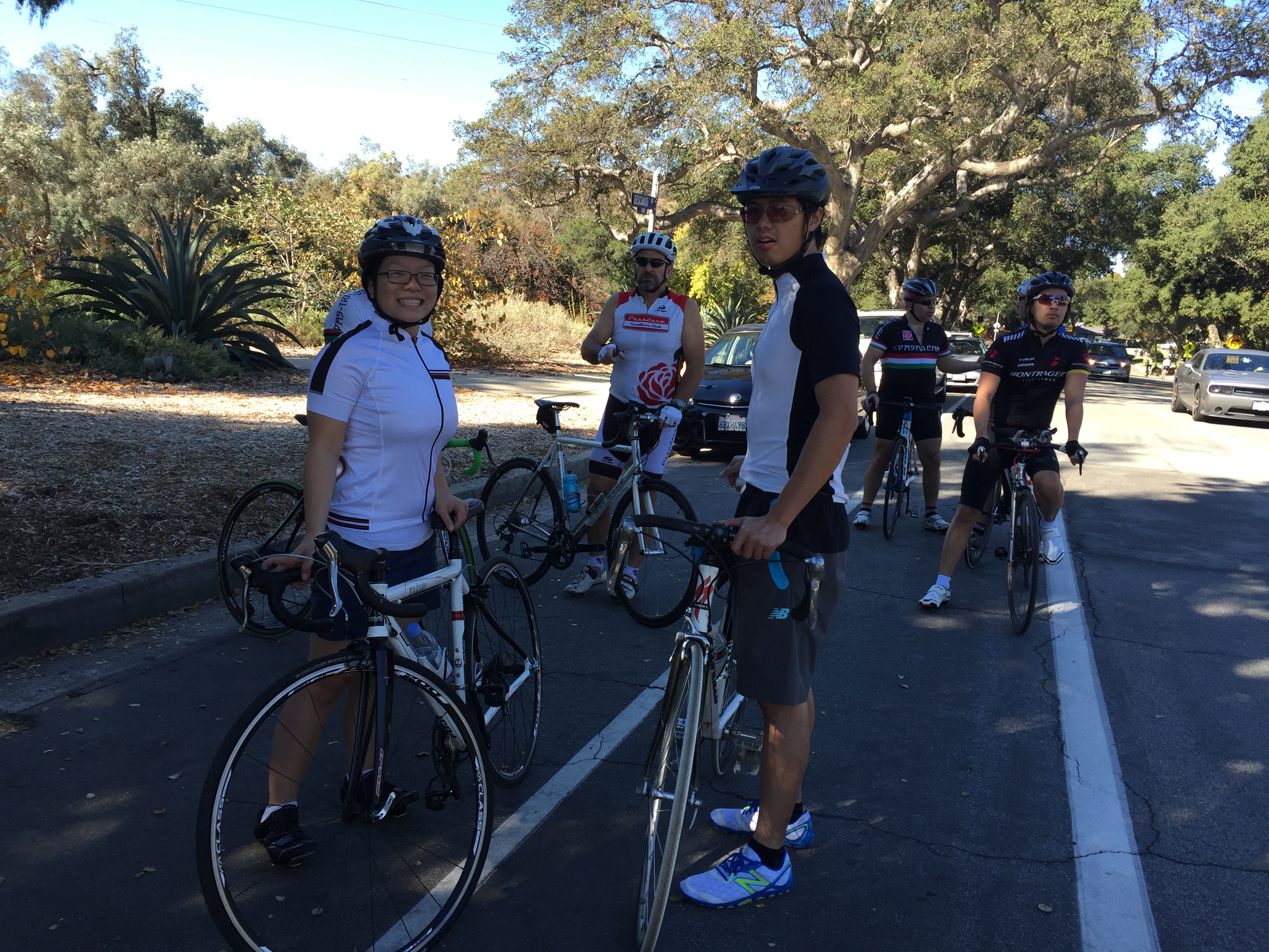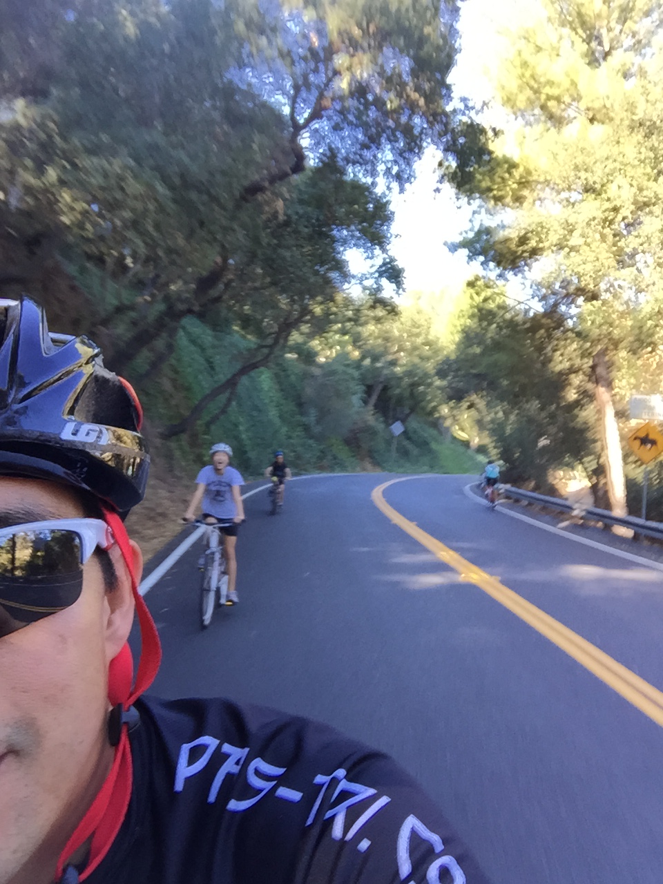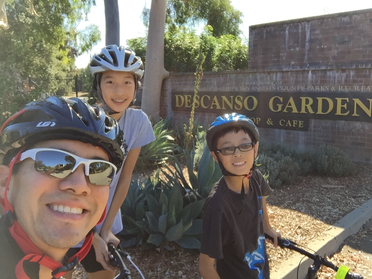 Salvia Canyon is the climb out of the bowl area, which is a little steep for new riders. My kids are used to hills, because of where we live, so they zoomed to the top and waited. Sue was about their speed. So, the four of us proceeded ahead. Linda Vista is a false flat, which means it looks flat but is really a slow steady climb. At Highland, we took the low road on Berkshire. BK was a little tired. We took a short break. Chevy Chase to Descanso Gardens. We took a picture and the rest of the crew showed up. I offered my kids a Powerbar Gel. They both gagged and said thanks, but no thanks. Eugene stopped by at the top too. He thought this was a pretty tough beginner ride too.