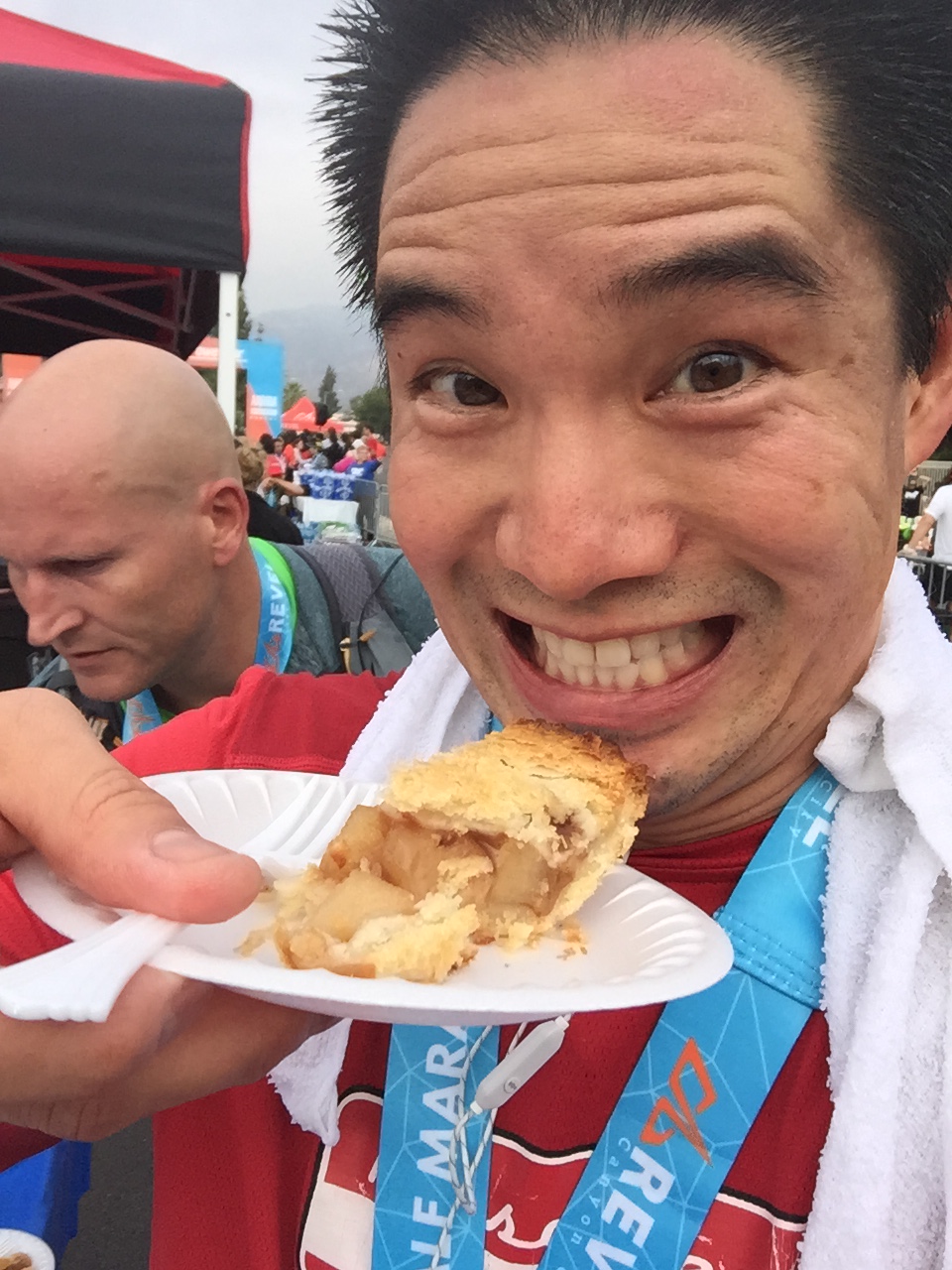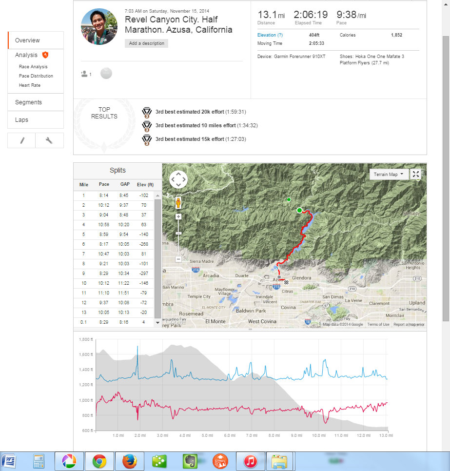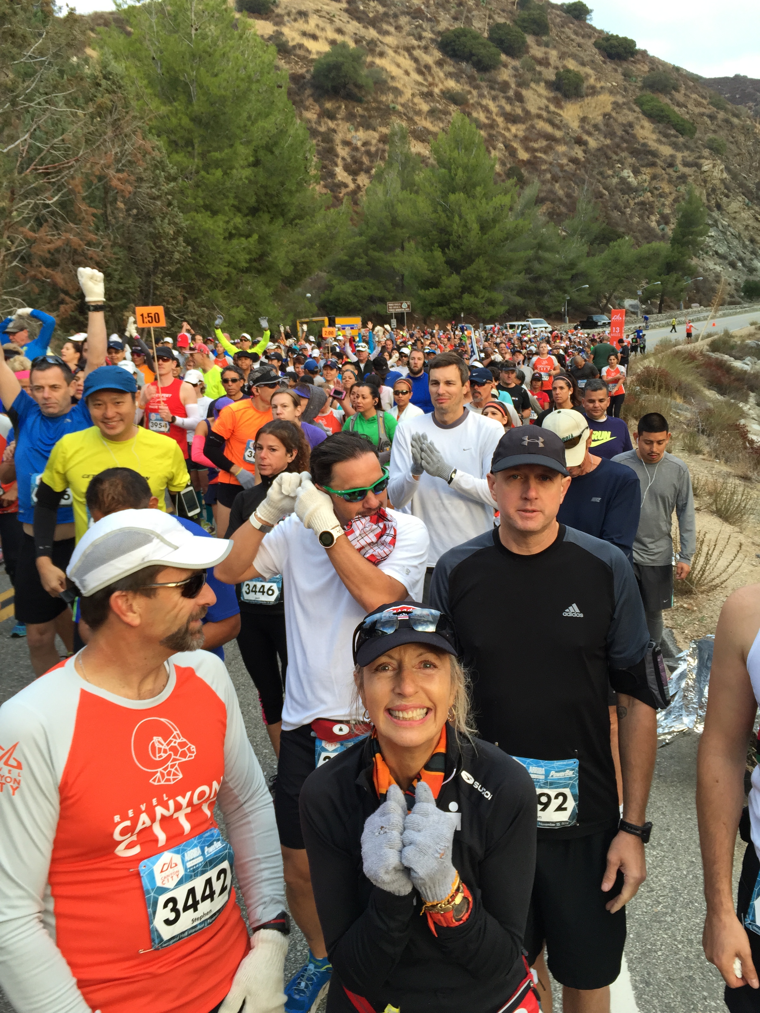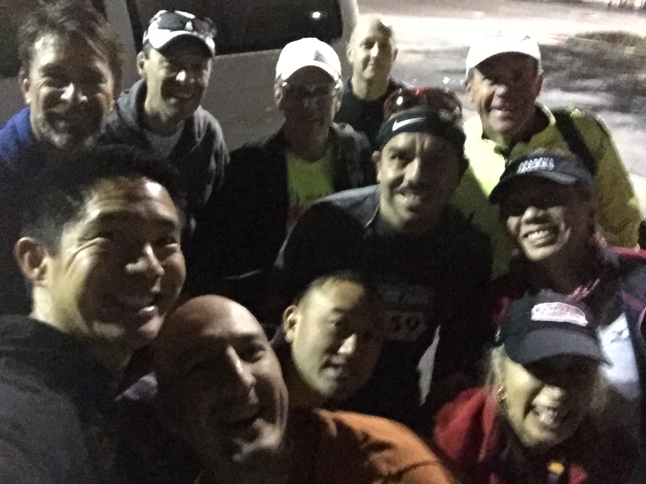 This was a zero dark thirty local trip. 4:30am call time. We met at Eagle Rock Starbucks and rode in a van together. Gregg drove us over to Azusa. Parked at Citrus College and hopped on a school bus. Joel was the only one to tackle the full marathon. The bus ride up to the top was agonizingly slow. It was the driver’s first time ever up the mountain and she practically stopped at every turn in the road. 3 other buses backed up behind her. She was a snail’s pace. She didn’t get the concept of 13.1 miles and that’s the start. She almost stopped and let us out at an Aid Station at mile 6. Just past Cogwells Dam (West Fork), we finally stopped and joined the crowd at the parking lot. Lots of porto-potties, fresh with new TP! Glenn had to really pee, so he darted to the potties. His Revel bag ripped and he almost lost his shoes and everything down the toilet. Yuck. Eek! Everyone broke out their mylar blankets. It was cold as the sun broke through, but we believed it would warm up slightly. I was glad I wore warm up pants and fuzzy hoody. I took my gym bag and had a variety of clothes to pick from. I opted for long sleeve tech tee, shorts, throw away gloves, and dropped off the bag. We took off at 7am. Check out the elevation profile. I felt good at the start. Potty stop at mile 2. The hill at 3 miles made my tummy gurgly, not sure what that was about. Walked it off through the aid station and picked it up again. It was cloudy and kinda windy through the canyon. It was up and down for 6.8 miles. I was glad they had Powerbar gels at mile 6, cuz I was feeling tired and already ate 2 gels. I couldn’t wait until the un-interrupted downhill came. That was great. At mile 11 it flattened out. Race director was our PTC friend Nicole Luque. She did a great job. My favorite parts of the end expo: the Marie Calendar’s Apple Pie, the cool wet towel to clean off, the banana, the picture background, and the print out results. Paul and Lynda podiumed in their age groups! Bunch of folks PR’d. This was Steve’s 1st Half. Well Done.