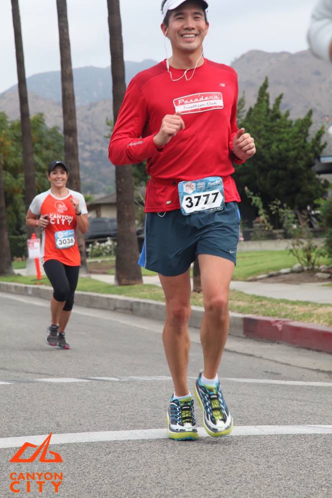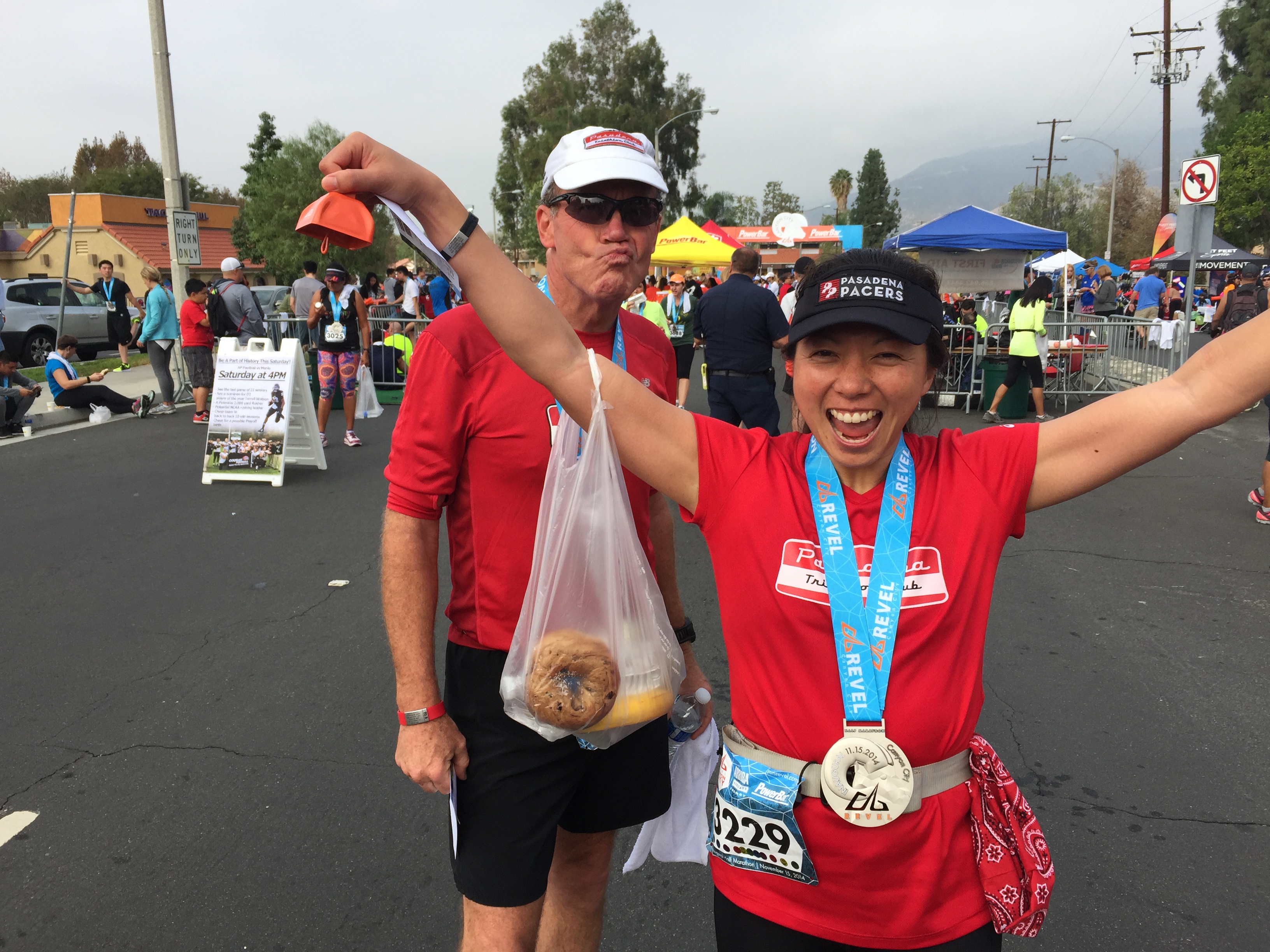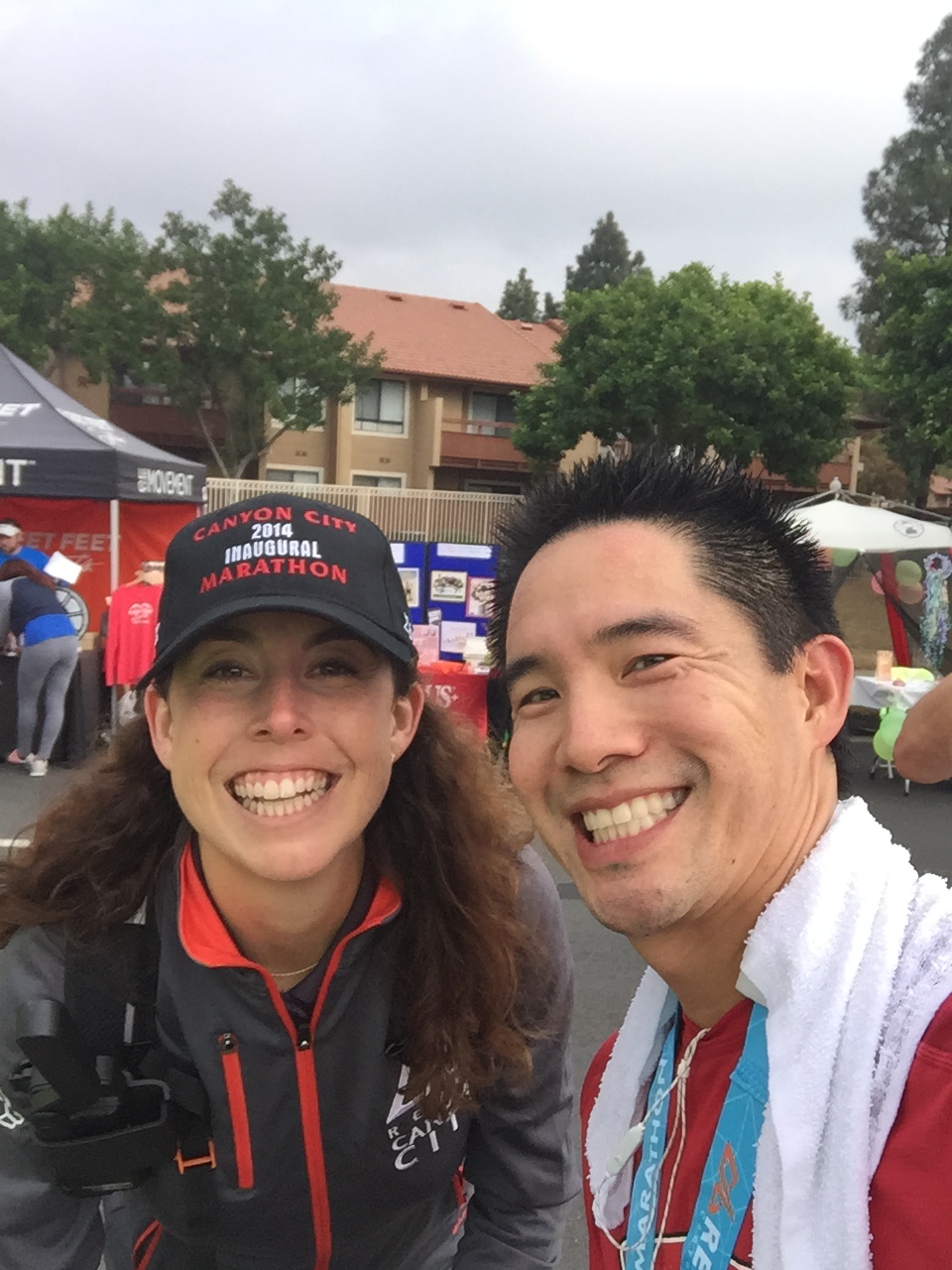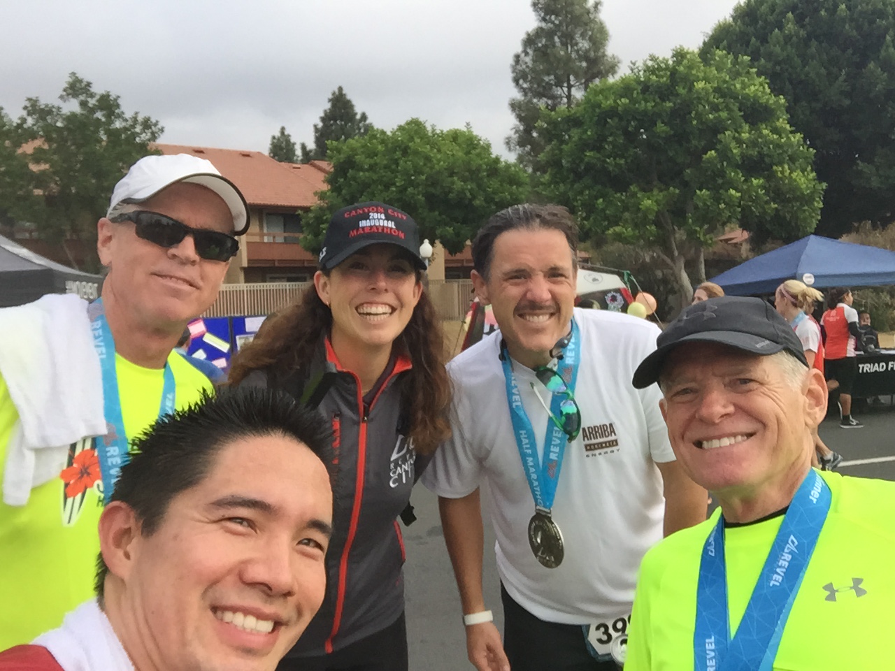 This was a zero dark thirty local trip. 4:30am call time. We met at Eagle Rock Starbucks and rode in a van together. Gregg drove us over to Azusa. Parked at Citrus College and hopped on a school bus. Joel was the only one to tackle the full marathon. The bus ride up to the top was agonizingly slow. It was the driver’s first time ever up the mountain and she practically stopped at every turn in the road. 3 other buses backed up behind her. She was a snail’s pace. She didn’t get the concept of 13.1 miles and that’s the start. She almost stopped and let us out at an Aid Station at mile 6. Just past Cogwells Dam (West Fork), we finally stopped and joined the crowd at the parking lot. Lots of porto-potties, fresh with new TP! Glenn had to really pee, so he darted to the potties. His Revel bag ripped and he almost lost his shoes and everything down the toilet. Yuck. Eek! Everyone broke out their mylar blankets. It was cold as the sun broke through, but we believed it would warm up slightly. I was glad I wore warm up pants and fuzzy hoody. I took my gym bag and had a variety of clothes to pick from. I opted for long sleeve tech tee, shorts, throw away gloves, and dropped off the bag. We took off at 7am. Check out the elevation profile. I felt good at the start. Potty stop at mile 2. The hill at 3 miles made my tummy gurgly, not sure what that was about. Walked it off through the aid station and picked it up again. It was cloudy and kinda windy through the canyon. It was up and down for 6.8 miles. I was glad they had Powerbar gels at mile 6, cuz I was feeling tired and already ate 2 gels. I couldn’t wait until the un-interrupted downhill came. That was great. At mile 11 it flattened out. Race director was our PTC friend Nicole Luque. She did a great job. My favorite parts of the end expo: the Marie Calendar’s Apple Pie, the cool wet towel to clean off, the banana, the picture background, and the print out results. Paul and Lynda podiumed in their age groups! Bunch of folks PR’d. This was Steve’s 1st Half. Well Done.