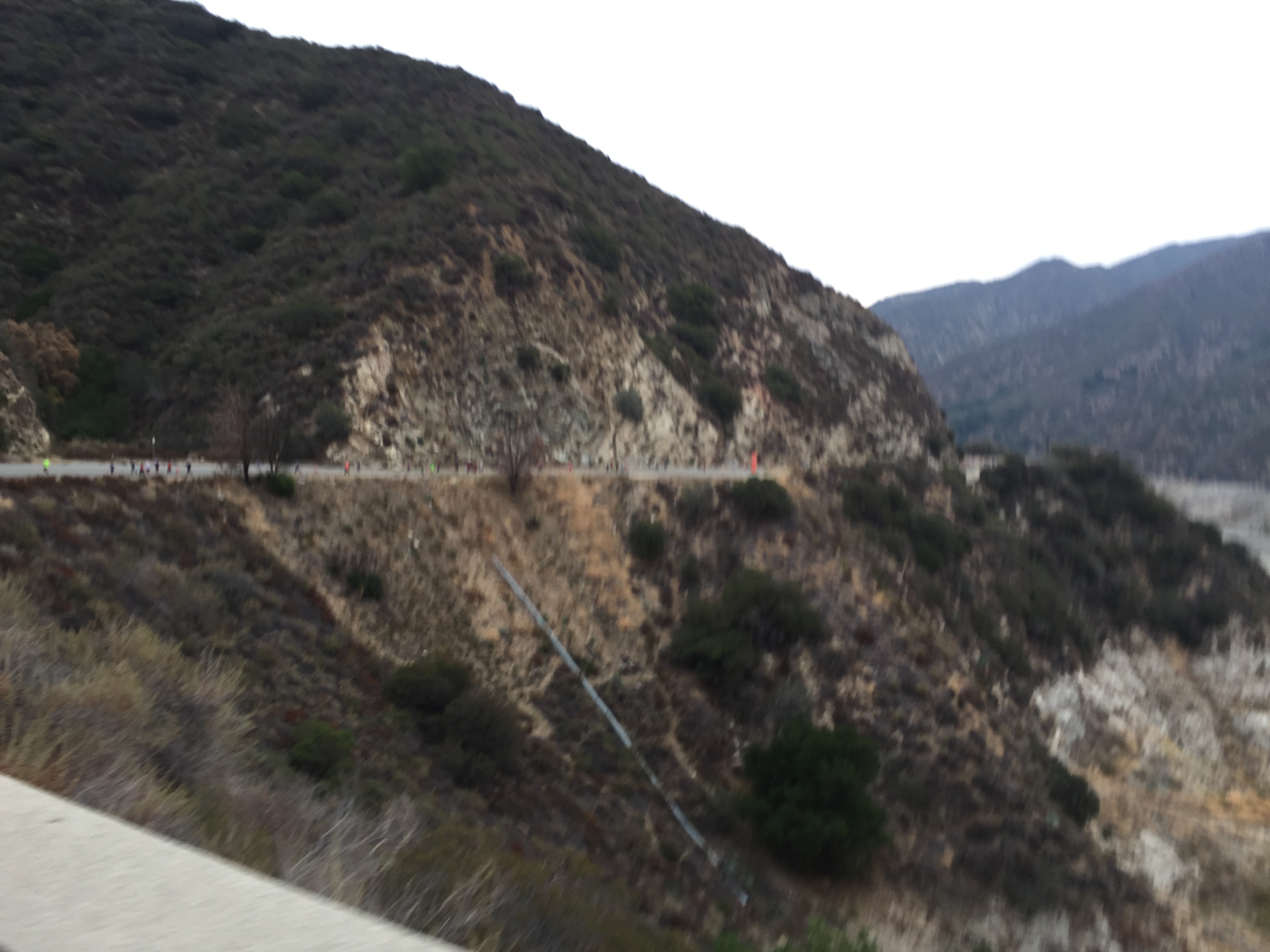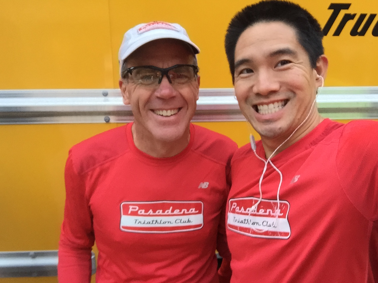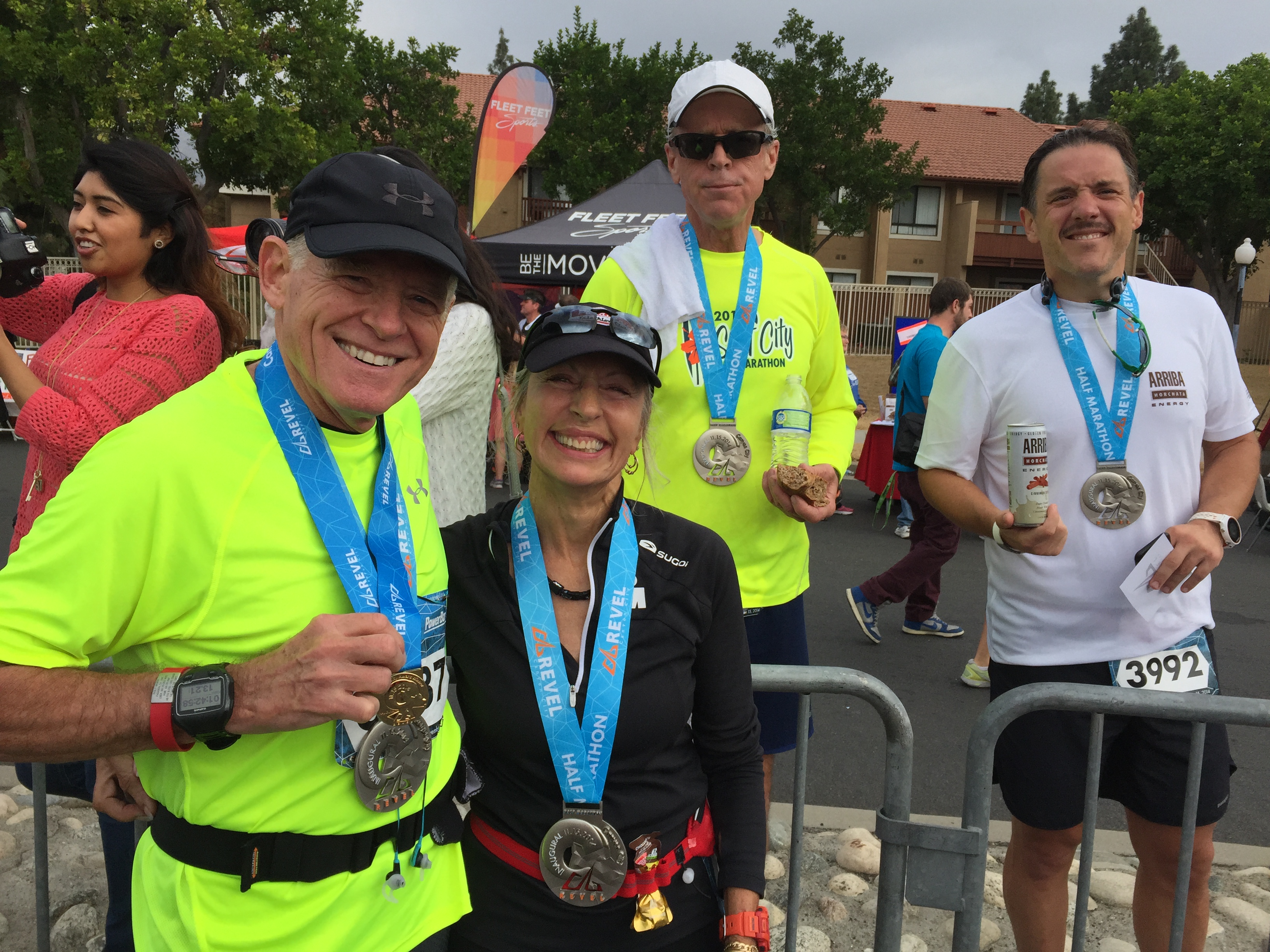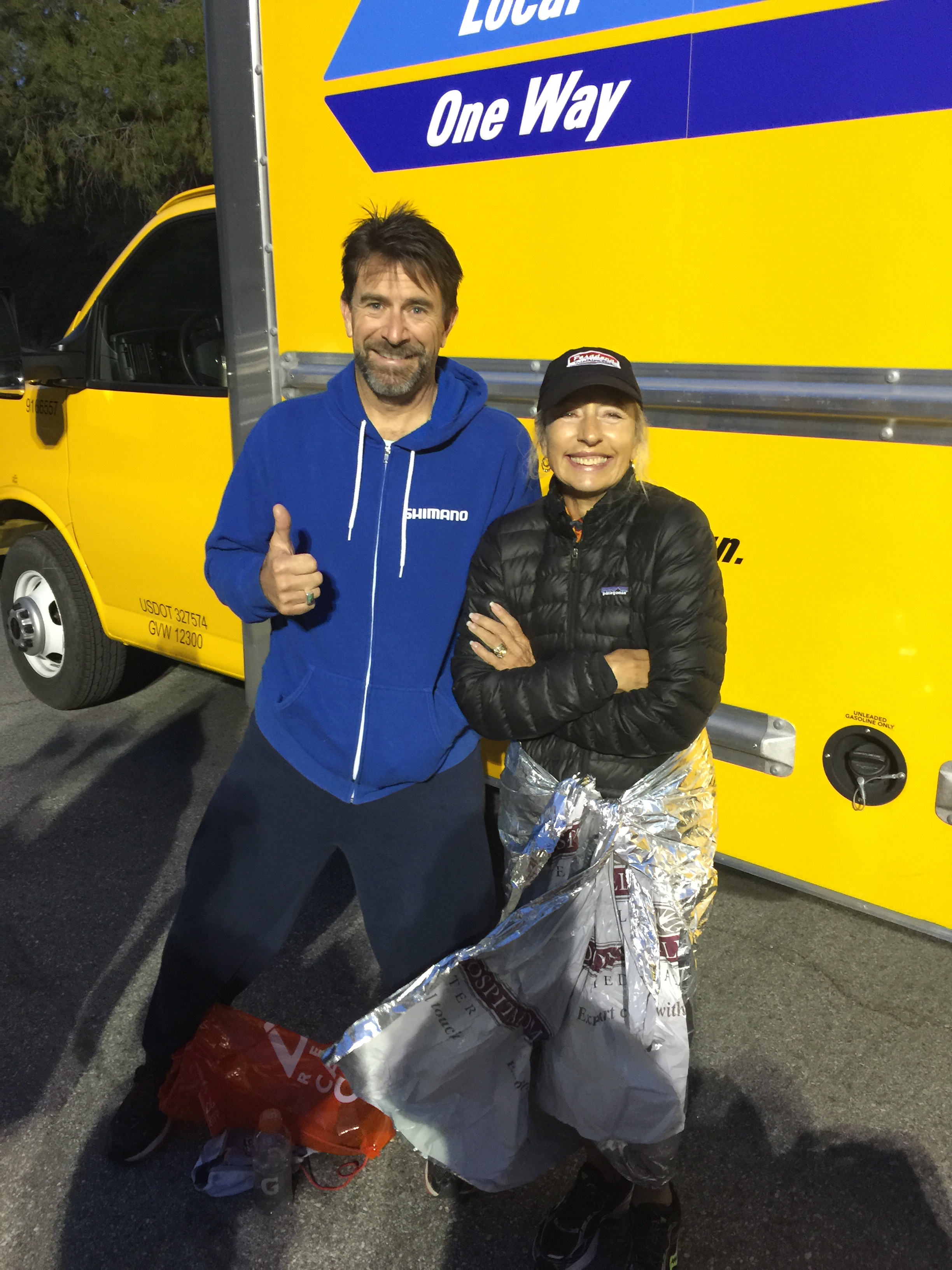 This was a zero dark thirty local trip. 4:30am call time. We met at Eagle Rock Starbucks and rode in a van together. Gregg drove us over to Azusa. Parked at Citrus College and hopped on a school bus. Joel was the only one to tackle the full marathon. The bus ride up to the top was agonizingly slow. It was the driver’s first time ever up the mountain and she practically stopped at every turn in the road. 3 other buses backed up behind her. She was a snail’s pace. She didn’t get the concept of 13.1 miles and that’s the start. She almost stopped and let us out at an Aid Station at mile 6. Just past Cogwells Dam (West Fork), we finally stopped and joined the crowd at the parking lot. Lots of porto-potties, fresh with new TP! Glenn had to really pee, so he darted to the potties. His Revel bag ripped and he almost lost his shoes and everything down the toilet. Yuck. Eek! Everyone broke out their mylar blankets. It was cold as the sun broke through, but we believed it would warm up slightly. I was glad I wore warm up pants and fuzzy hoody. I took my gym bag and had a variety of clothes to pick from. I opted for long sleeve tech tee, shorts, throw away gloves, and dropped off the bag. We took off at 7am. Check out the elevation profile. I felt good at the start. Potty stop at mile 2. The hill at 3 miles made my tummy gurgly, not sure what that was about. Walked it off through the aid station and picked it up again. It was cloudy and kinda windy through the canyon. It was up and down for 6.8 miles. I was glad they had Powerbar gels at mile 6, cuz I was feeling tired and already ate 2 gels. I couldn’t wait until the un-interrupted downhill came. That was great. At mile 11 it flattened out. Race director was our PTC friend Nicole Luque. She did a great job. My favorite parts of the end expo: the Marie Calendar’s Apple Pie, the cool wet towel to clean off, the banana, the picture background, and the print out results. Paul and Lynda podiumed in their age groups! Bunch of folks PR’d. This was Steve’s 1st Half. Well Done.
