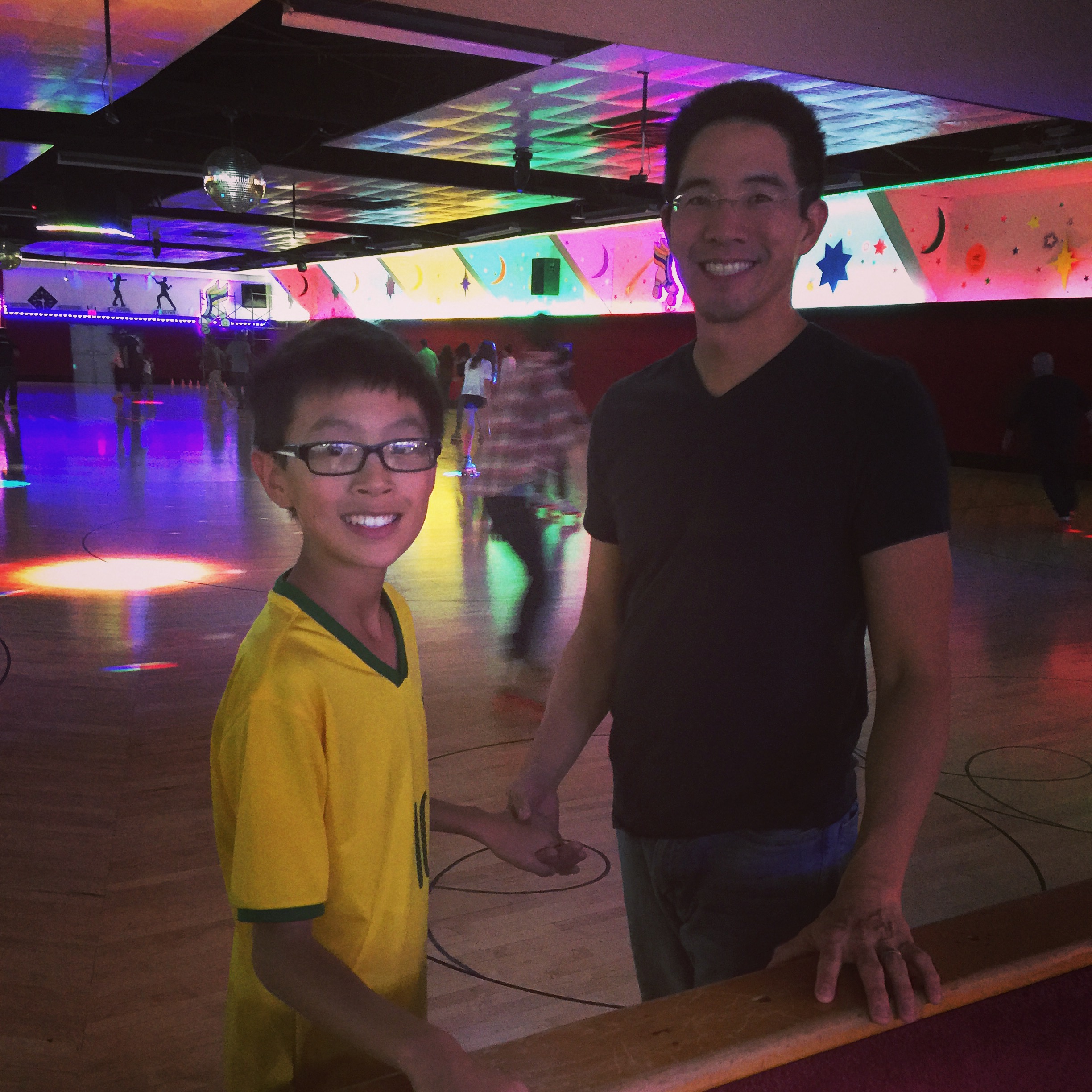 Kids are on vacation for the whole week of Thanksgiving. MM was going rollerskating with some high-school friends, but her ride fell through. Since Mom and Dad have to work most of the week, we needed a night out too. So we took the kids and M’s friends to the Moonlight Rollerway in Glendale. It was dejavu for me. I skated here when I was in high school; it’s really close to my parent’s house. It’s pretty nice, compared to by blurry memories of mid-80’s. When we entered, we heard the organ blasting. It was old time organ, like a carousel or baseball game. Later it was disco and eighties, but it was all fun. This was BK’s first time skating. He picked it up fast. My wife sat it out and watched. She was thoroughly impressed with my skating moves, forward and backwards! BK and I tried to not cramp Sister’s style, and give she and her high-schooler friends some space. We rolled around doing left left left turns, almost until closing time.