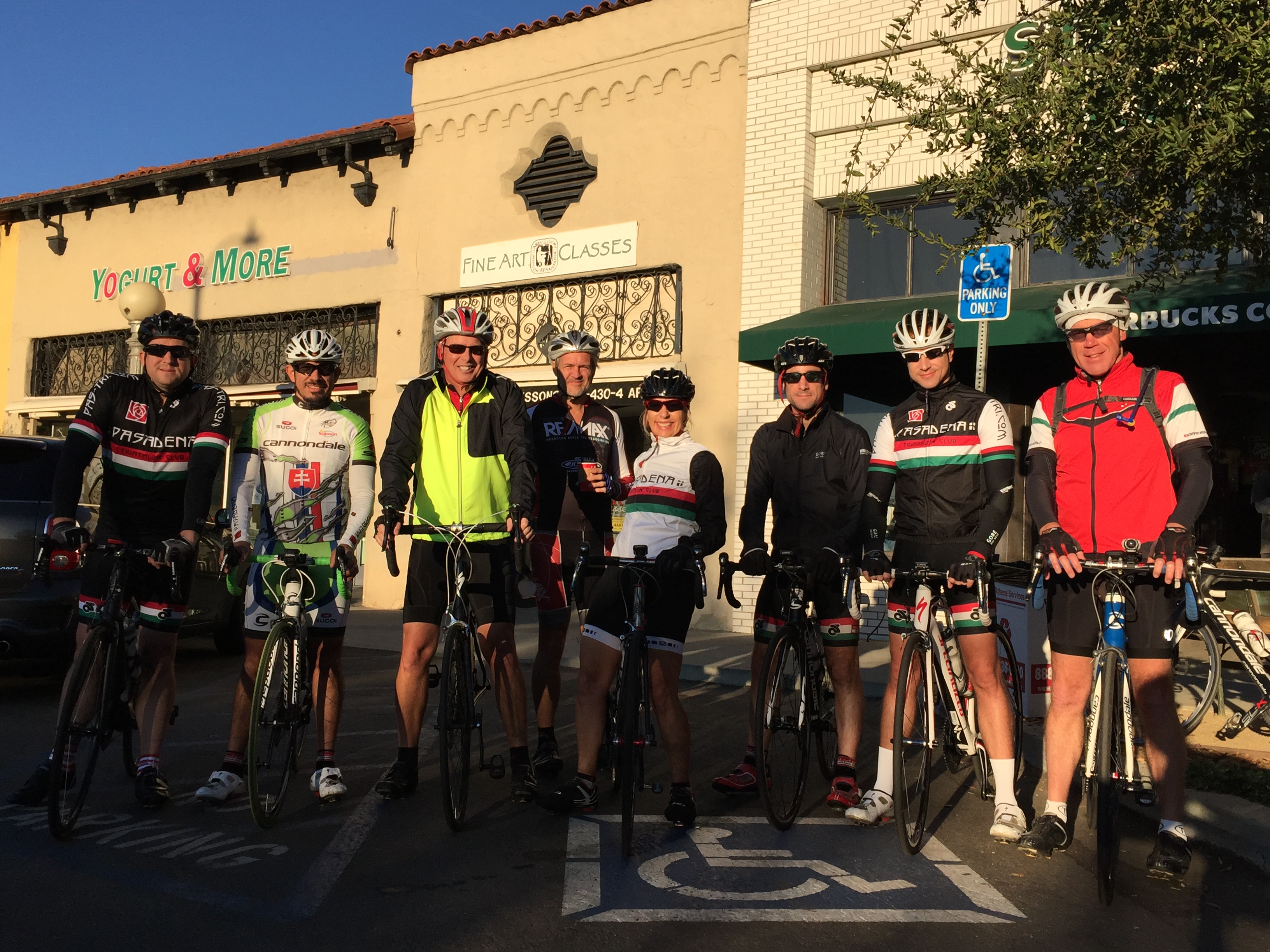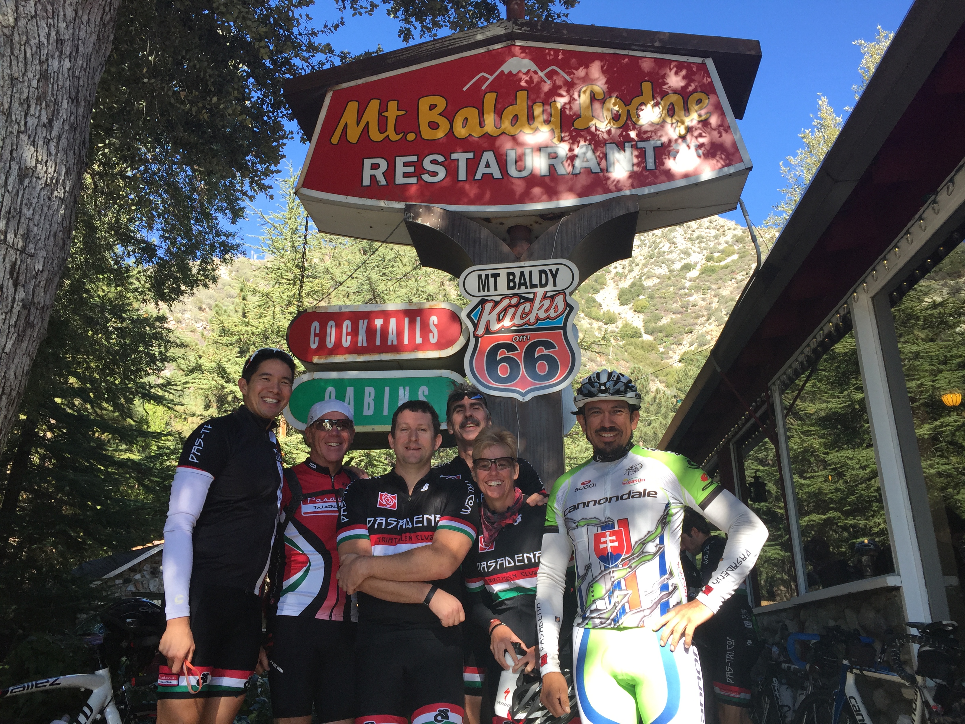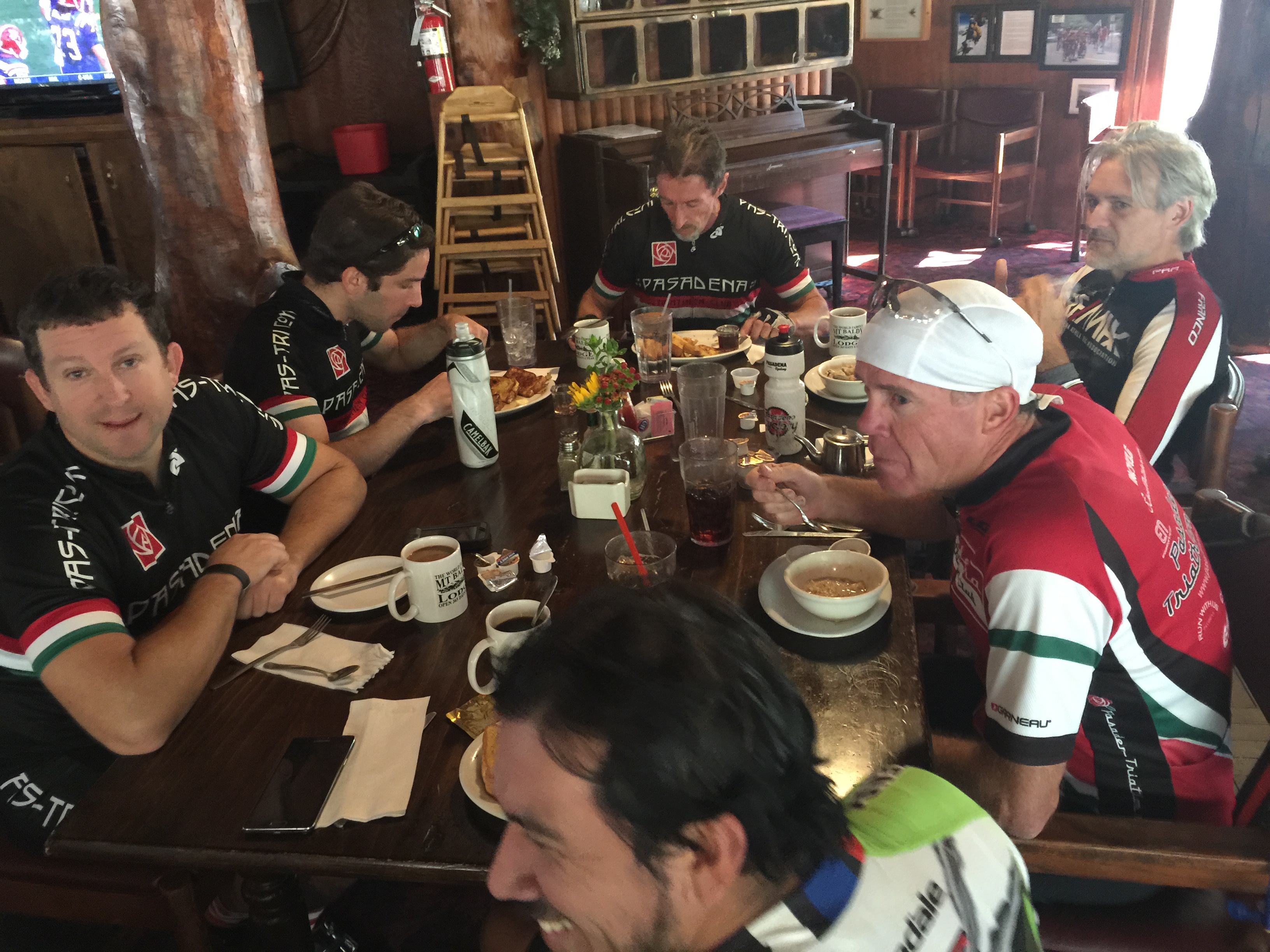 We started in Sierra Madre’s Starbucks. Rob, Luis, Paul, Phil, Lynda, Jonathan, Derek, Kirk and me. This was a long tough ride, but perfect conditions. It was rollers and steep climbs, mountain vistas, fireplace in the lodge.