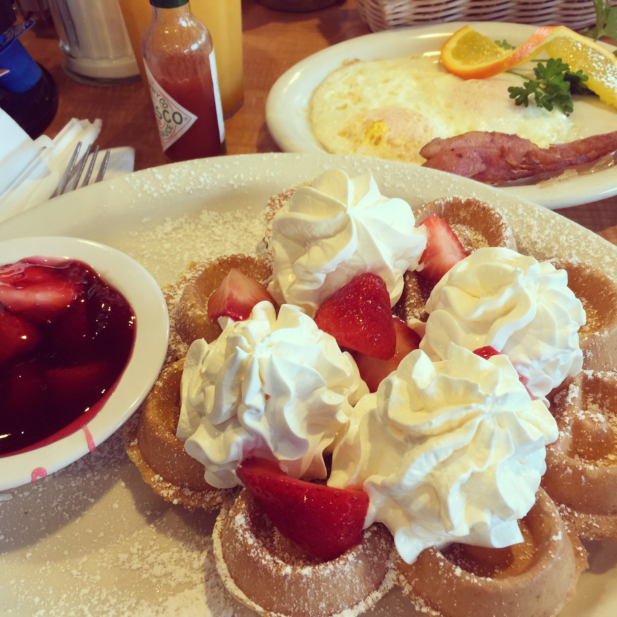 I love through medals. It’s always a cool snow flake design. Right after, we went to Flappy Jacks in Glendora for brunch. Gail prepared a buzzer for us! We sat down really fast. Yummy strawberry waffle for me and caramel walnut pancakes for Gail.