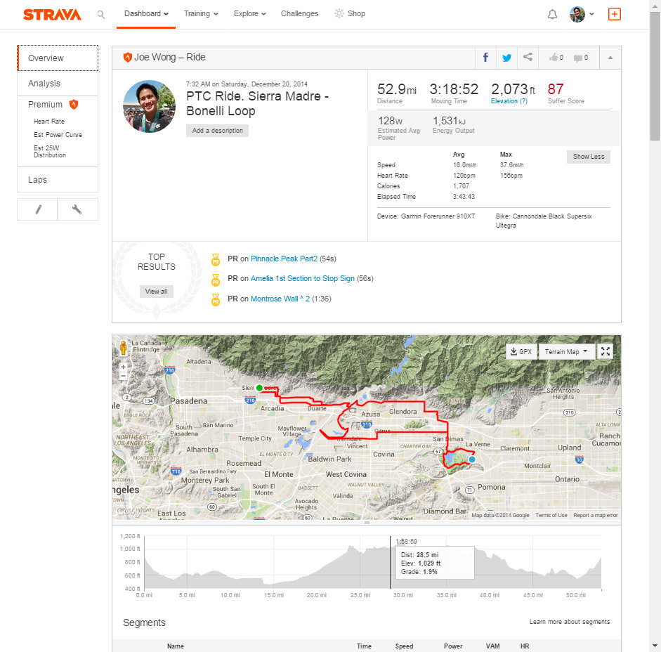 52.9 Miles, 2,073 ft, 3:18:52 moving time, 87 suffer score, 31 Strava trophies