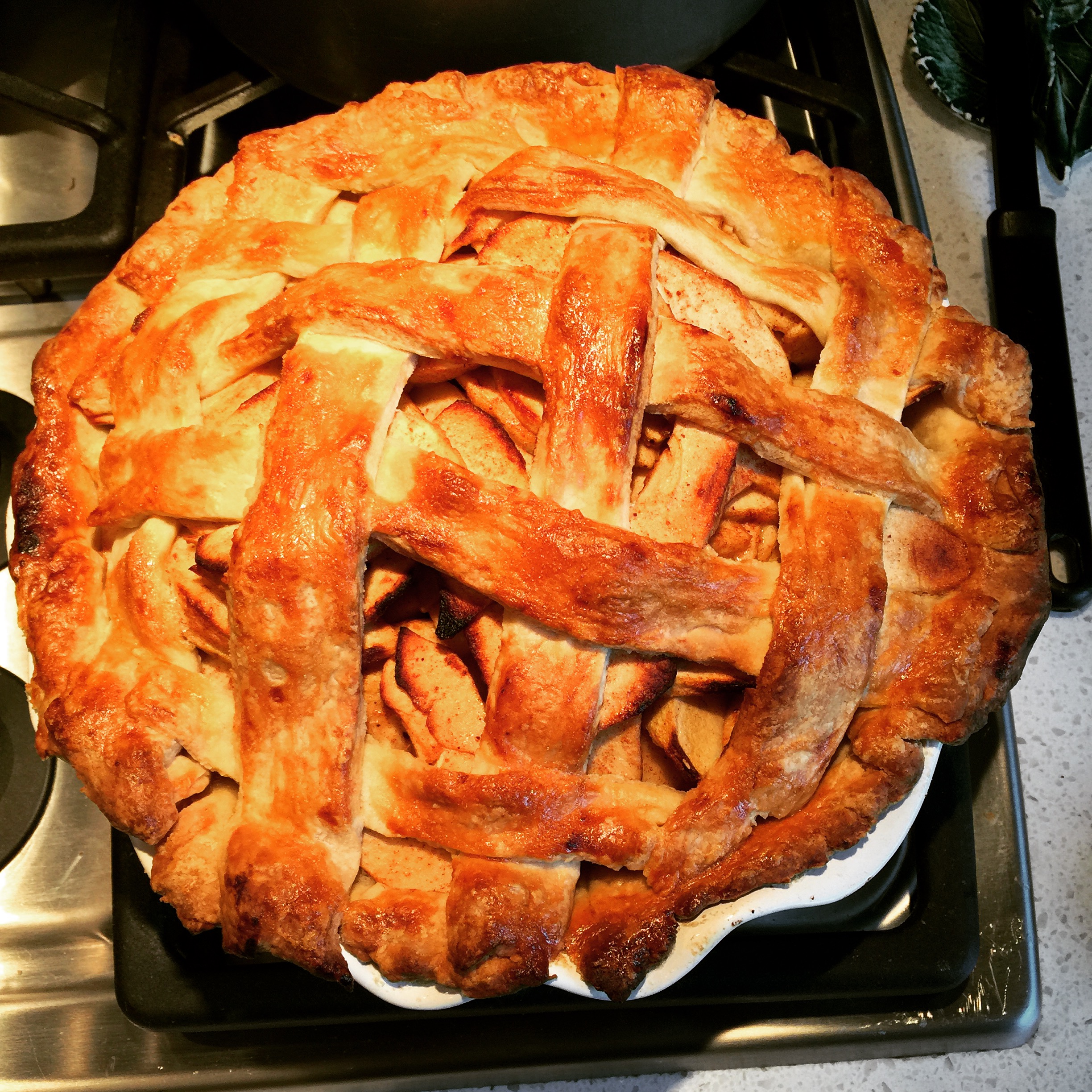 I made an apple pie from scratch for my foodie friend Sue. Earlier this year, I asked her for an apple pie recipe, and she pointed me to her favorite recipe at Smitten kitchen’s apple pie recipe. So, it was time to let her taste it. MM and I made the crust from scratch. She pulsed, and mixed, and blended, and chilled it a couple days ahead. It was our first time using vegetable shortening. The crust came out flaky and yummy. Definitely worth the trouble. We used Macintosh and Granny Smith apples. Apple filling was seasoned with nutmeg, sugar, allspice, cinnamon. We went for the lattice top and a nice egg wash to get the shine and color on the crust. It was fun and yummy.