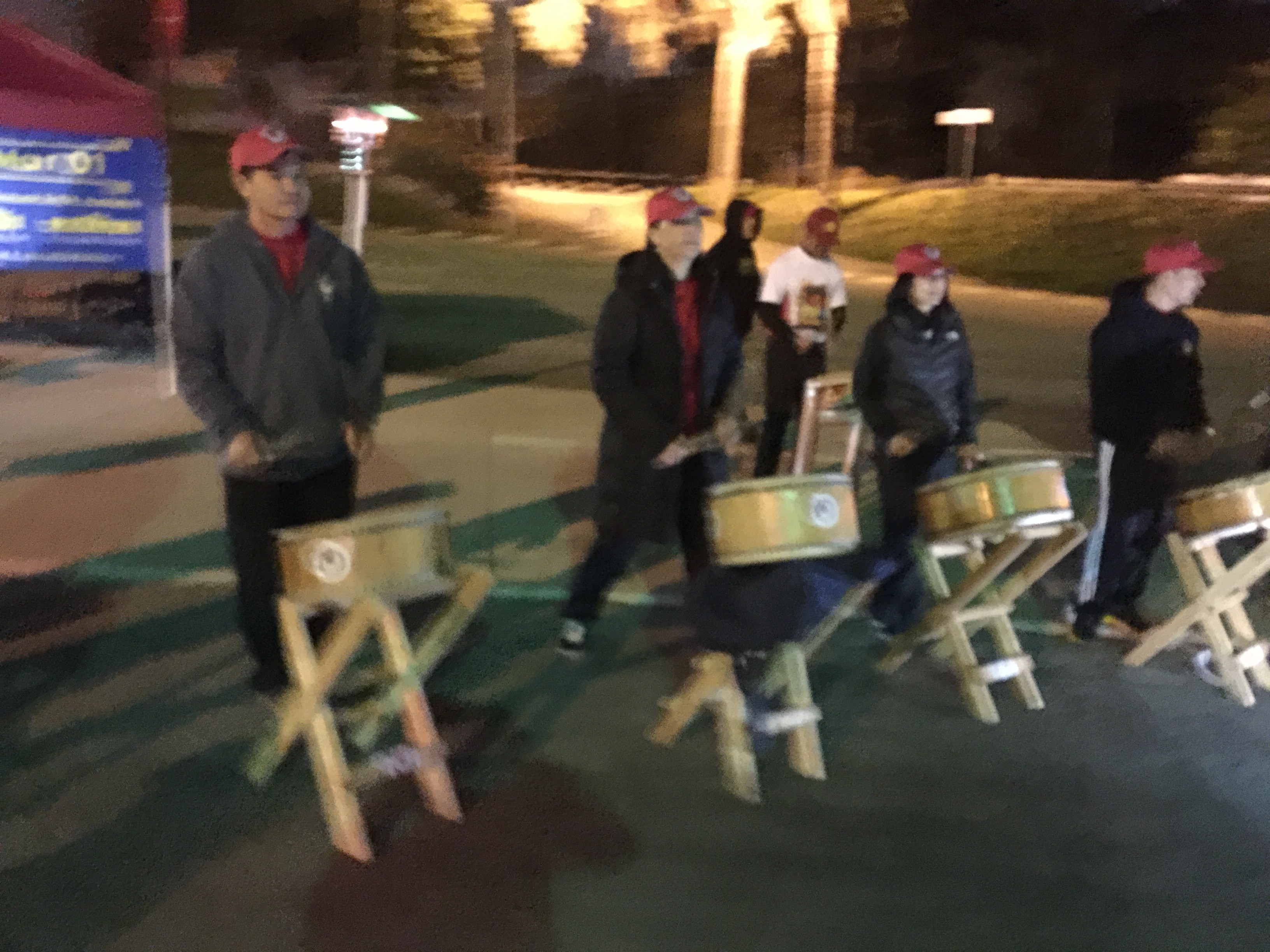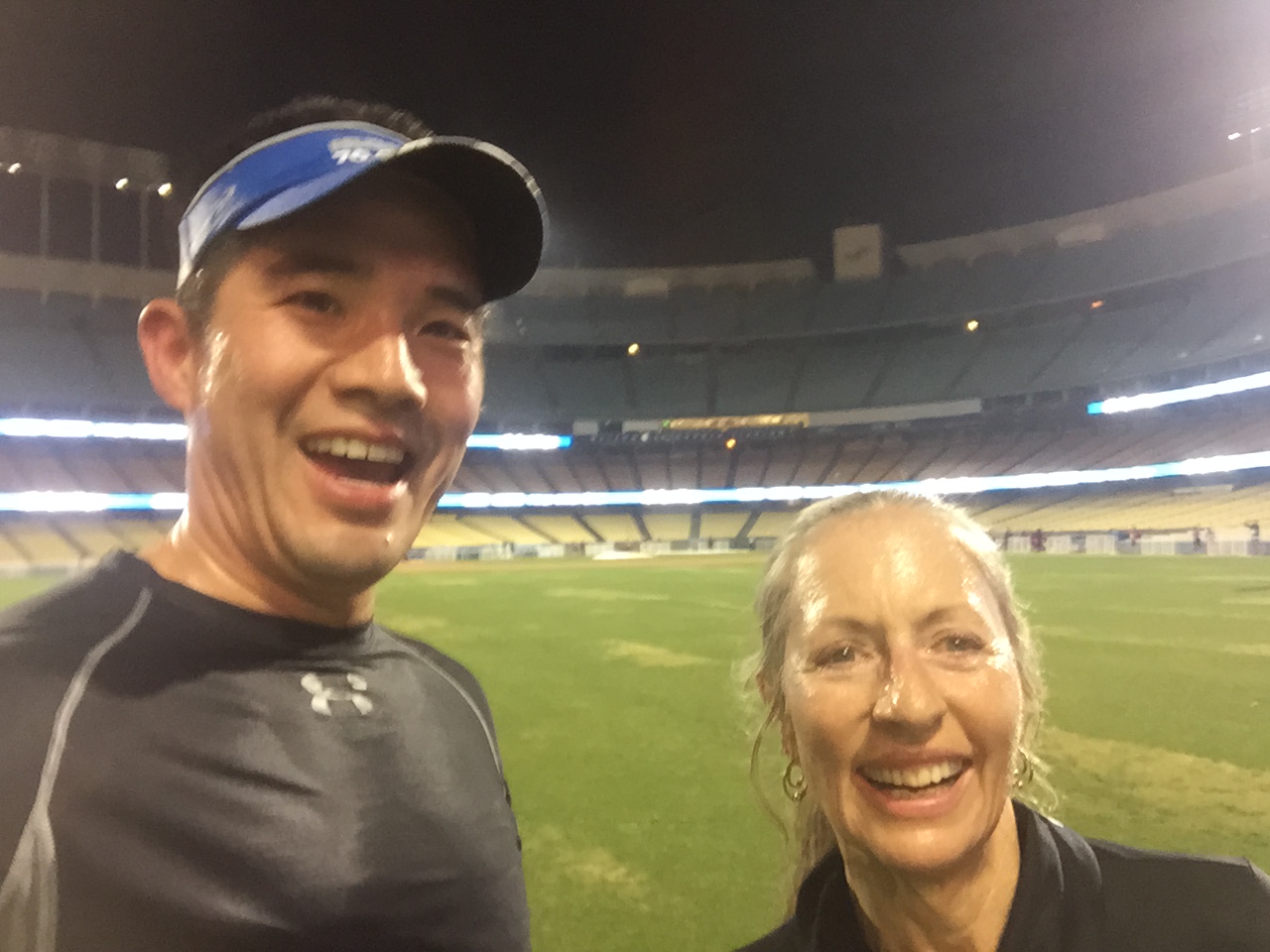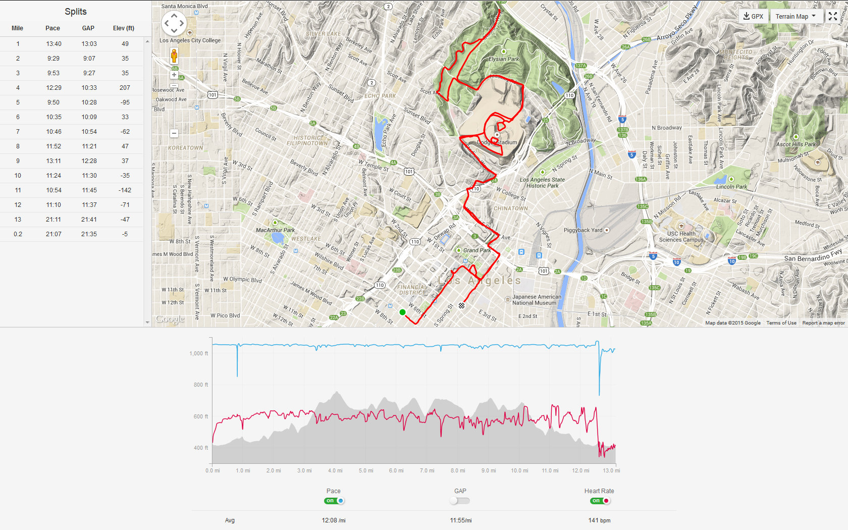 Lynda and I took it as a training hill run. No PR. It was way too hilly. 1,037 ft climbing. We started out running through the skyscrapers and then did an out and back in the 2nd street tunnel. This threw off my Garmin by 0.6 miles. Bummer. I played around with it a bit and ended up messing up the timing too. Double bummer. So, the distance and time were both F’d up. But, the good news in the tunnel, we saw Scott and Nicole on the out and back. We passed Chinatown’s Dragon Gateway and headed north. Hills Hills HILLS. Taiko Drummers at the Dodger Stadium Parking lot. We ran along the edge of the parking lot for some great skyline views of the city. We ran on the inside of Dodger Stadium, that great.