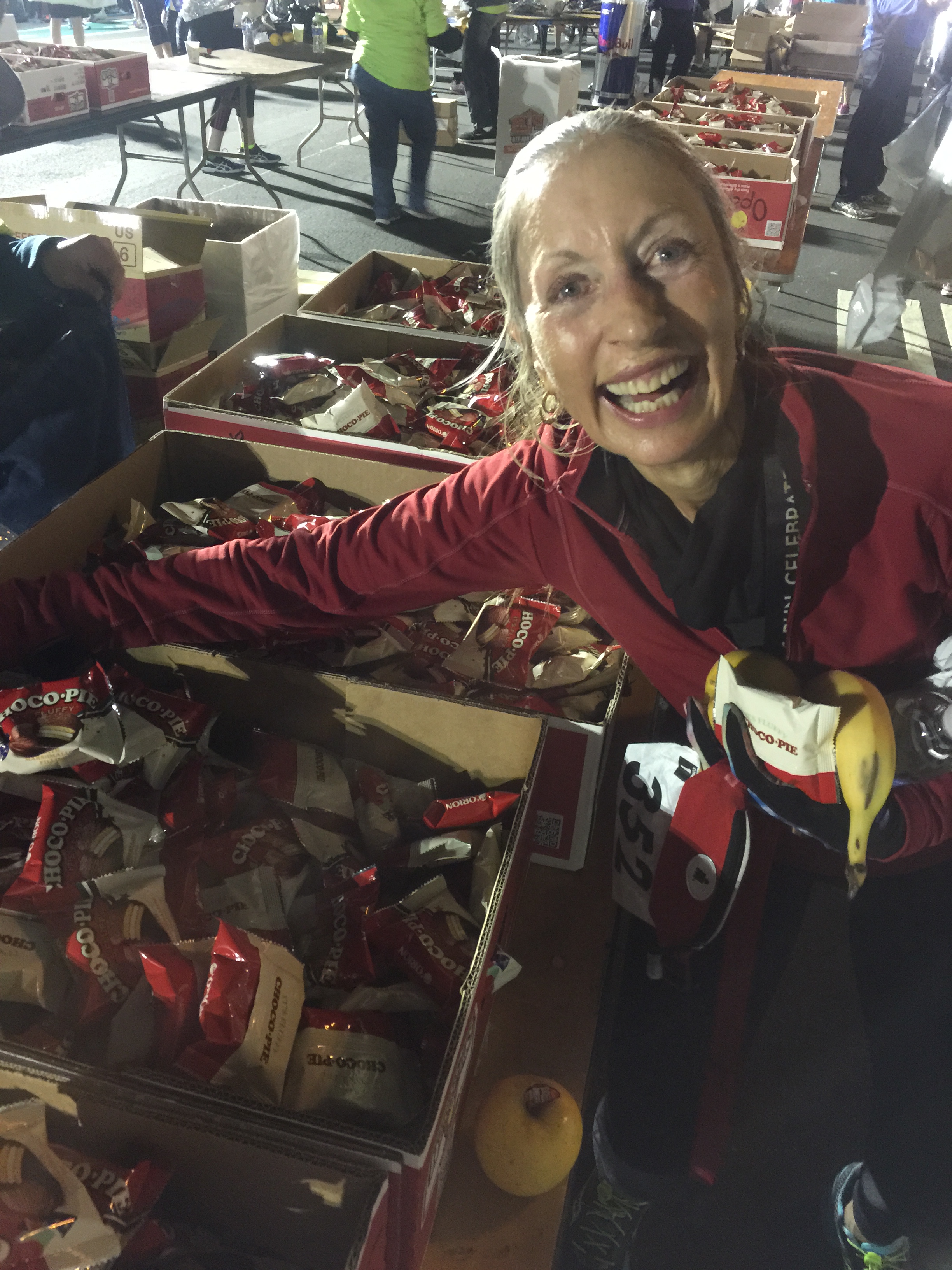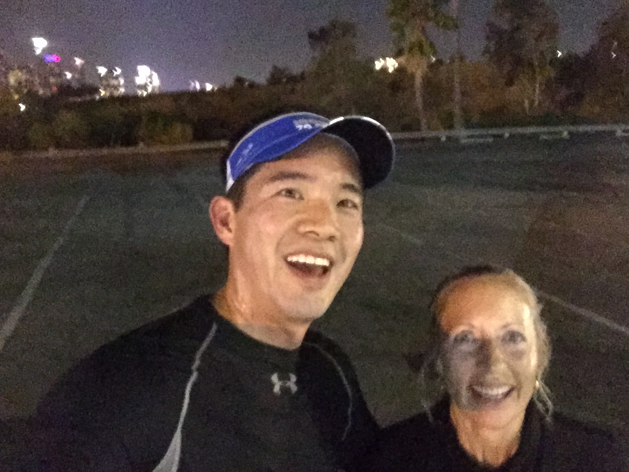 Lisa and Corrina passed us as we headed up to Elysian Park. This was a long out and back, or rather down down down and up up up through the park. It was very well lit up. I felt pretty good through mile 9. Then I bonked. Everything got tired. Lynda was patient and got me some nutritional stuff. I walked and jogged it back. Eyes were tired and closed a bit too.