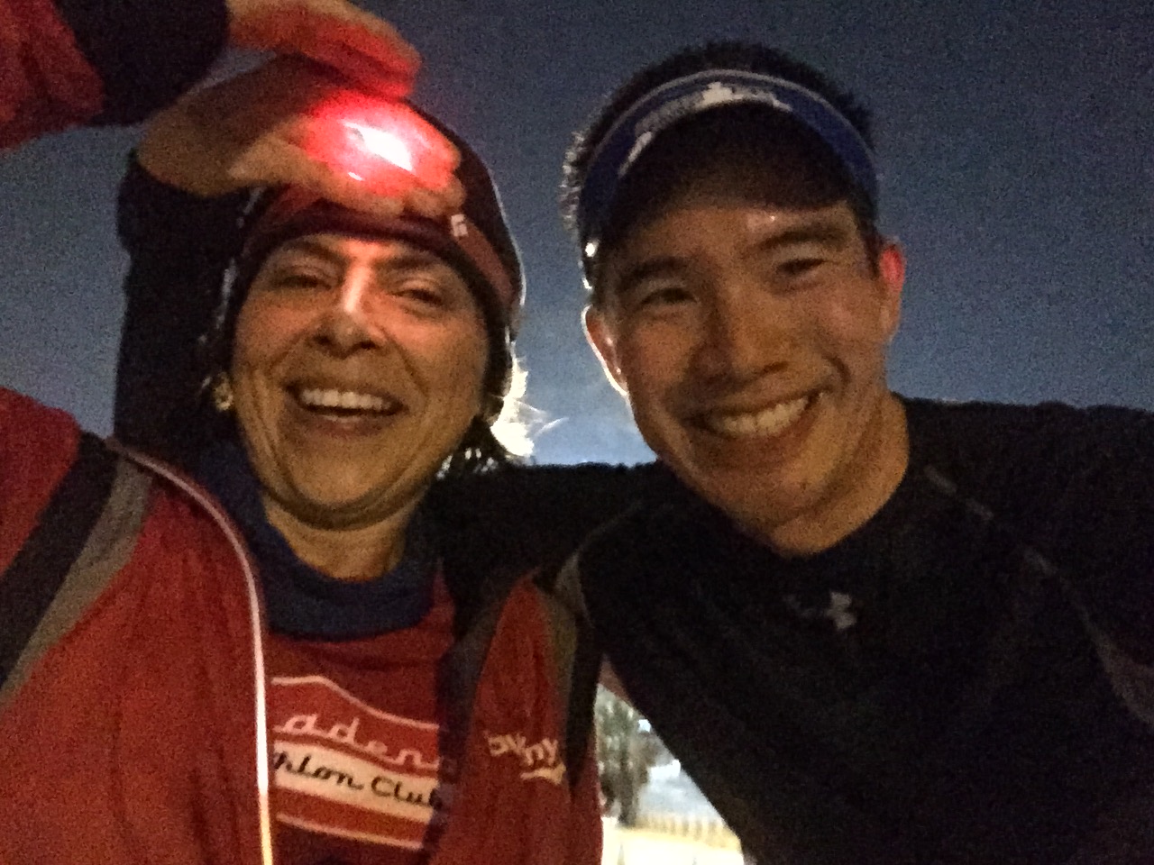 I was pretty much in denial about this race. I promised Lynda I would run this with her, but I was not excited about it. We ran the inaugural race 2012 and I had a pretty bad experience. I froze to death and bonked hard. Since then, the race moved from 9pm start to a 6pm start. Much better. The course also changed from skid row and laps around the Dodger Stadium Parking lot, to more hill top park and better city view. I was also tired from the Resolution Ride earlier this morning. My brain was tired and packed poorly for the race, Lynda made up for my wardrobe errors. Lifesaver.