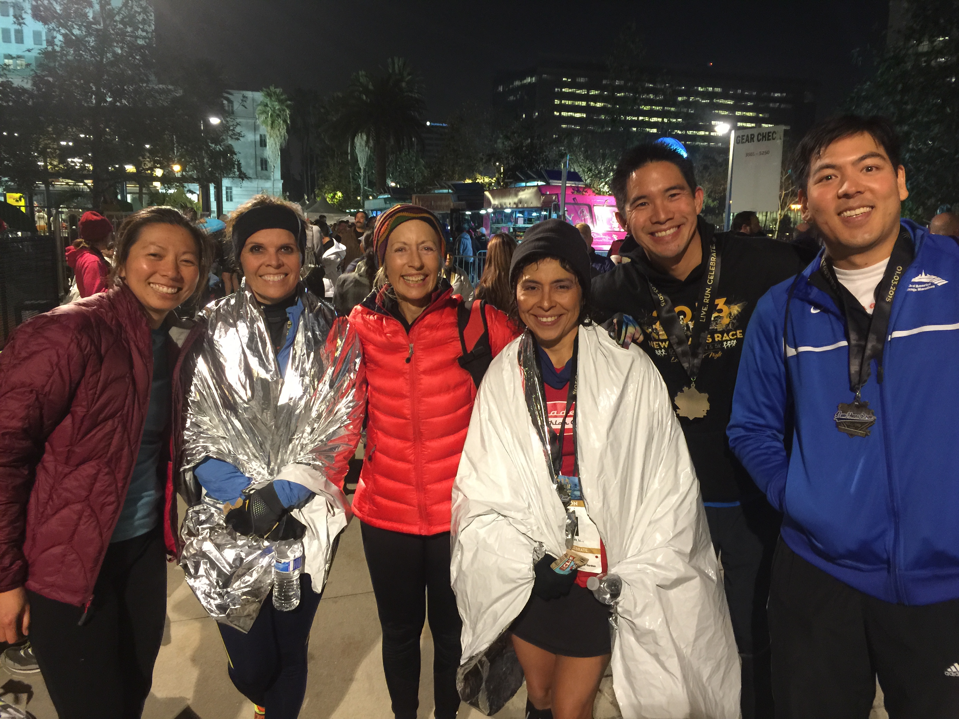 Finish line was at City Hall. Lynda found Choco Pies and was very excited. We saw Amy, Corrina, Lisa, and Todd at Drop Bag Pick up (that was a bit of mess). Gregg finished well before us and was already waiting in line. Space blankets kept us warm while waiting in line. I always use my blue and green duffle, it’s easier for them to find as opposed to the thousands of same black bags. All in all it was a very hard, hilly, race, with some great city views. The weather was cold, but not as bitter cold as a couple years ago. I felt that the Hill Repeats and Track workouts saved me, otherwise it would have been very ugly race again. As we walked back to our car, we stopped for a nice Italian dinner. Scott joined us halfway through. He won his age group! It felt good to sit down and savor the day.