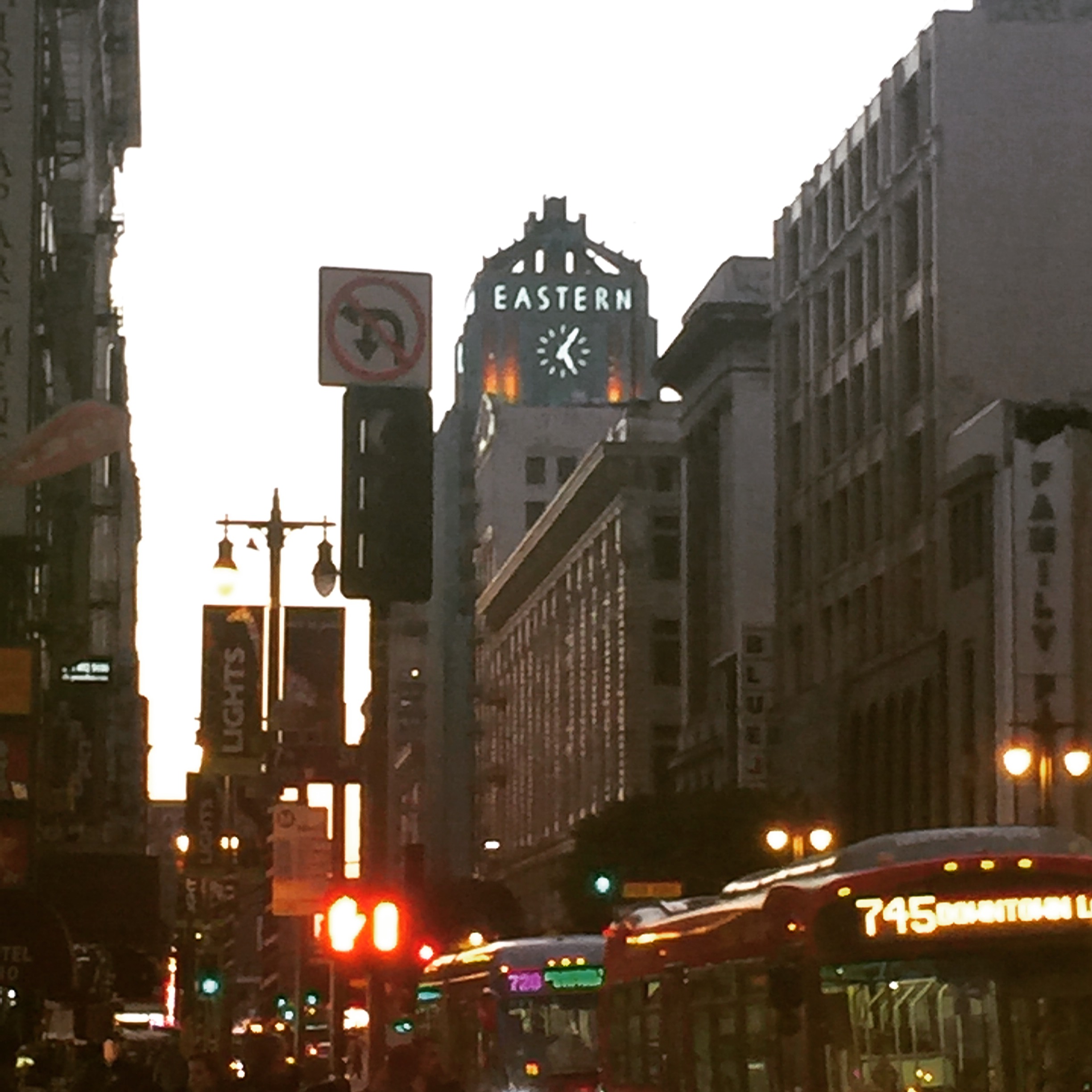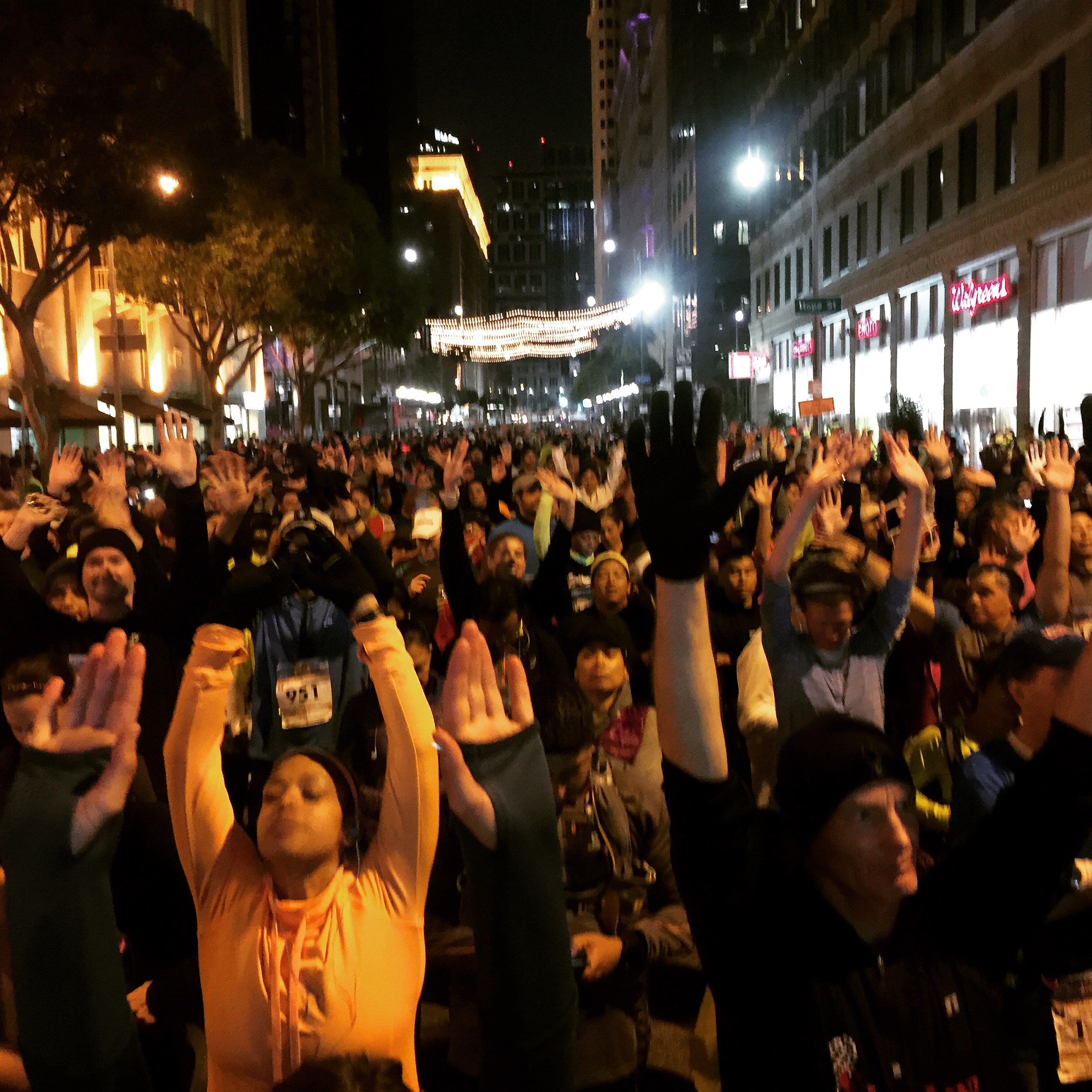 Gregg carpooled me and Lynda to the race downtown LA. I never hang out there. Woah, it’s whole ‘nuther world. Very spotty. Crappy to glitzy by just turning a corner. We parked a few blocks from the finish line and walked to the starting line, which were about 1 mile apart. On the way we saw some DTLA usual sights. Homeless people shouting obscenities, cool old building that have been renovated, and some great restaurants. The starting line was at 7th and Grand. Disco light shows and Loud DJs at the starting line.
