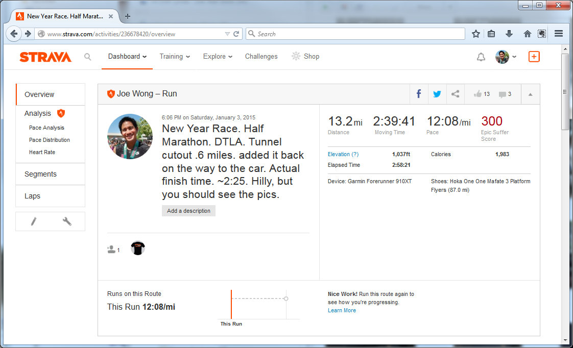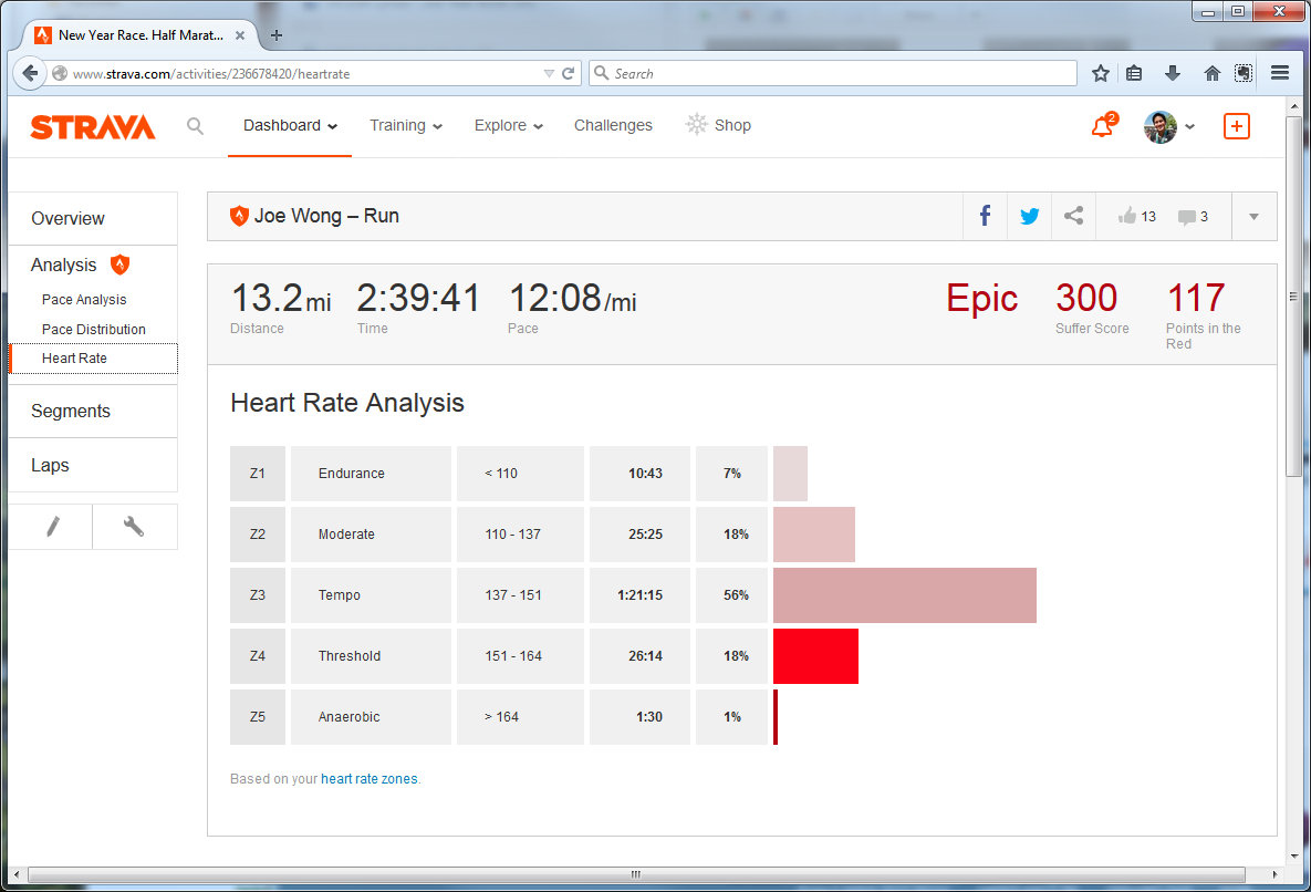 Here’s the Strava data. It’s a bit skewed due the the tunnel dropout and my messing around with the settings. But, I could tell I did some hard work by the heart rate spread. My Mio Link worked well. Just to get a Half Marathon Strava trophy, I turned on my watch walking back to car to make up for the lost 0.6 miles in the tunnel. Ha! Take that tunnel.