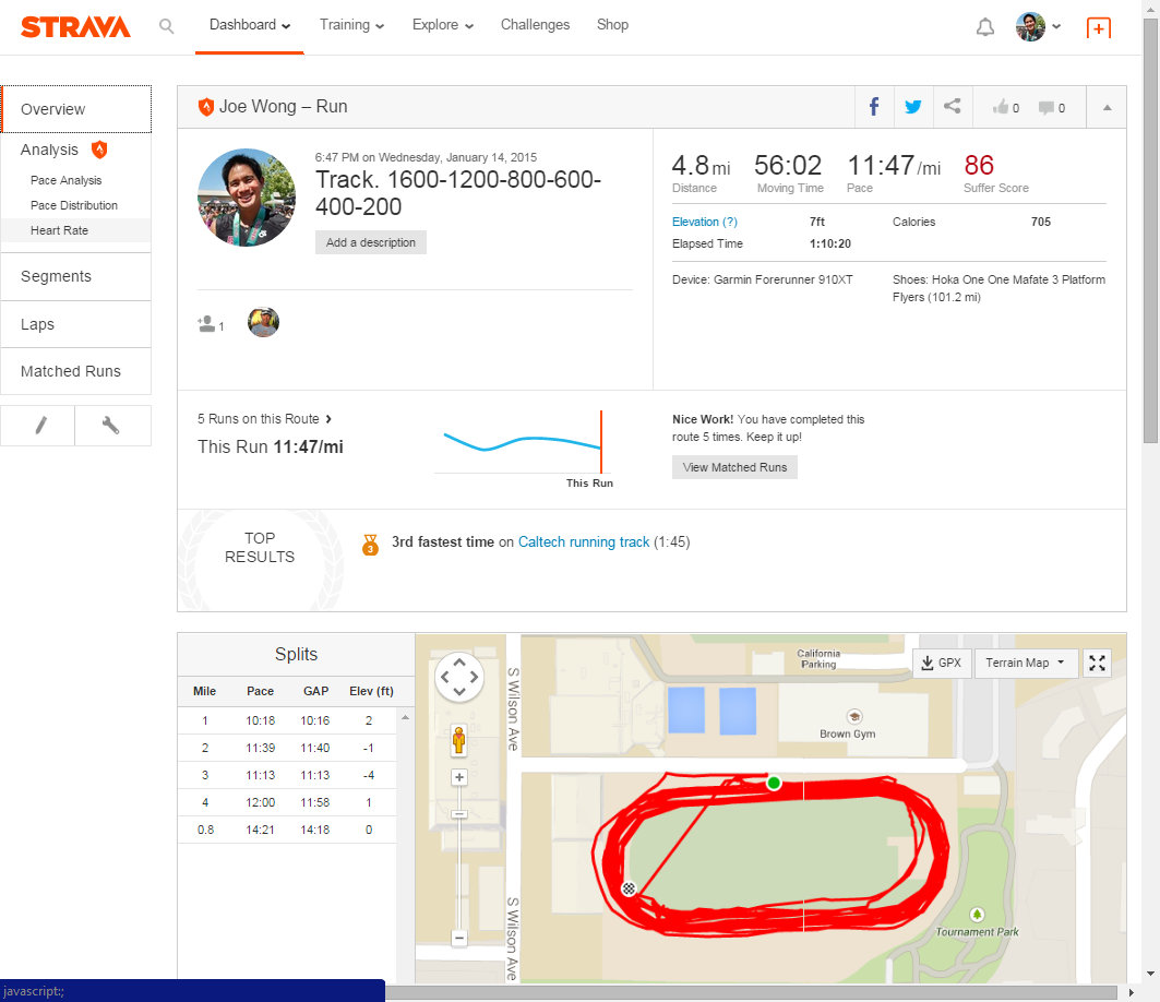 4.8 miles, 56:02 moving time. Track workout with Los Feliz Flyers at CalTech.