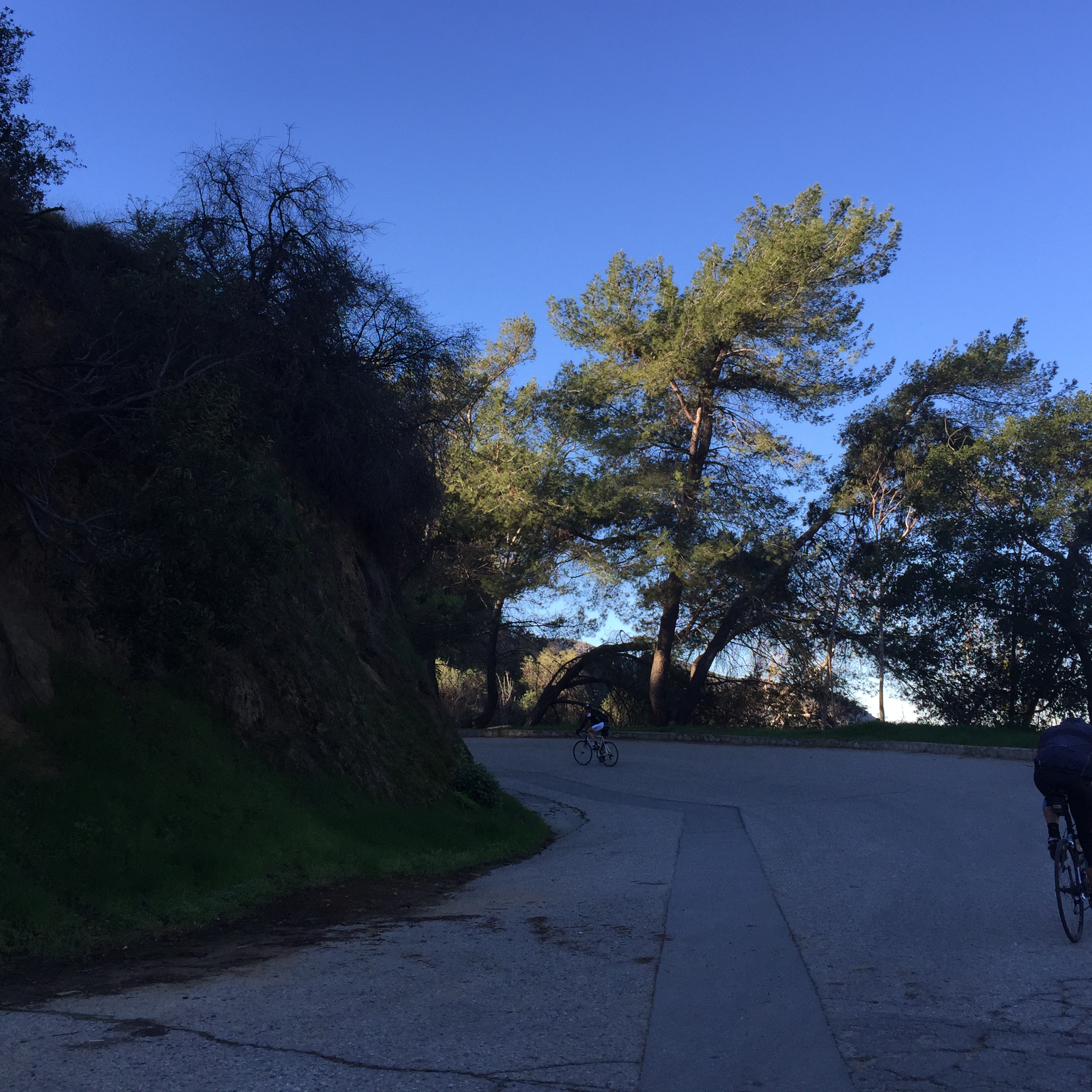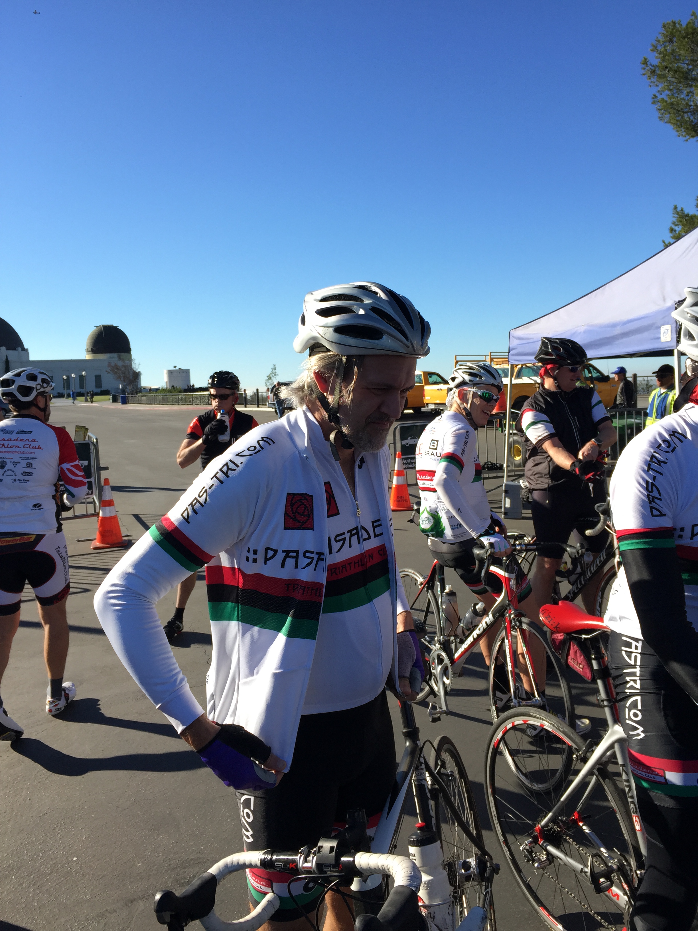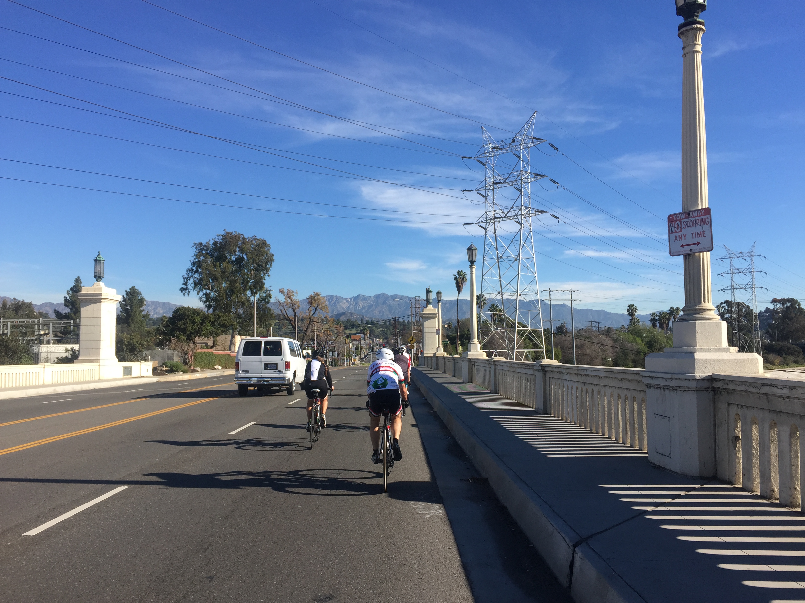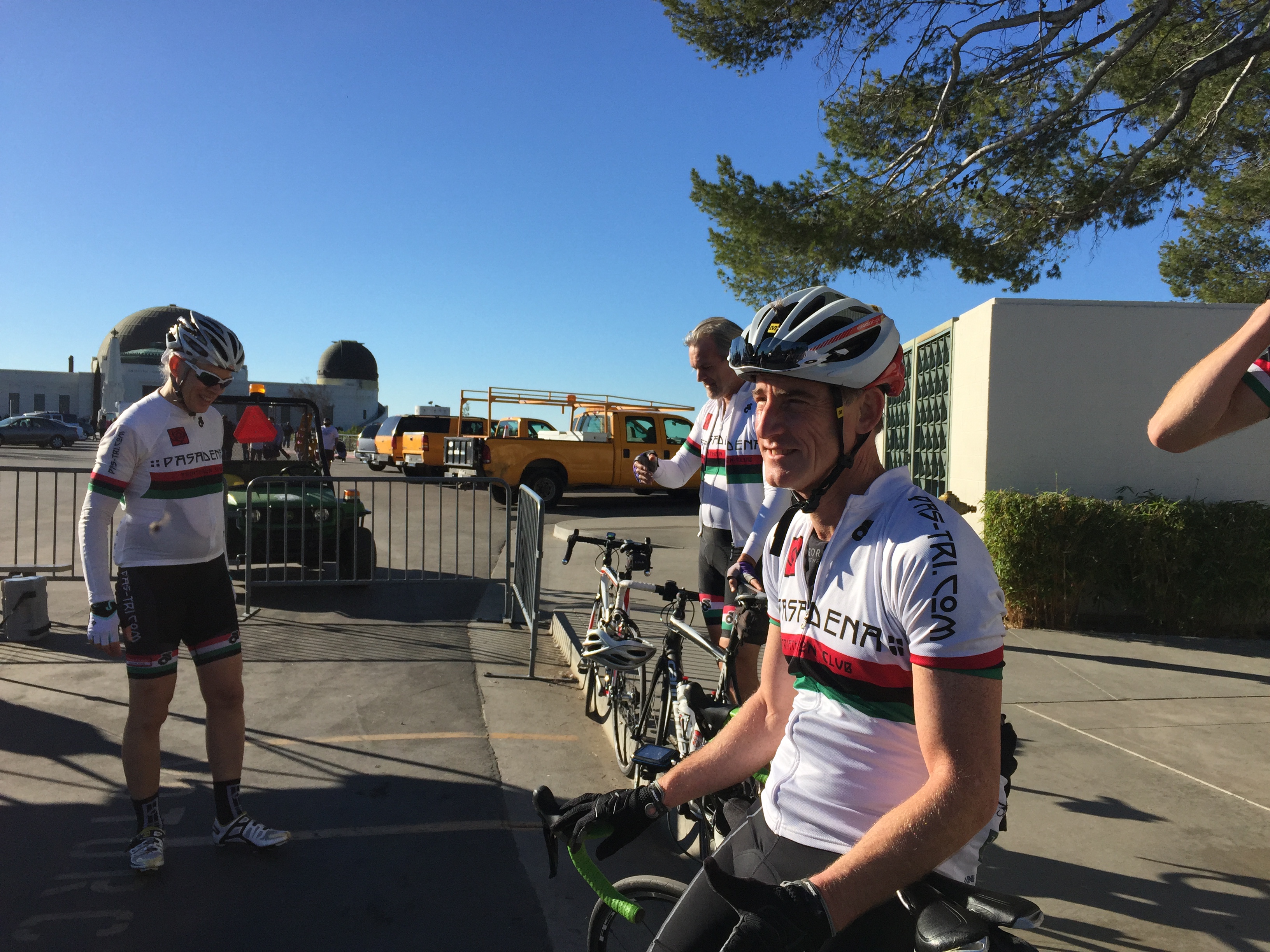 PTC met at Jones Coffee in Pasadena. The three groups stayed together through Eagle Rock, then split up naturally by speed. Bryan and A-group sped way ahead, Lynda and B-group rolled on moderately, and Elizabeth and the Coached ride motored along. Gorgeous day around LA, as you’ll see in the pics. This should really make the snow kids back East envious. Rolling through Glendale along Kenneth Road where I grew up, we passed about a block from my mom and dad’s house. We turned south on Sonora to Riverside Drive, where we entered the backside of Griffith Park. We passed Travel Town with full size train cars. The climb up the backside has a great view of the San Fernando Valley, with Burbank in the foreground. At the top of the ridge, we stopped for pictures with the Hollywood sign and views of the Griffith Observatory and downtown LA and views of the Westside, Century City, Westwood and Santa Monica. A-group added a down and back and met us at the Observatory. We rolled through the Hollywood Hills, down a sneaky trail to get back to Griffith Park without any traffic. We picked up the LA River trail and headed south next to the 5 freeway. We took Fletcher back to Eagle Rock and La Loma to Pasadena. Post ride coffee at Jones. Ahhh.