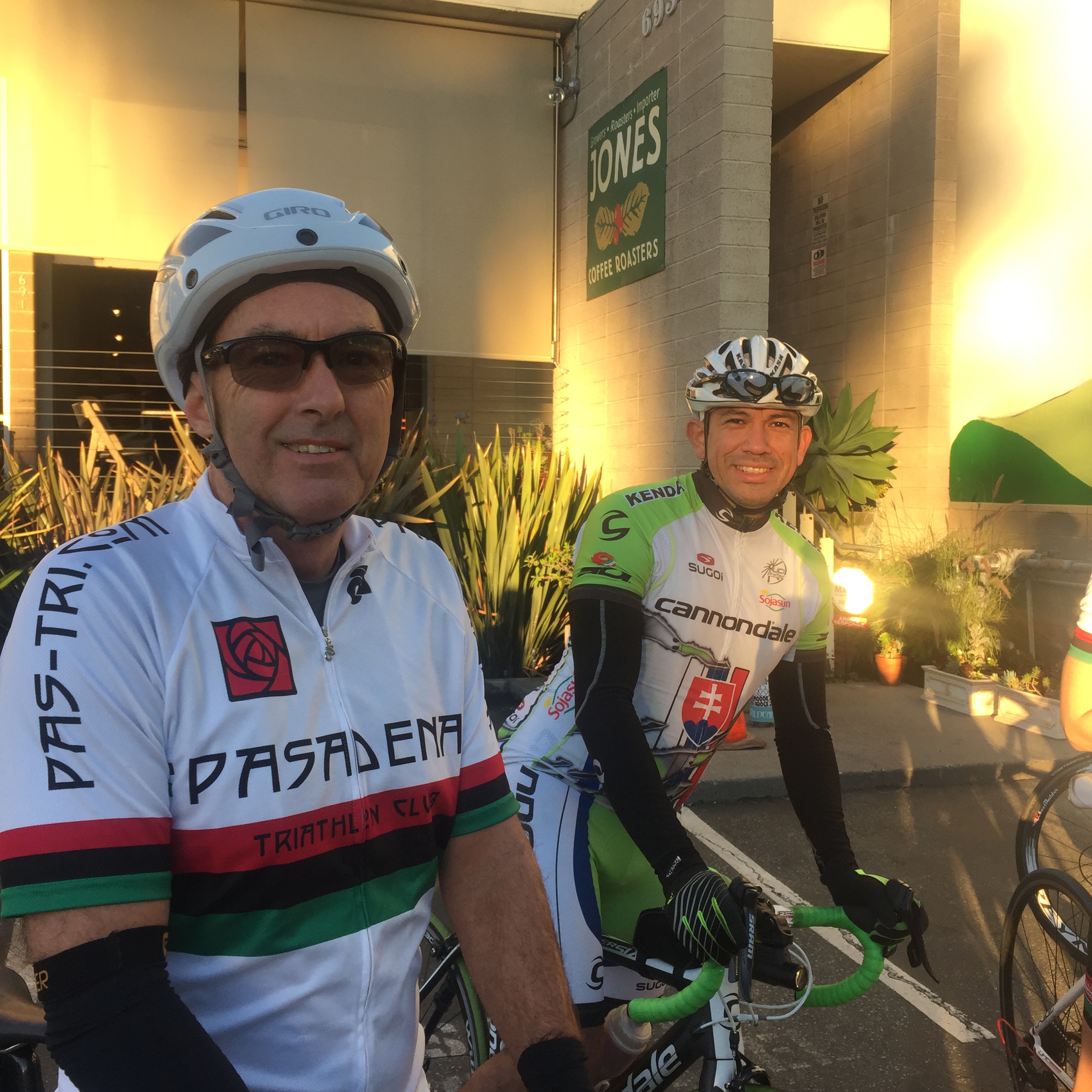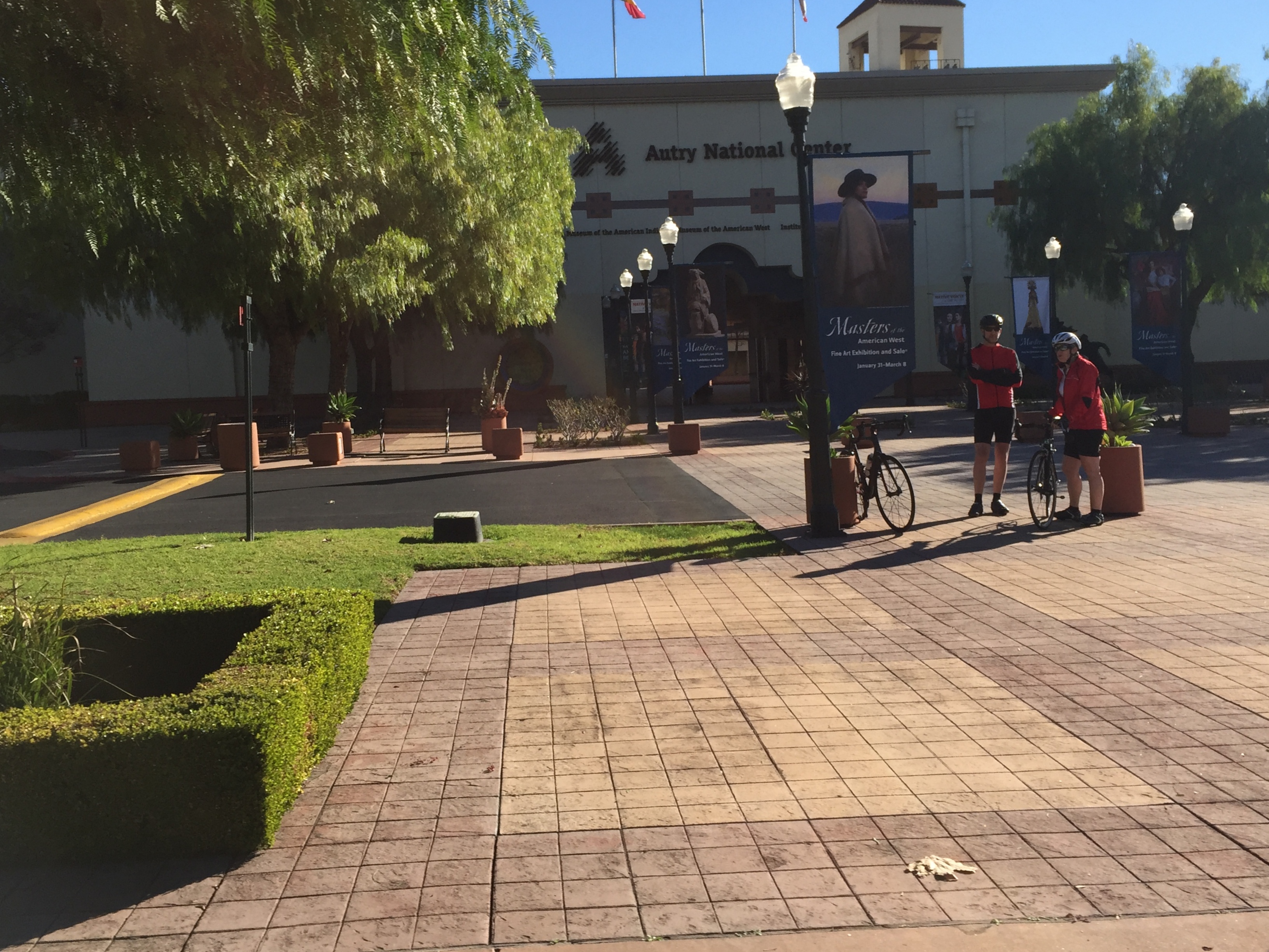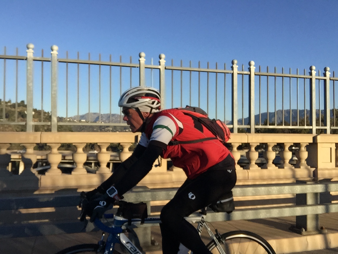 PTC met at Jones Coffee in Pasadena. The three groups stayed together through Eagle Rock, then split up naturally by speed. Bryan and A-group sped way ahead, Lynda and B-group rolled on moderately, and Elizabeth and the Coached ride motored along. Gorgeous day around LA, as you’ll see in the pics. This should really make the snow kids back East envious. Rolling through Glendale along Kenneth Road where I grew up, we passed about a block from my mom and dad’s house. We turned south on Sonora to Riverside Drive, where we entered the backside of Griffith Park. We passed Travel Town with full size train cars. The climb up the backside has a great view of the San Fernando Valley, with Burbank in the foreground. At the top of the ridge, we stopped for pictures with the Hollywood sign and views of the Griffith Observatory and downtown LA and views of the Westside, Century City, Westwood and Santa Monica. A-group added a down and back and met us at the Observatory. We rolled through the Hollywood Hills, down a sneaky trail to get back to Griffith Park without any traffic. We picked up the LA River trail and headed south next to the 5 freeway. We took Fletcher back to Eagle Rock and La Loma to Pasadena. Post ride coffee at Jones. Ahhh.
