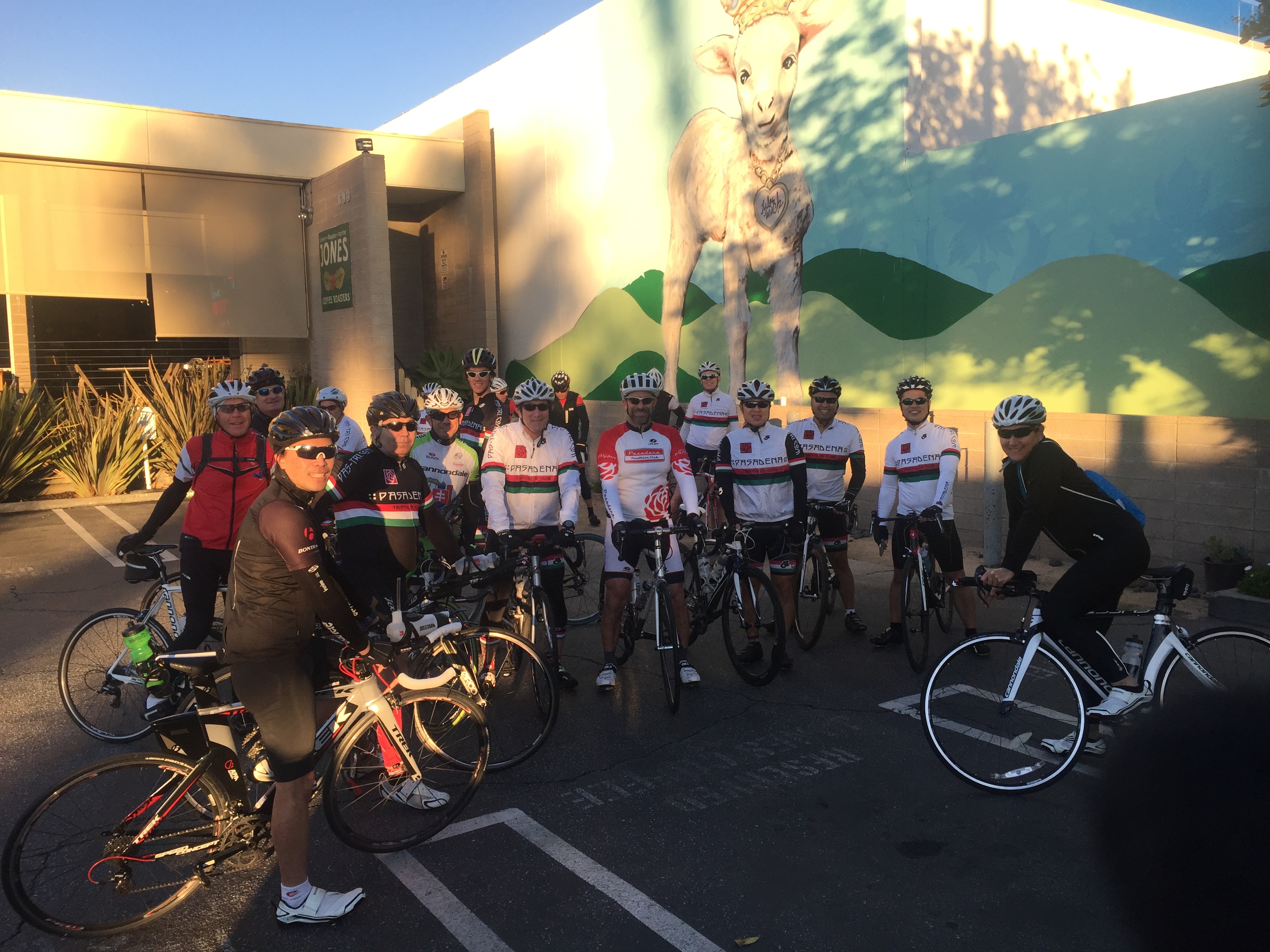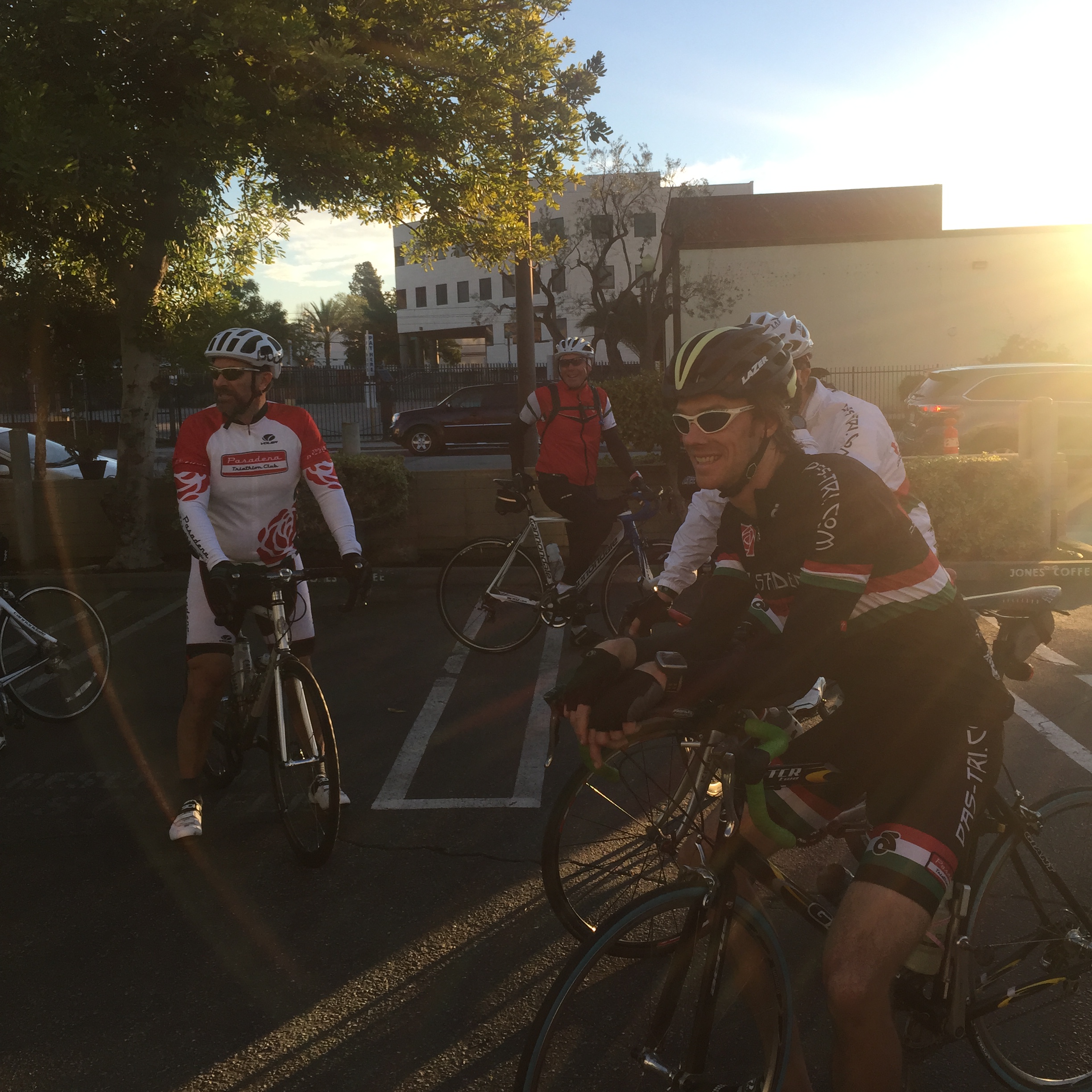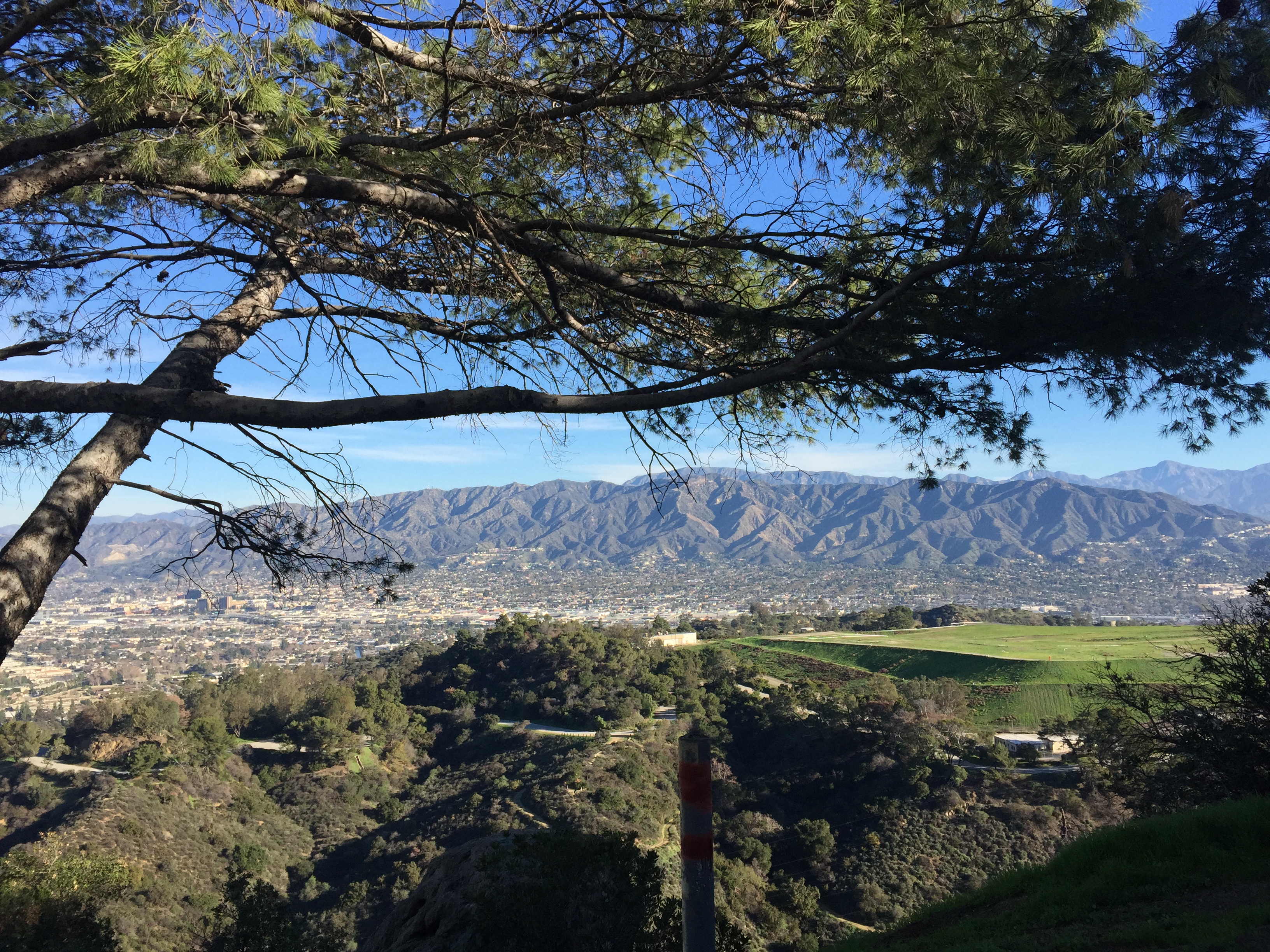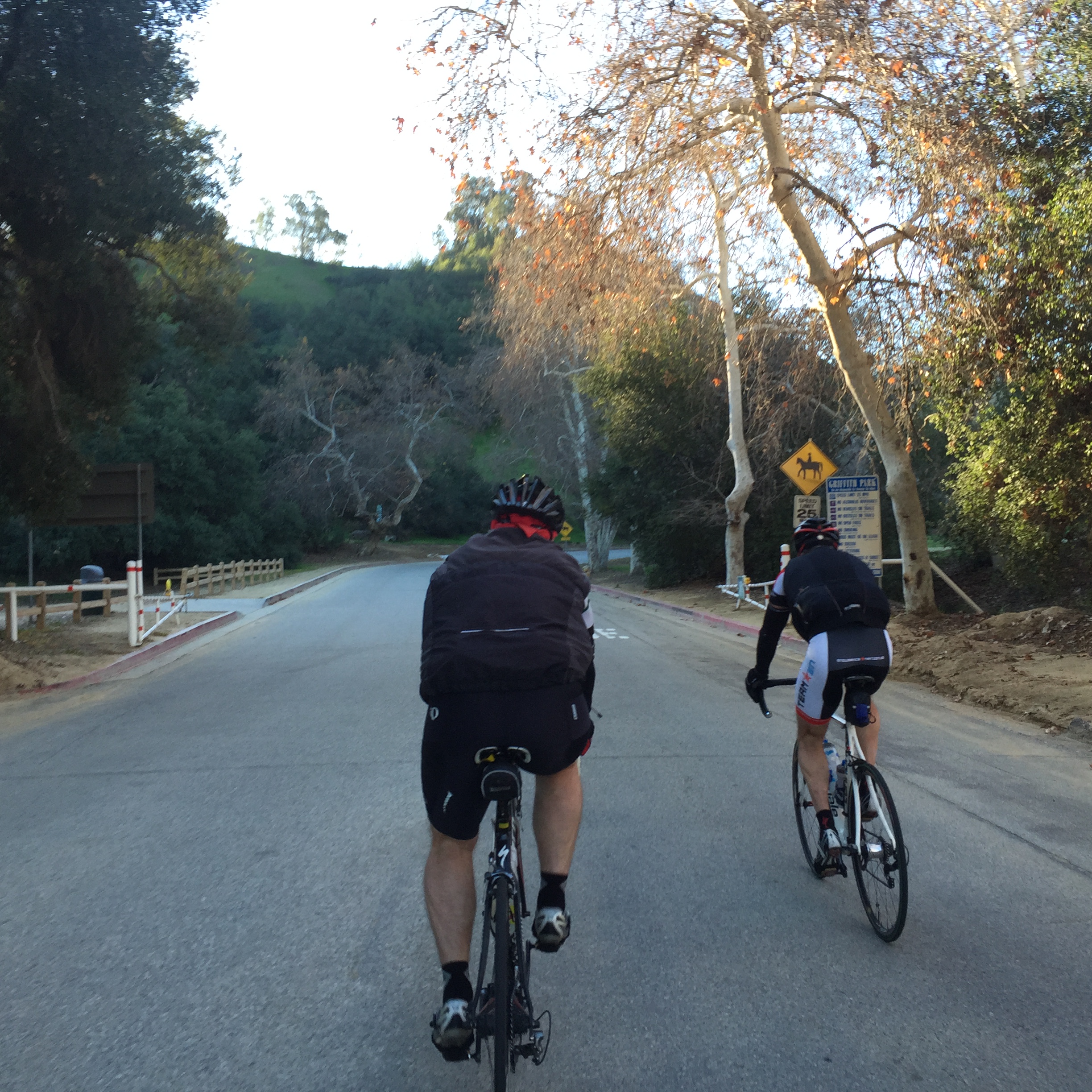 PTC met at Jones Coffee in Pasadena. The three groups stayed together through Eagle Rock, then split up naturally by speed. Bryan and A-group sped way ahead, Lynda and B-group rolled on moderately, and Elizabeth and the Coached ride motored along. Gorgeous day around LA, as you’ll see in the pics. This should really make the snow kids back East envious. Rolling through Glendale along Kenneth Road where I grew up, we passed about a block from my mom and dad’s house. We turned south on Sonora to Riverside Drive, where we entered the backside of Griffith Park. We passed Travel Town with full size train cars. The climb up the backside has a great view of the San Fernando Valley, with Burbank in the foreground. At the top of the ridge, we stopped for pictures with the Hollywood sign and views of the Griffith Observatory and downtown LA and views of the Westside, Century City, Westwood and Santa Monica. A-group added a down and back and met us at the Observatory. We rolled through the Hollywood Hills, down a sneaky trail to get back to Griffith Park without any traffic. We picked up the LA River trail and headed south next to the 5 freeway. We took Fletcher back to Eagle Rock and La Loma to Pasadena. Post ride coffee at Jones. Ahhh.