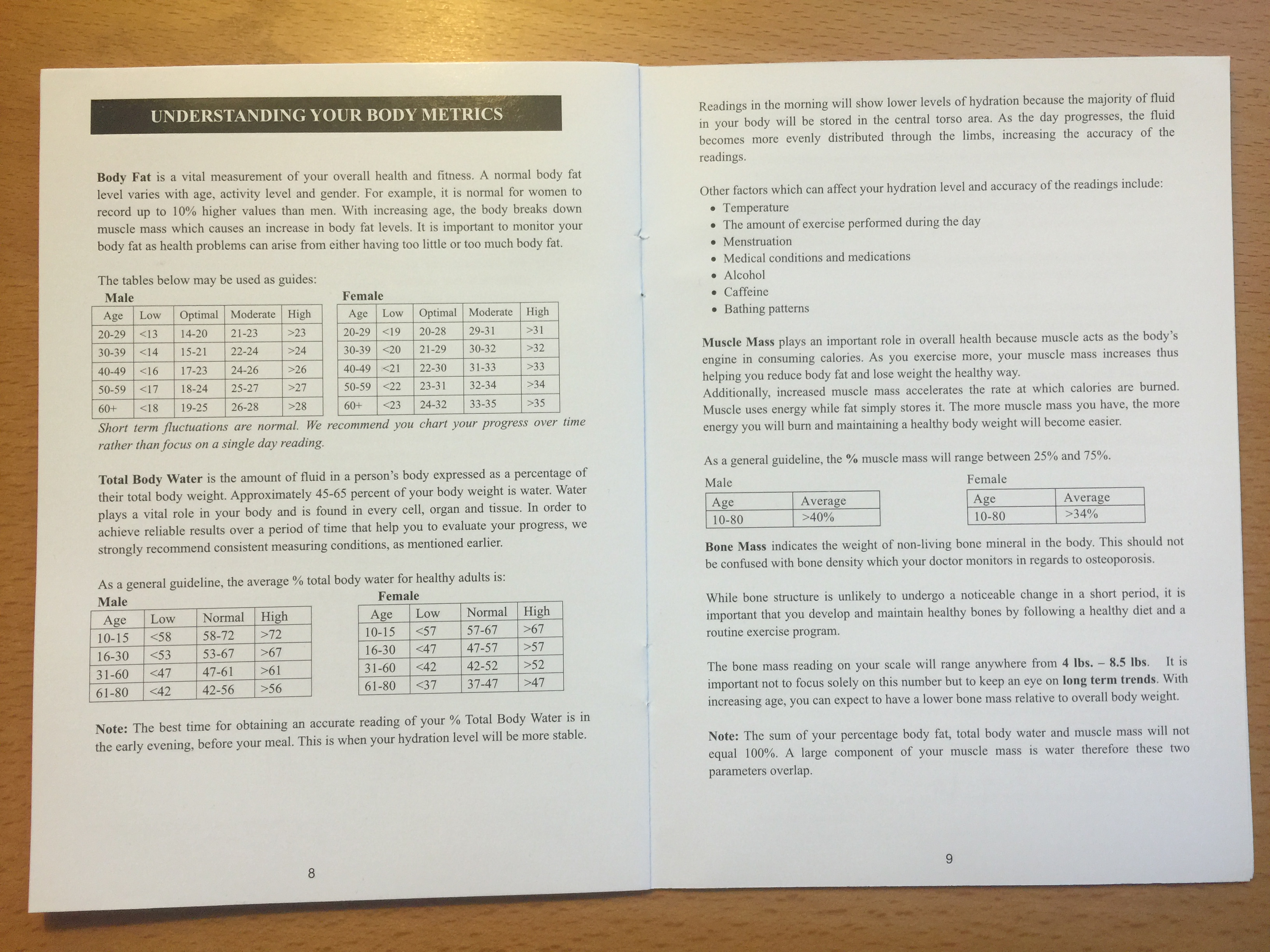 To receive the most accurate body fat, total body water, muscle mass, and bone mass measurement, weight yourself in the evening, before eating.