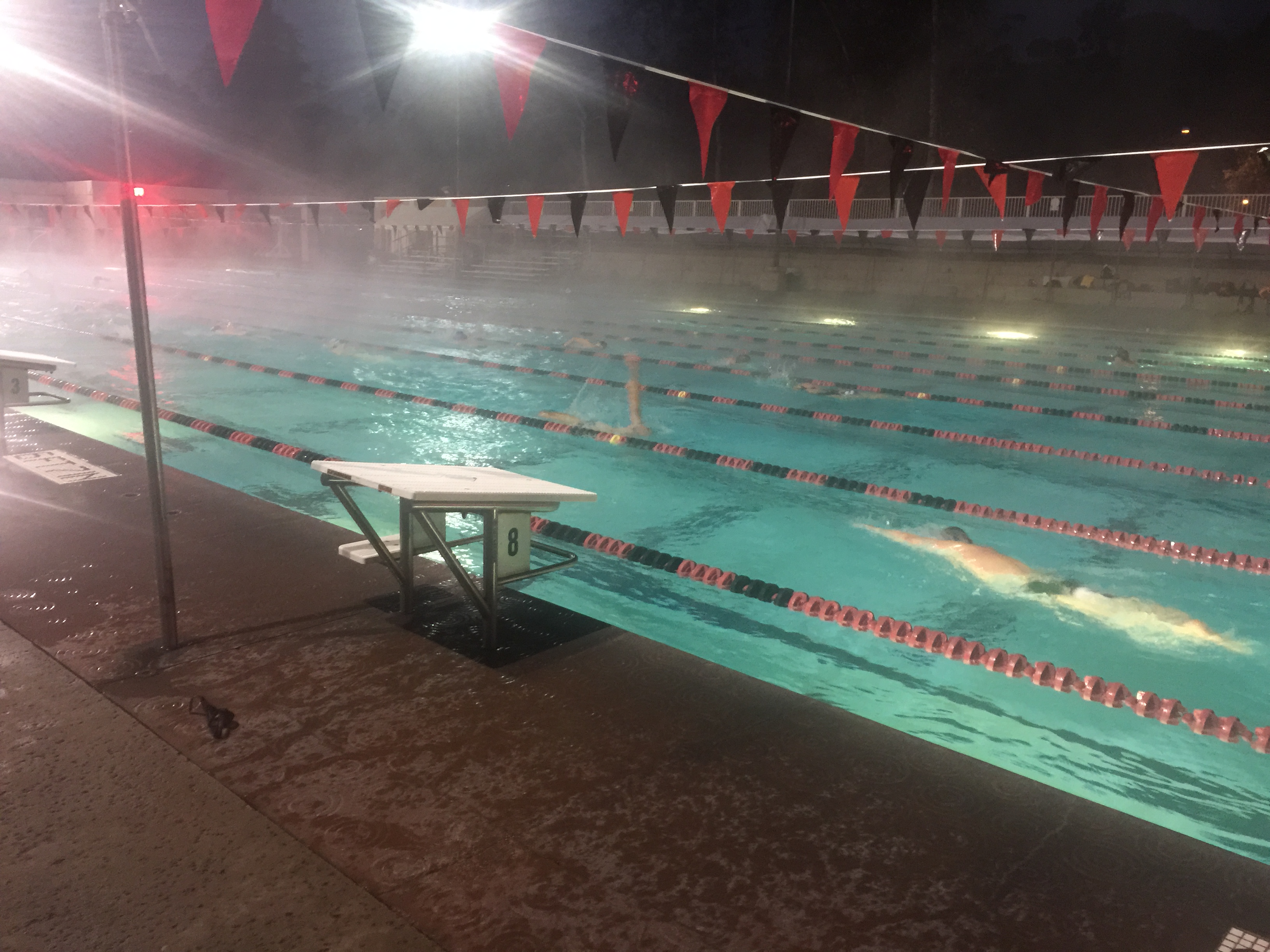 Rose Bowl Aquatic Center. Dark and cloudy. Warm Water.