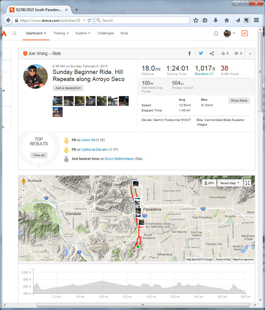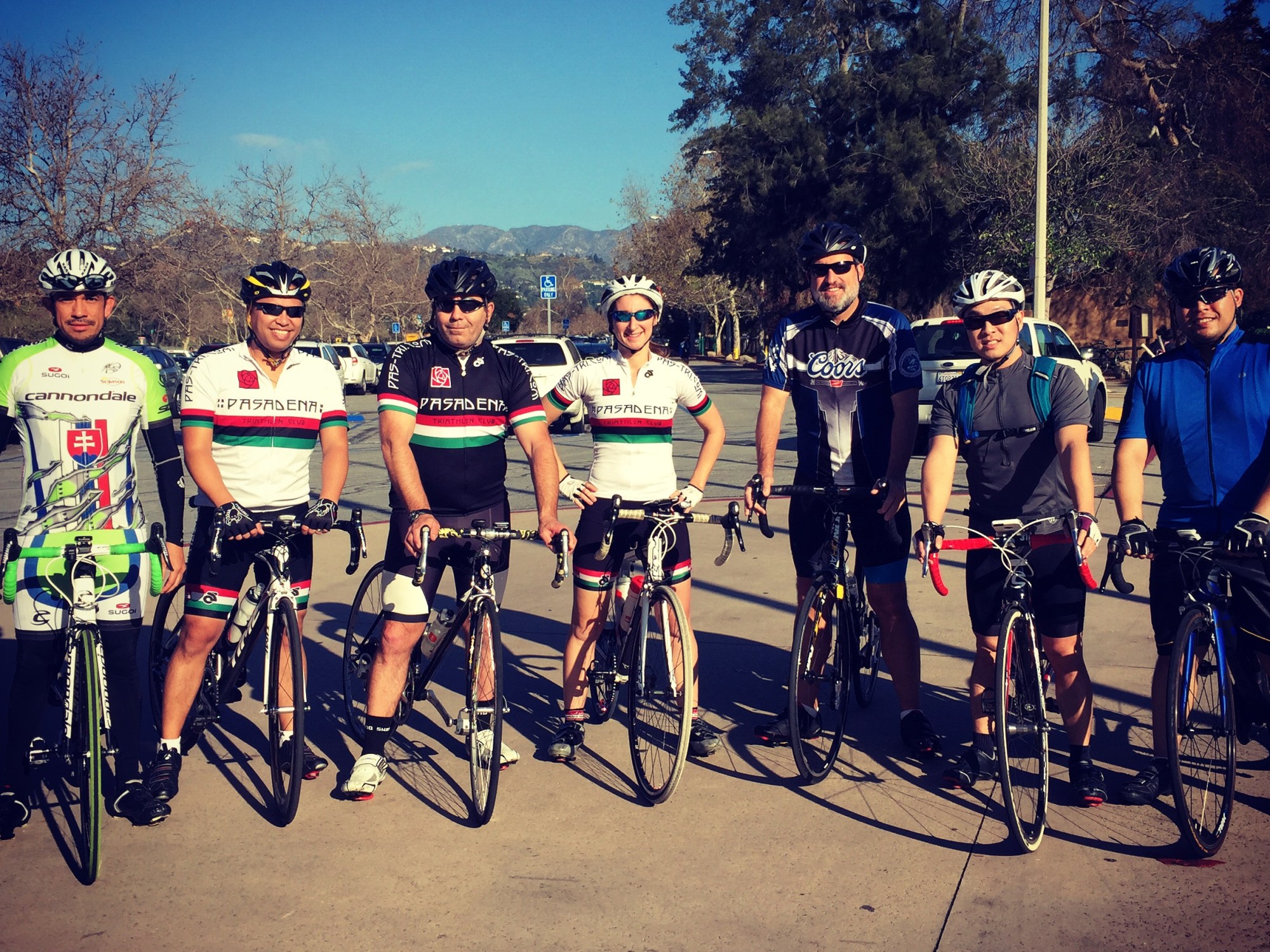 Warm up lap around Rose Bowl. Tons of people out early for the Swap Meet. Traffic was a little nuts. We headed south down Arroyo and went up and down the hills. Up California, Down Bradford, Up Bellafountaine, Down Madeline. Extra credit up Arbor! Some of the guys are returning cyclists and some are new riders. Instruction on descending and applying brakes.