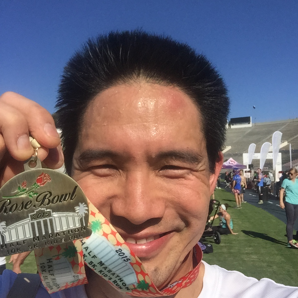 This was half road race and half trail race. Difficult and NOT flat. The race started at the Rose Bowl stadium and headed south along the Arroyo Seco to South Pasadena. We crossed the bridge and came back up to the stadium. We ran up the east side along the Brookside Golf Course. We headed up the trails, up a very steep trail to Devil’s Gate Dam. We ran up the Hahamongna Watershed Park to the end of the JPL parking lot. The trail looped around the park and back down the Dam and around the west side of the Brookside Golf Course. The race ended at the 50 yard line in the Rose Bowl. It was great.