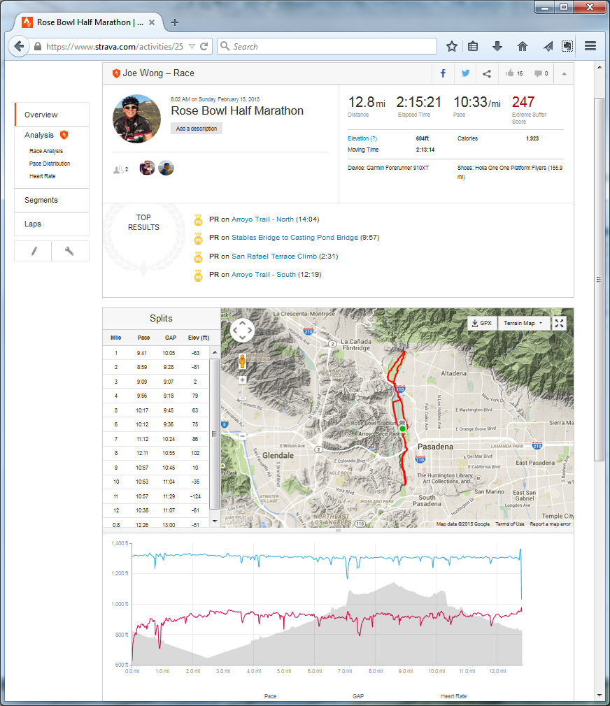 Officially 13.1 miles, 2:13, (garmin 12.8 mi, 2:15:21 moving time, 6 trophies, 247 suffer score)