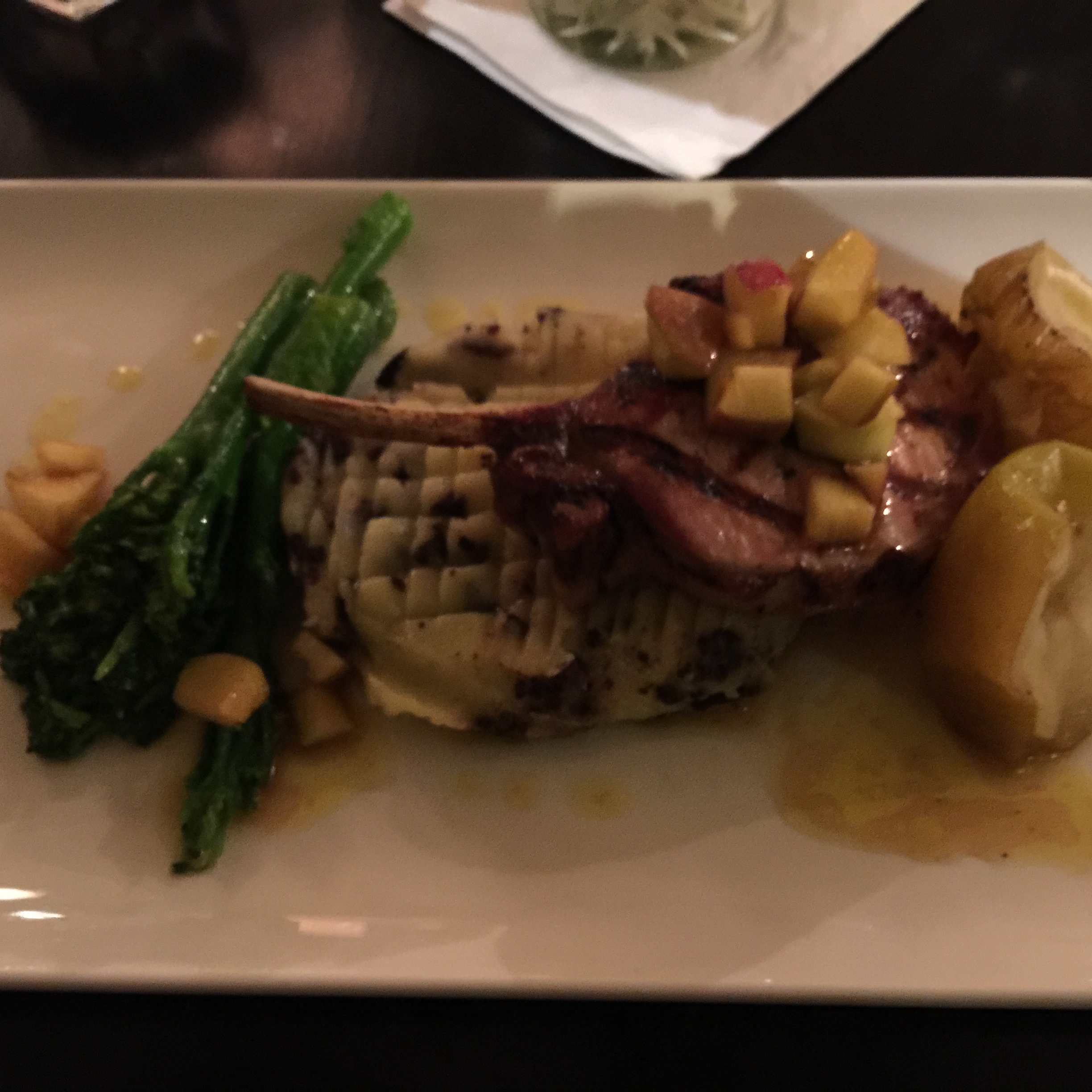 Showered. That felt good. A couple days overdue. Nice dinner nearby at Browns. Mint julep. Pork chop, poached apple, broccoli, and mashed potatoes. People warned me the food would be bland, but I had great food the whole time.