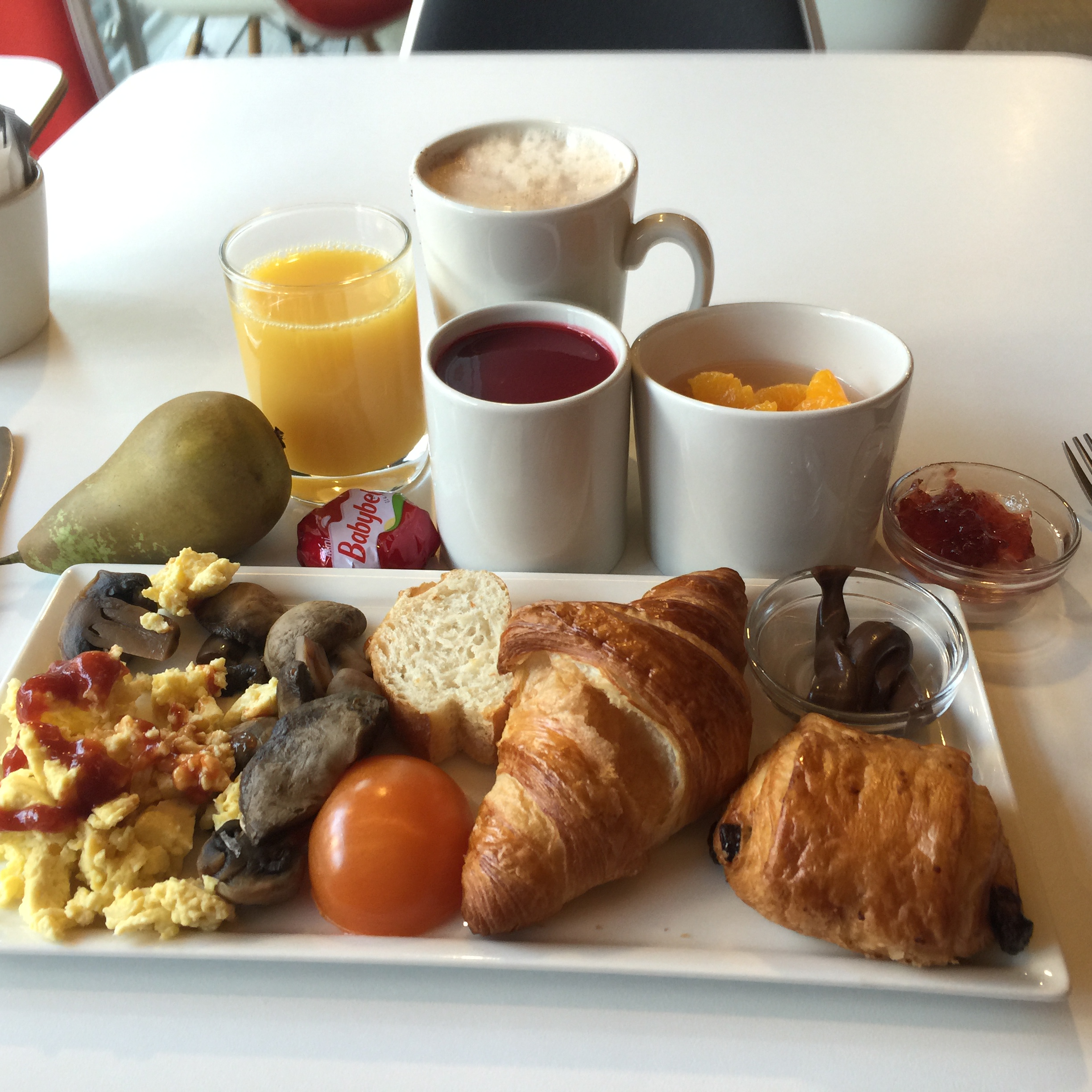 The hotel breakfast at Ibis was a yummy French breakfast. Eggs, croissant, Nutella, yogurt with raspberry puree, fresh fruits, juices, and latte.