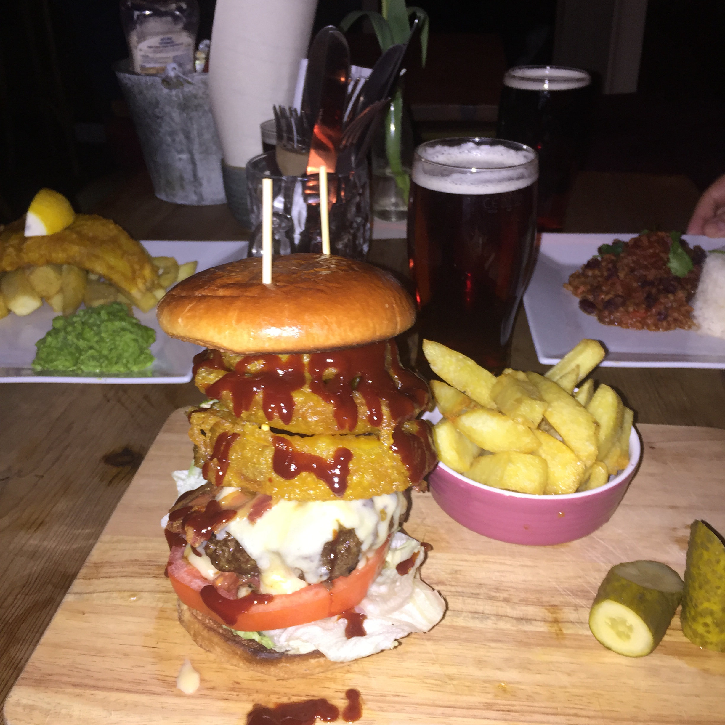 Dinner in Brighton was a traditional English pub with a milehigh burger. The beer was from a local brewery that is older than America. Delicious.