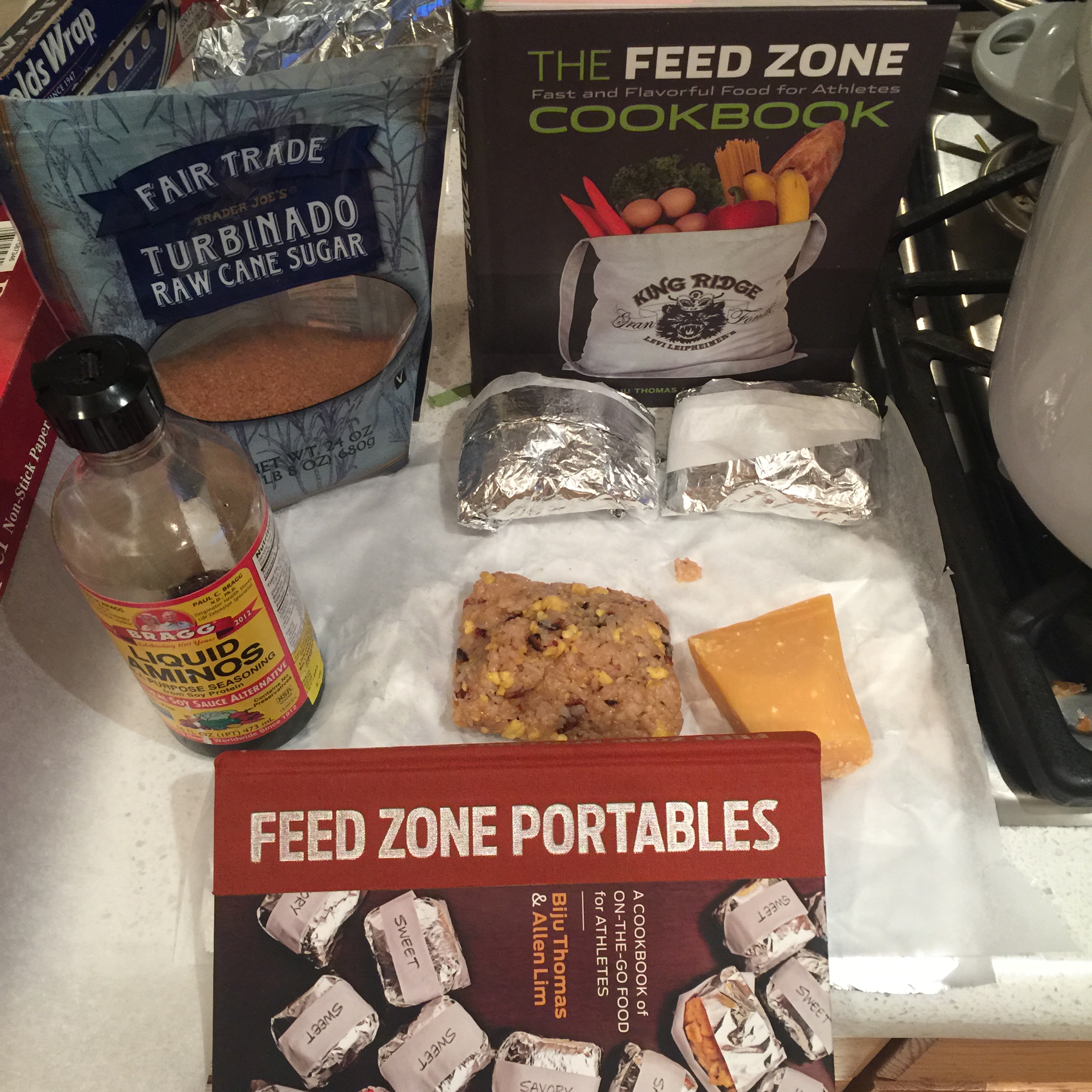 Feed Zone Portables. I made the savory rice cakes. Scrambled eggs, bacon, gouda cheese, liquid amino acids, and turbinado raw cane sugar. Just like the pros on the Tour, I wrapped the cakes in parchment paper and foil. Mulholland Challenge is 120 miles, 13,900 ft of climbing. It’s a long day and my tummy needs real food to make it through. Goos and waffles won’t cut for a